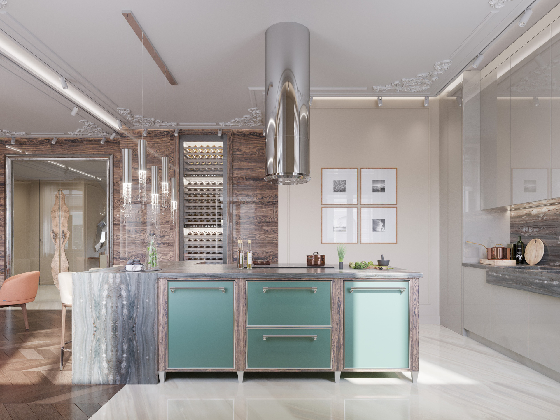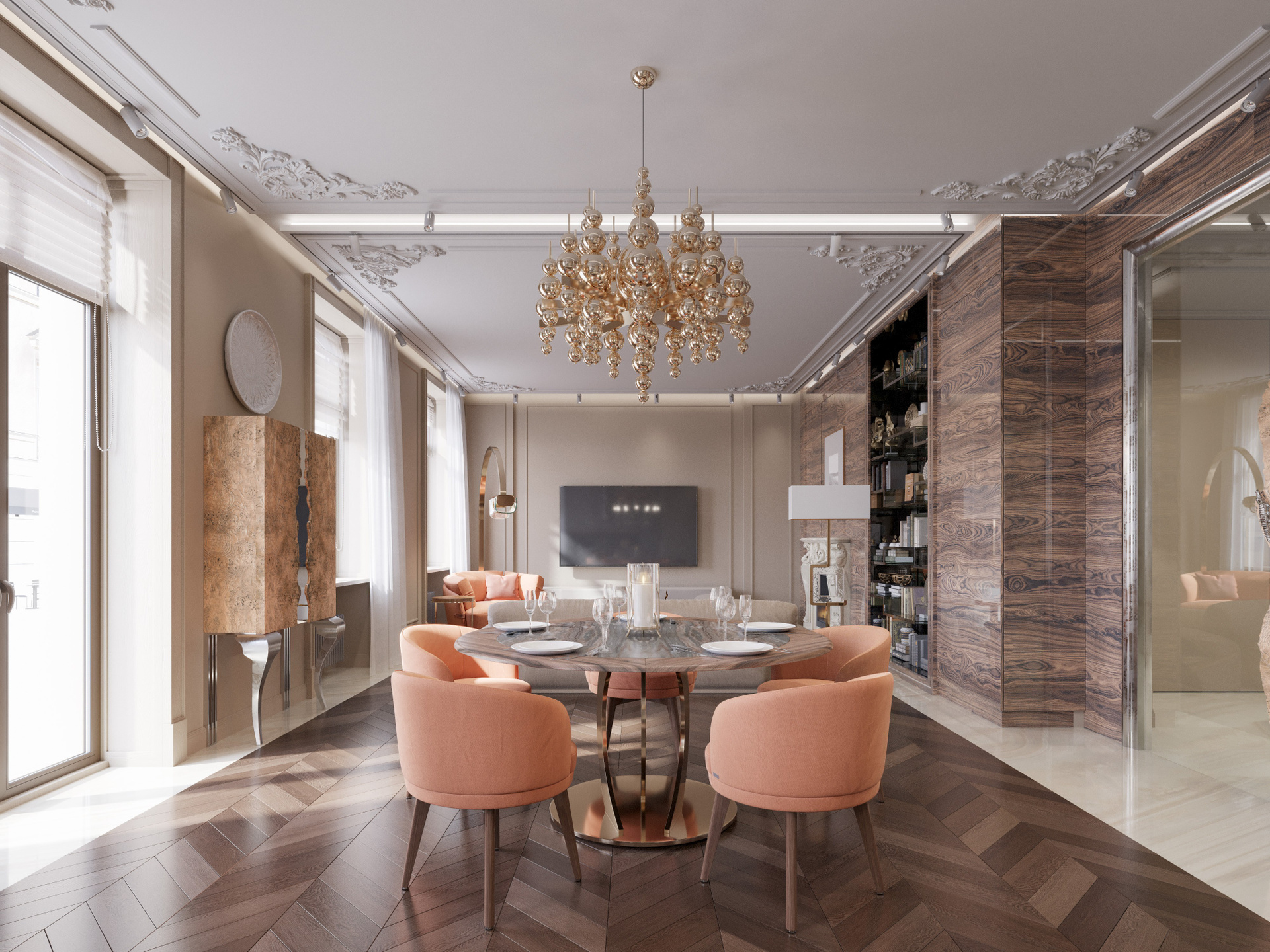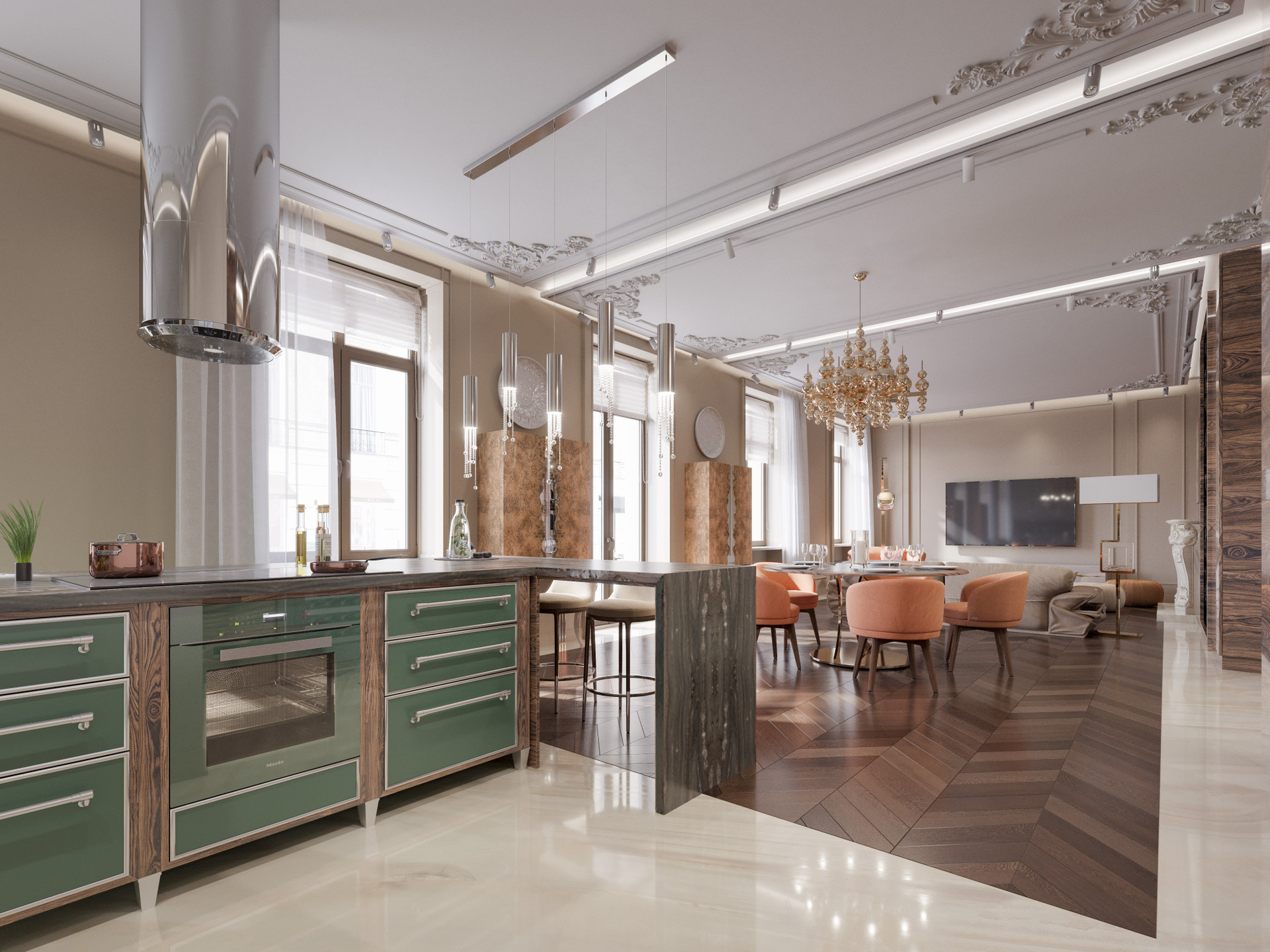 Общее пространство объединяет несколько функциональных зон, оставаясь цельным благодаря паркету «ёлка» и дереву тёплого оттенка. Столовая выделена круглым столом с каменной столешницей и выразительной золотистой люстрой, создающей центр композиции. Кухня оформлена насыщенным древесным рисунком, зелёными фасадами и крупной островной зоной из камня. Мягкая мебель в персиковых и кремовых оттенках формирует гармоничный визуальный баланс. Благодаря детальной 3D визуализации в Corona Renderer полностью раскрываются текстуры и глубина материалов.