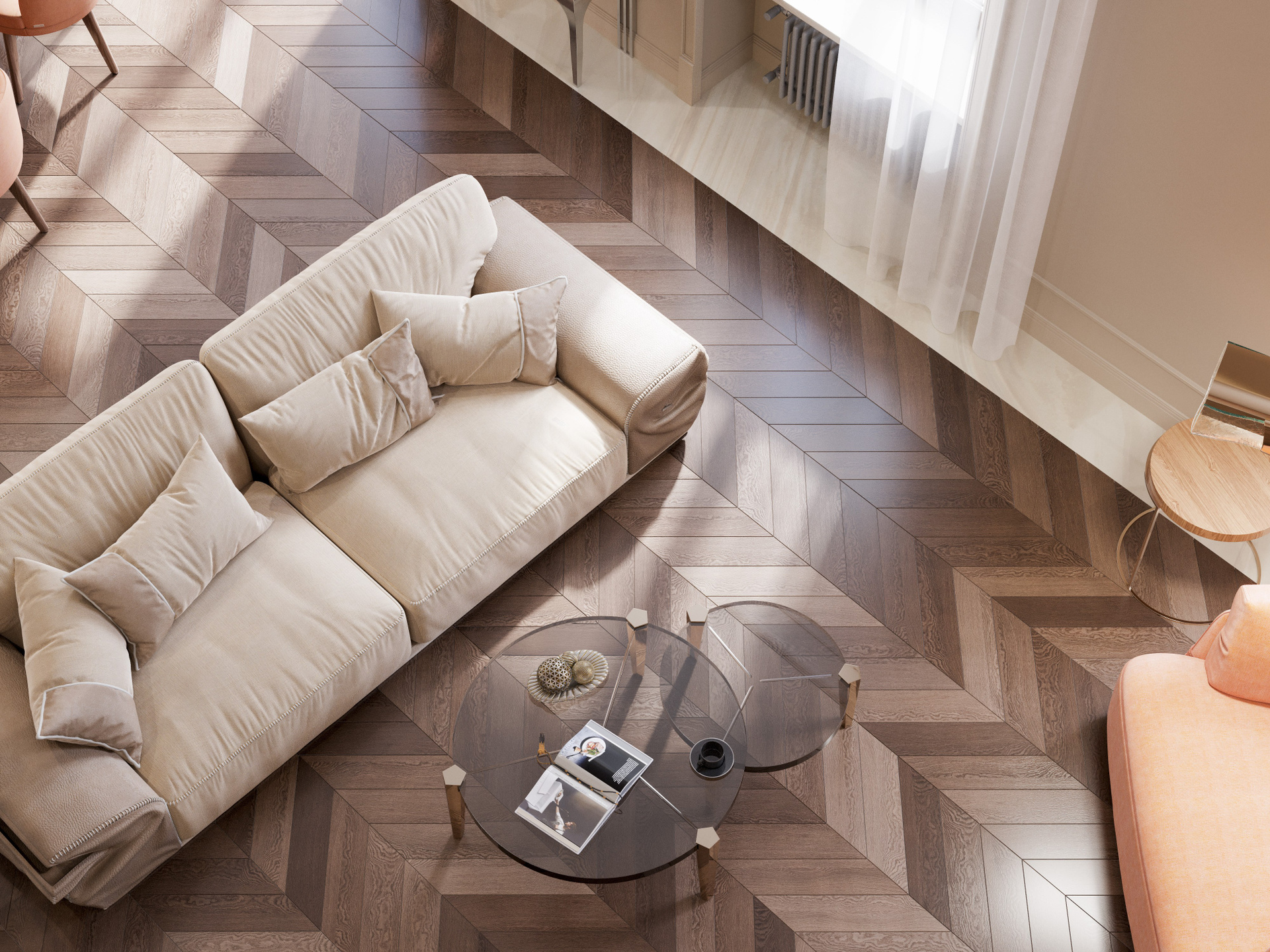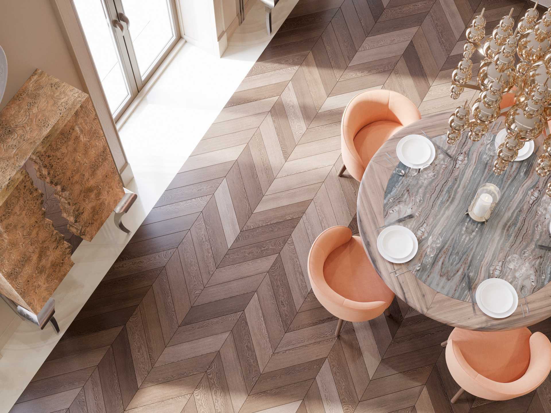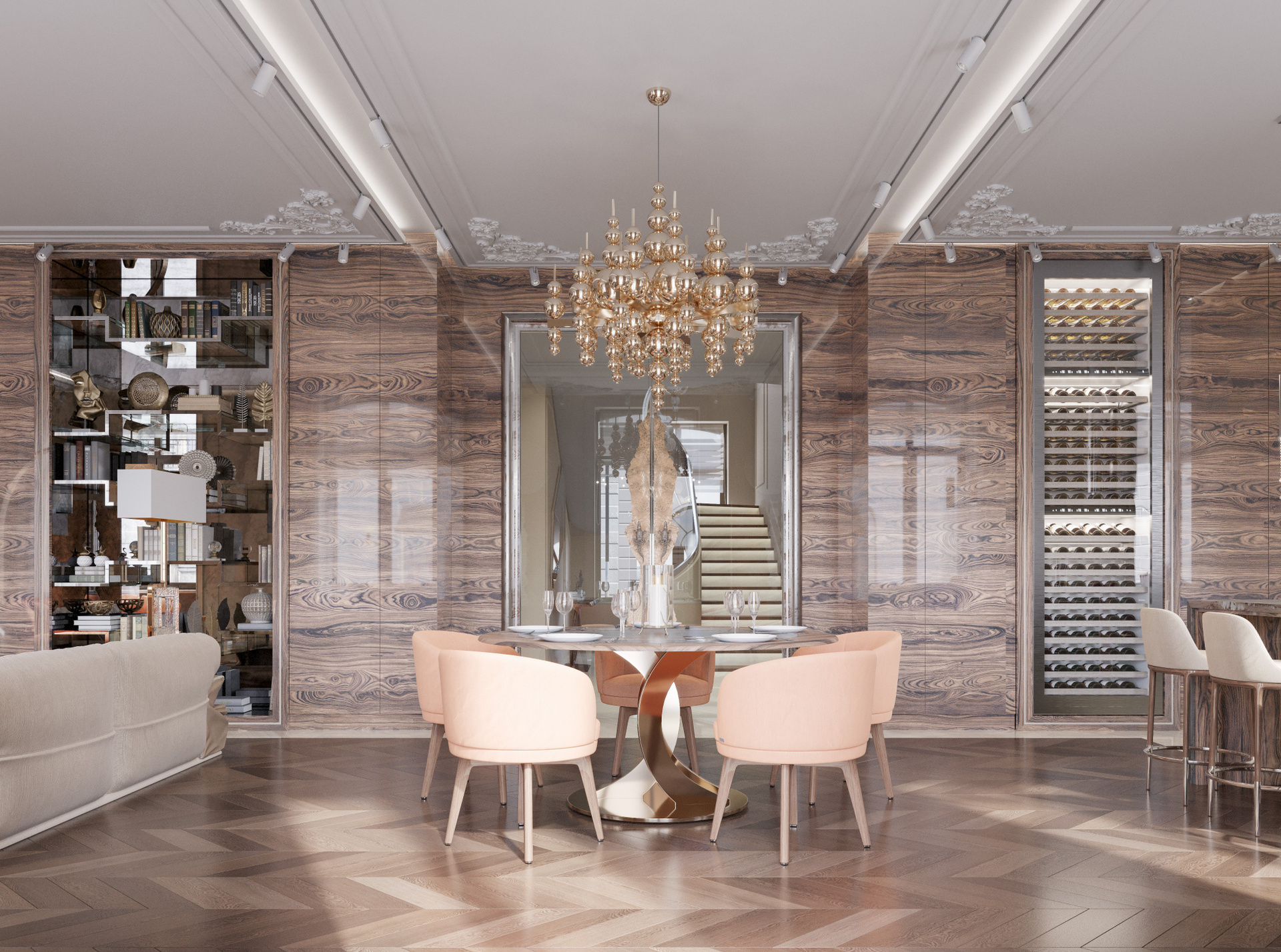 Общее пространство объединяет несколько функциональных зон, оставаясь цельным благодаря паркету «ёлка» и дереву тёплого оттенка. Столовая выделена круглым столом с каменной столешницей и выразительной золотистой люстрой, создающей центр композиции. Кухня оформлена насыщенным древесным рисунком, зелёными фасадами и крупной островной зоной из камня. Мягкая мебель в персиковых и кремовых оттенках формирует гармоничный визуальный баланс. Благодаря детальной 3D визуализации в Corona Renderer полностью раскрываются текстуры и глубина материалов.