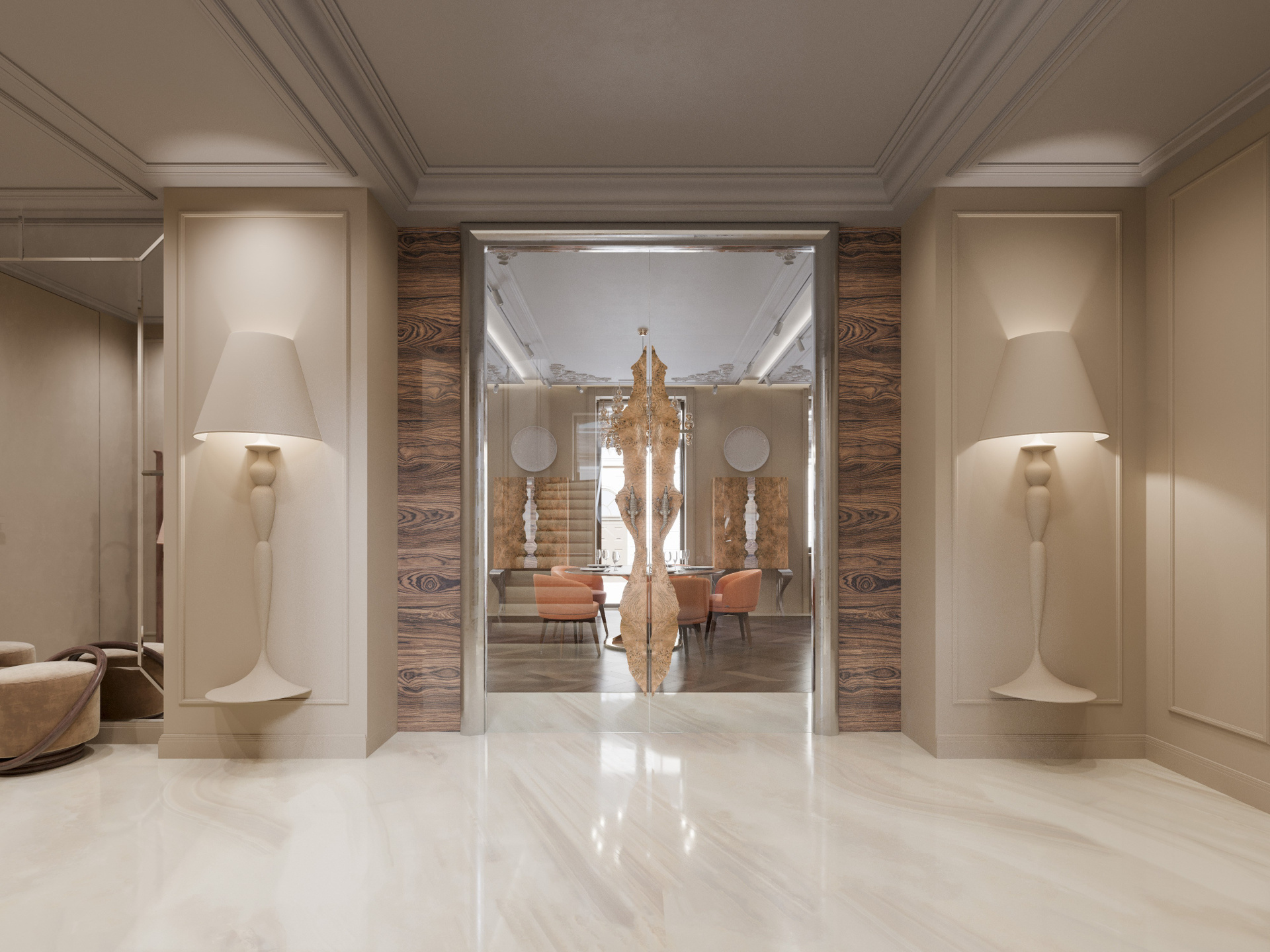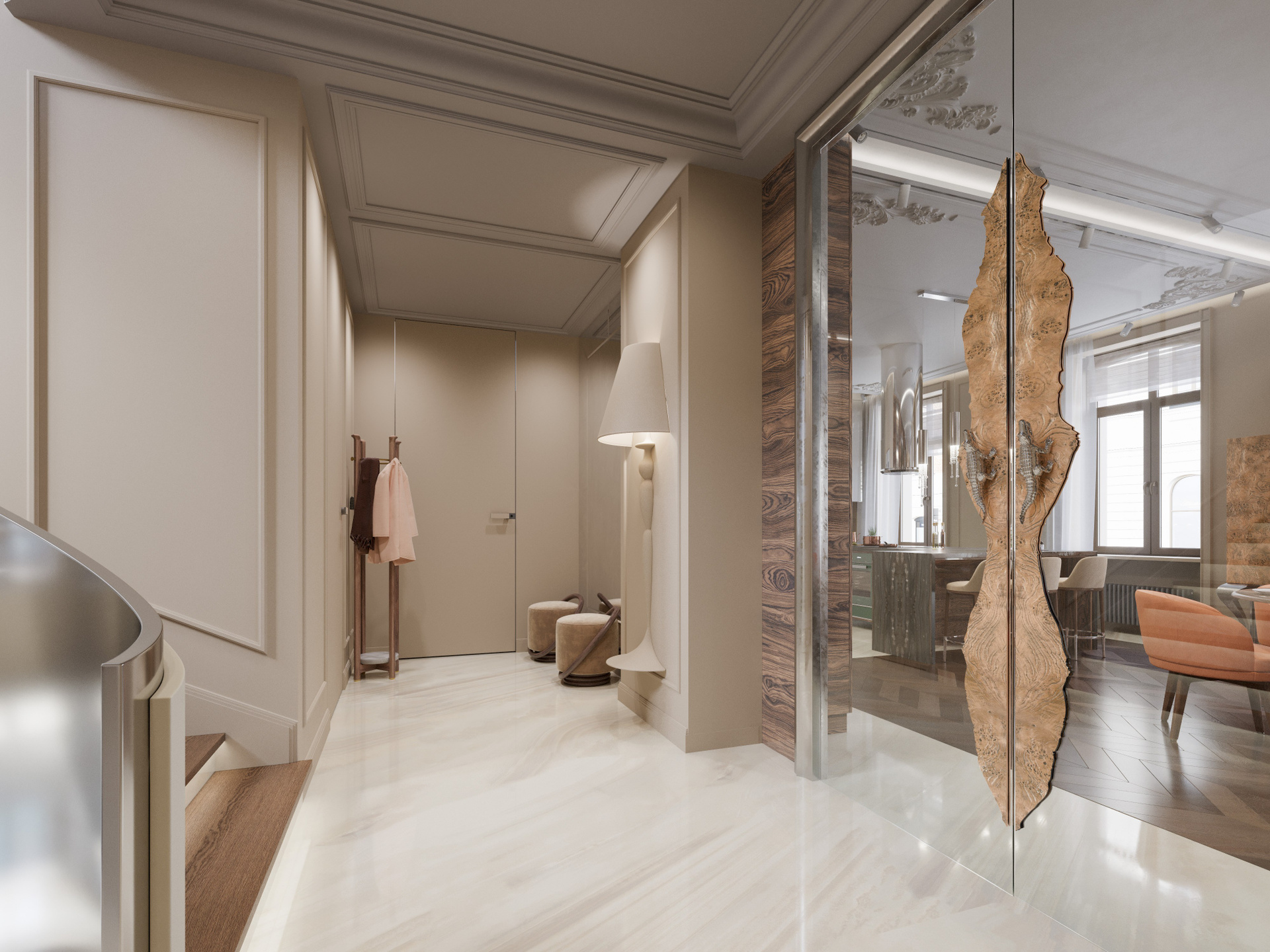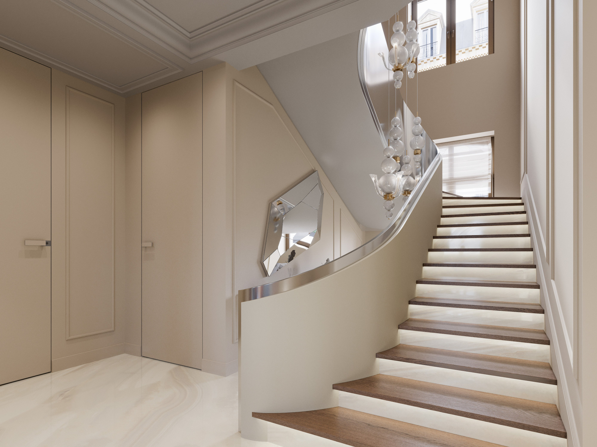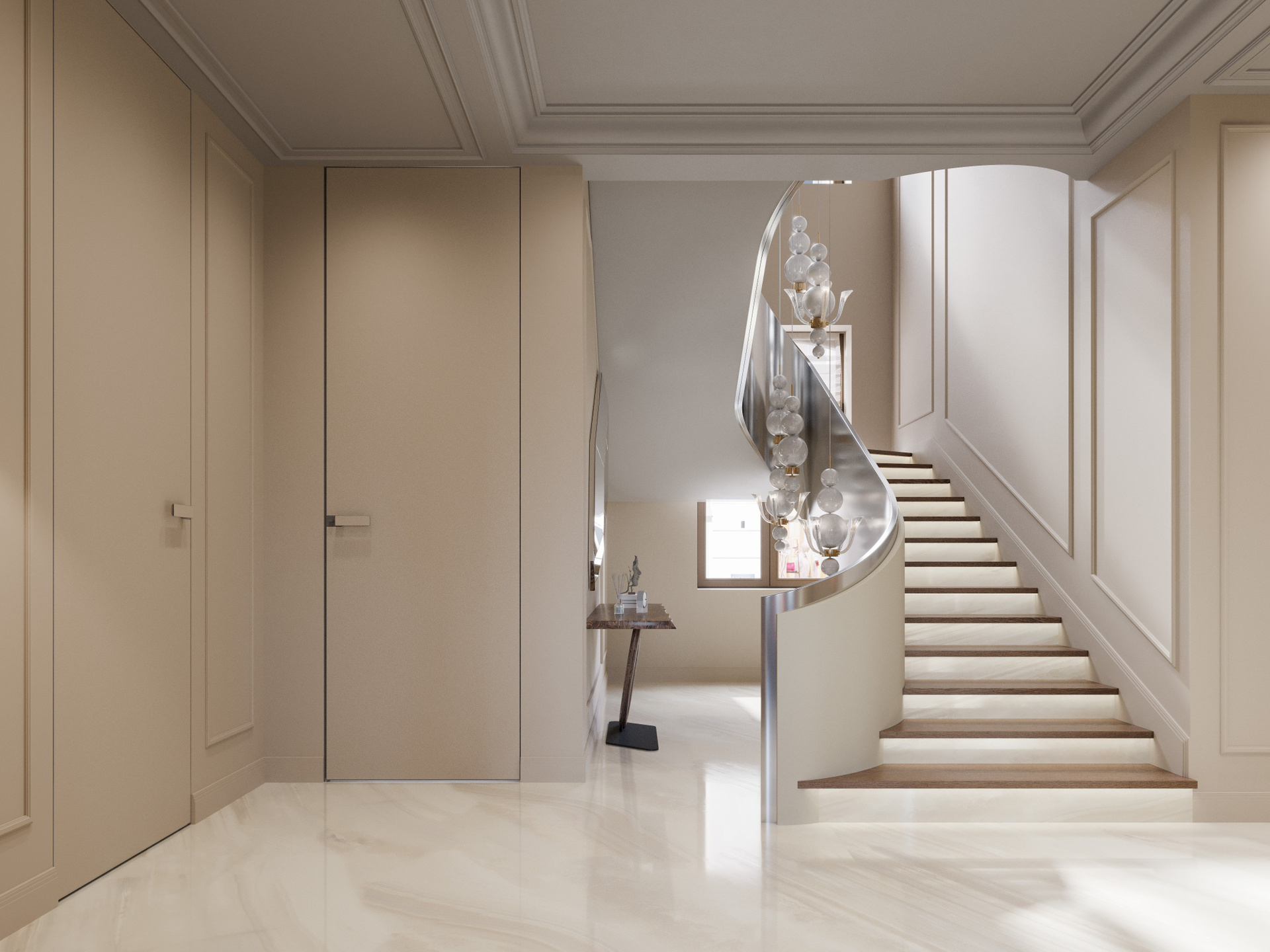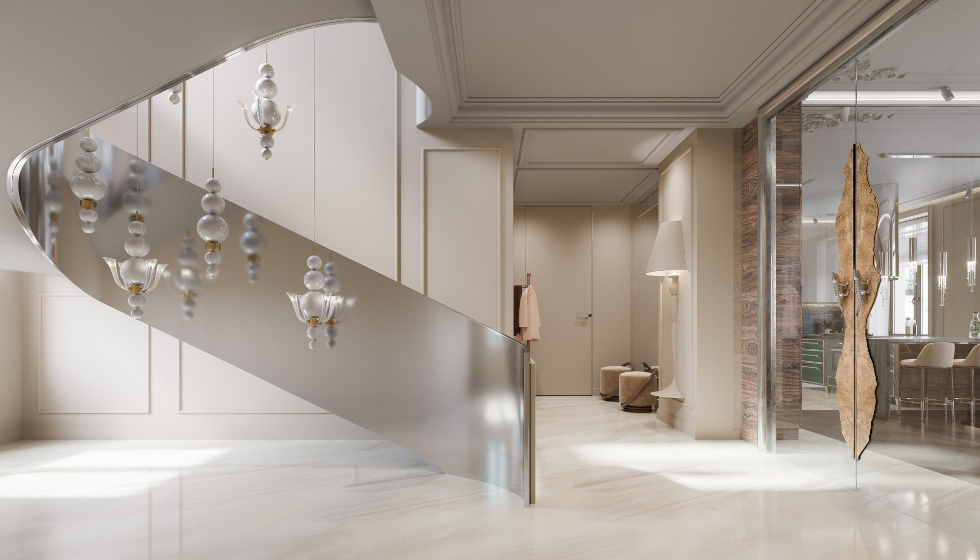 Входная группа выполнена в светлой палитре с мягкими бежевыми оттенками и крупноформатным мраморным полом. Главный акцент — плавная металлическая лестница с выразительными подвесами, создающими игру света и отражений. Панели с филёнками поддерживают классический ритм, а стеклянные перегородки с природными декоративными элементами добавляют эксклюзивности. Здесь визуализация дизайна интерьера подчёркивает сочетание монументальности и воздушности.
