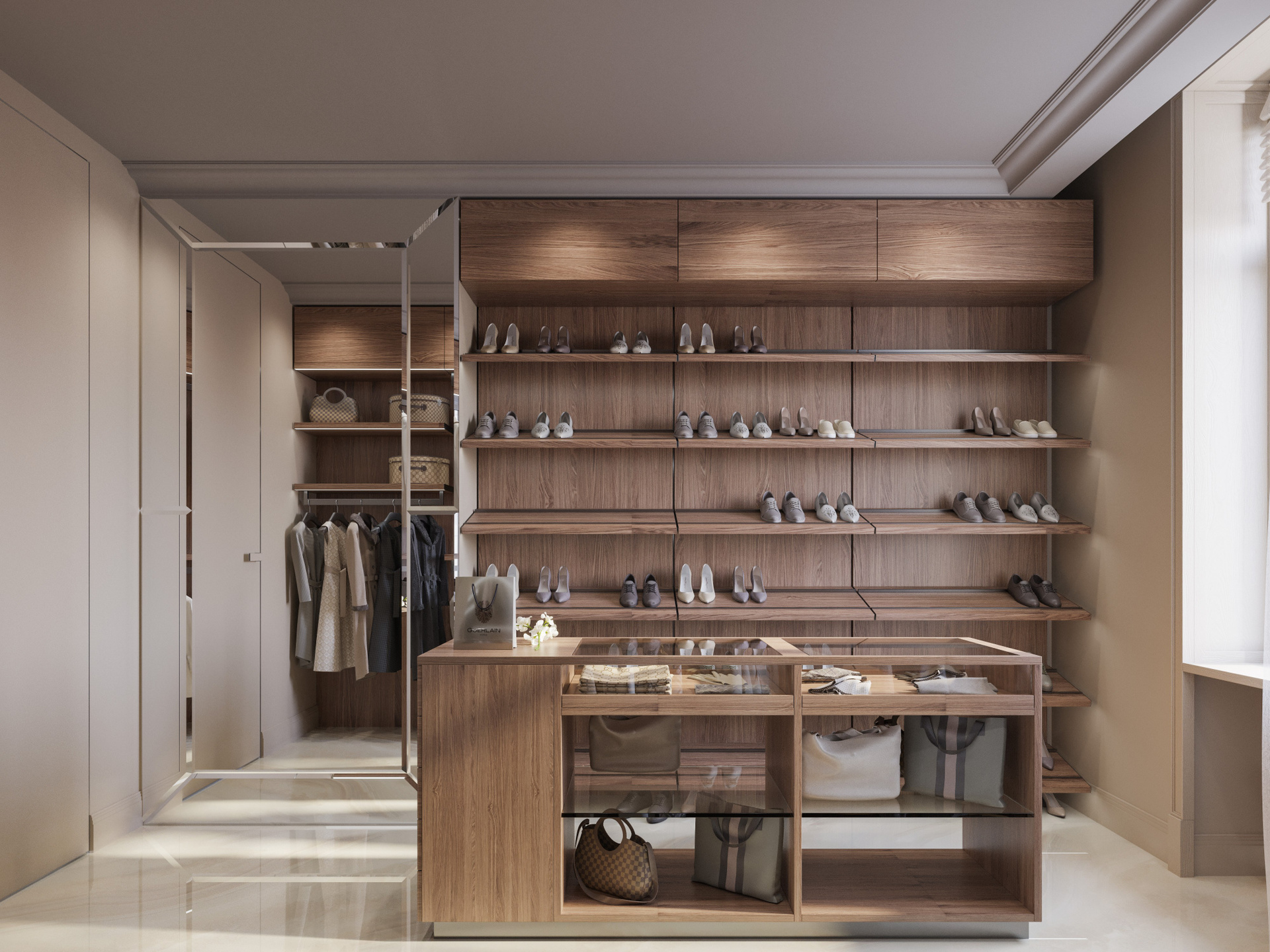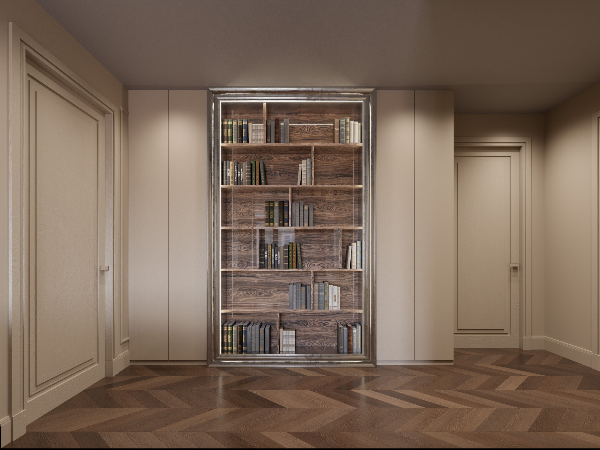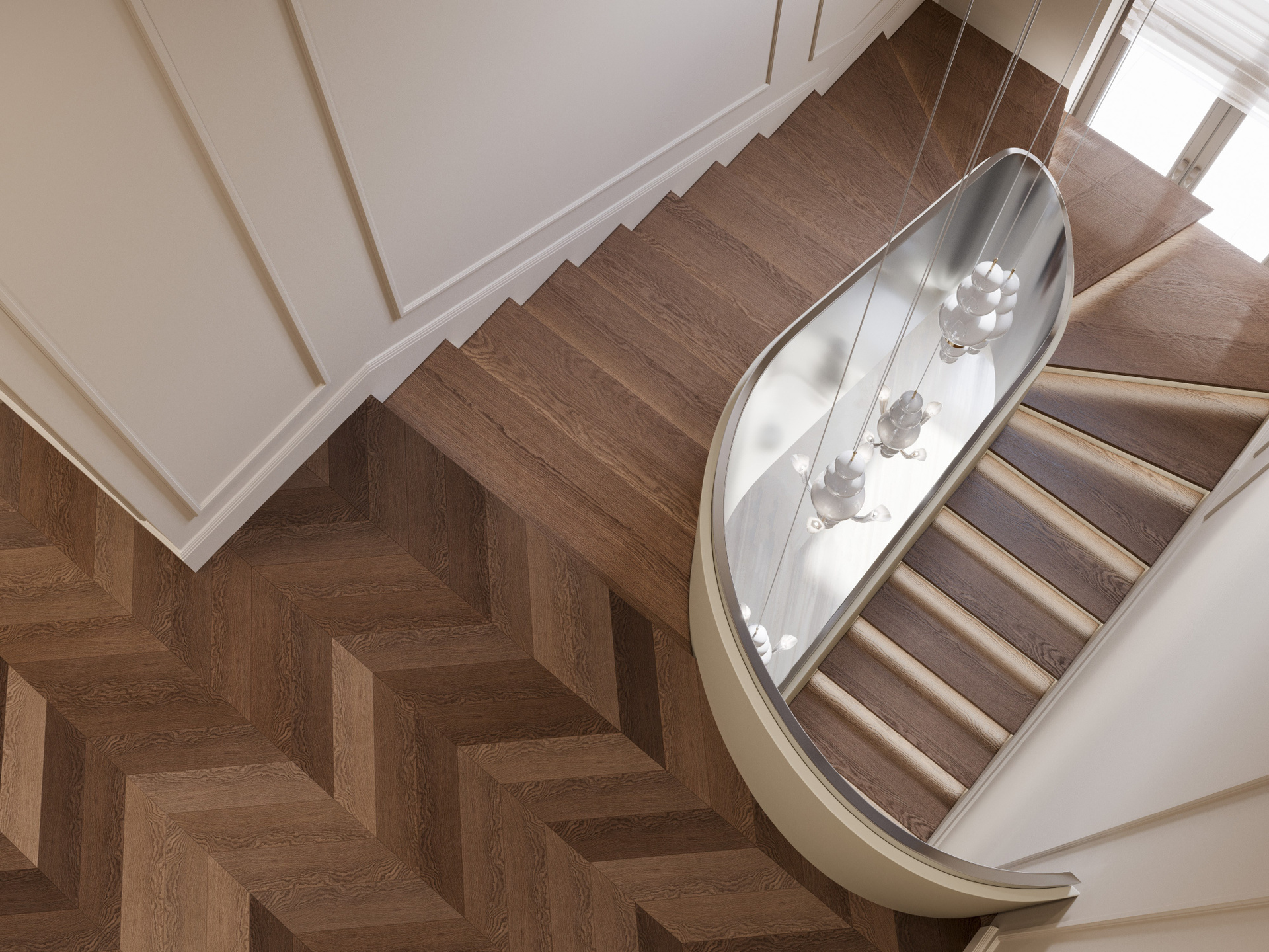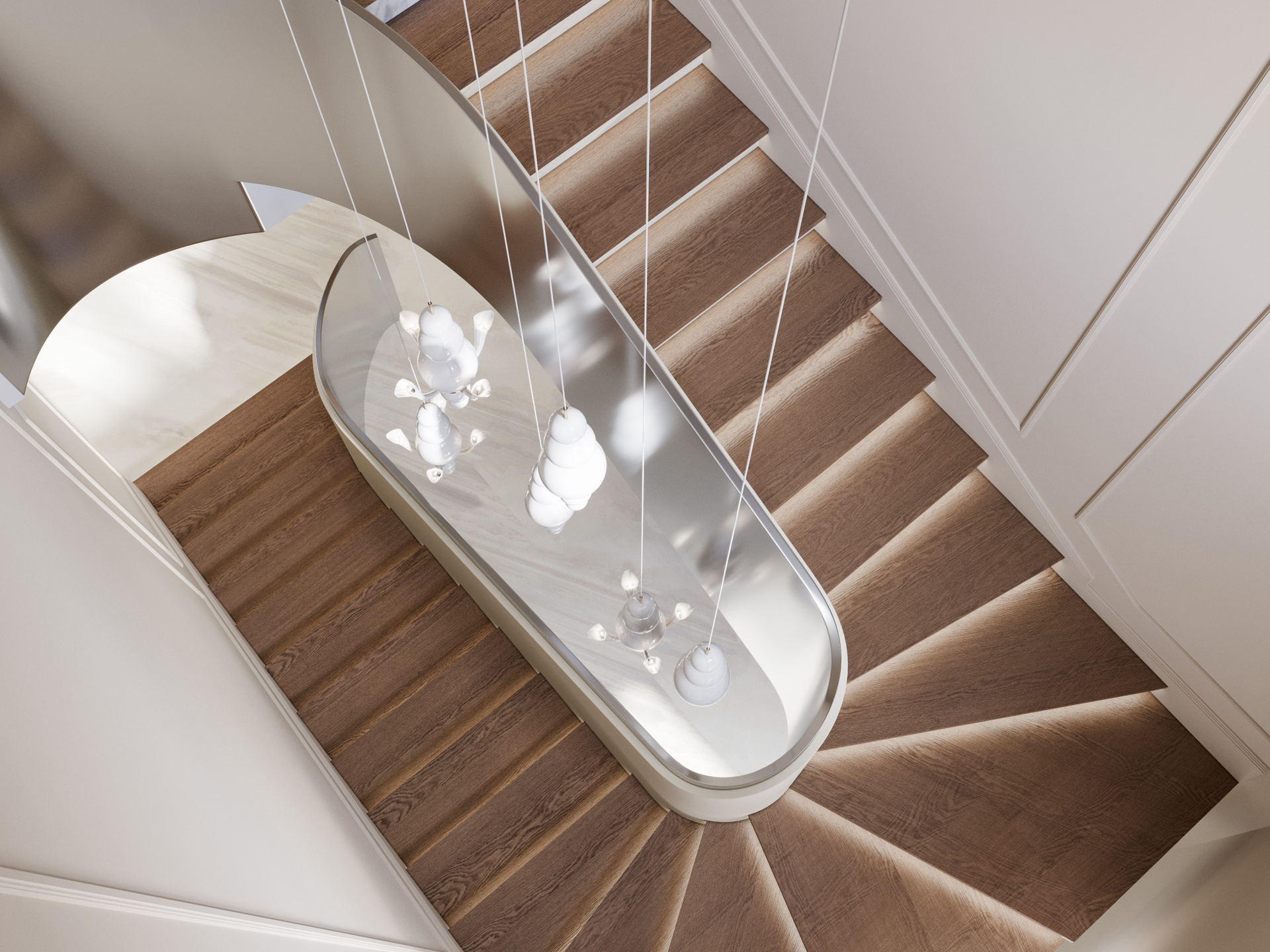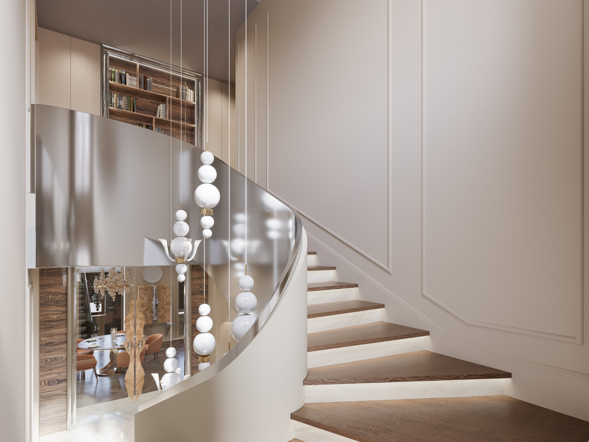 Входная группа выполнена в светлой палитре с мягкими бежевыми оттенками и крупноформатным мраморным полом. Главный акцент — плавная металлическая лестница с выразительными подвесами, создающими игру света и отражений. Панели с филёнками поддерживают классический ритм, а стеклянные перегородки с природными декоративными элементами добавляют эксклюзивности. Здесь визуализация дизайна интерьера подчёркивает сочетание монументальности и воздушности.