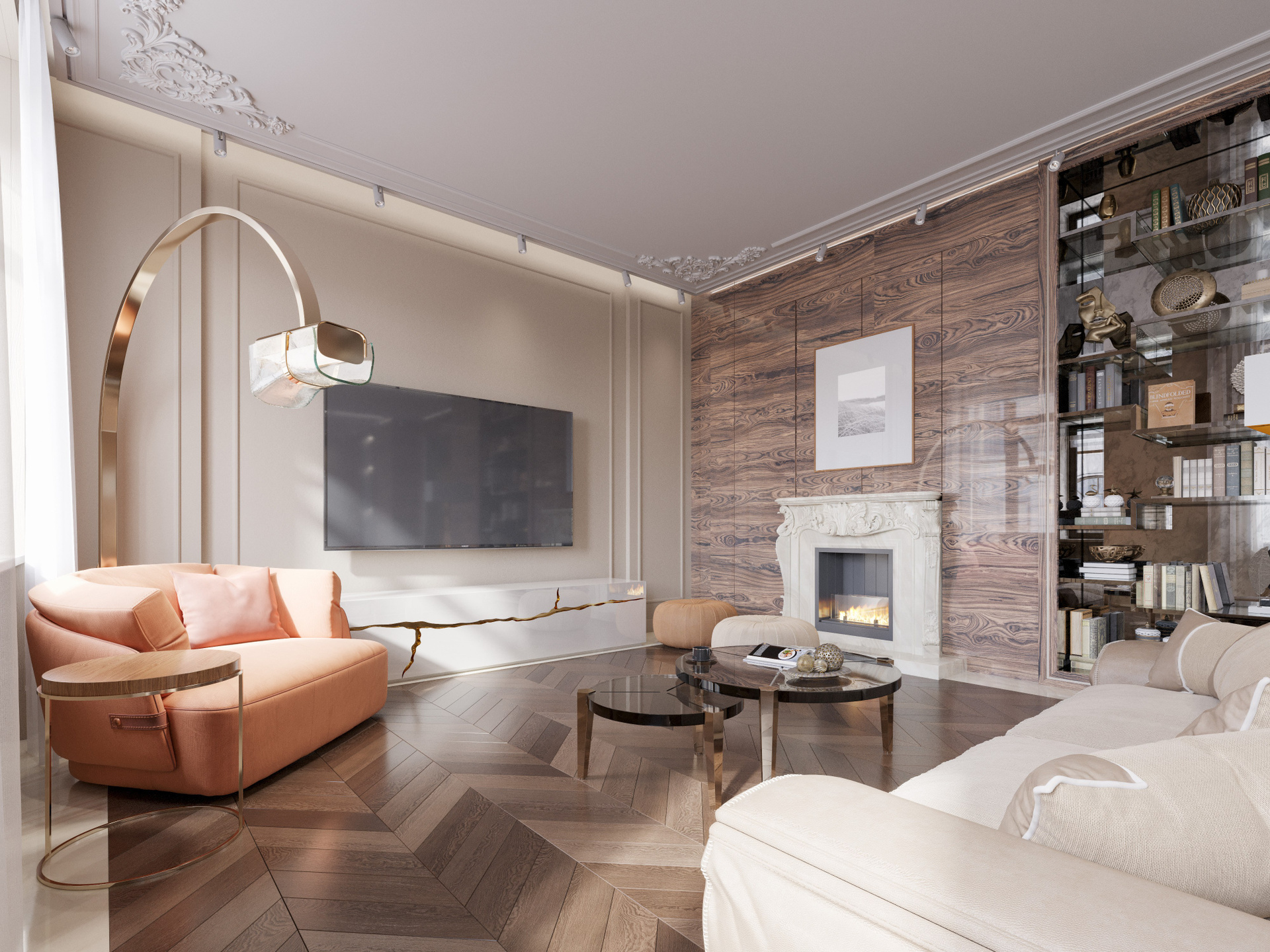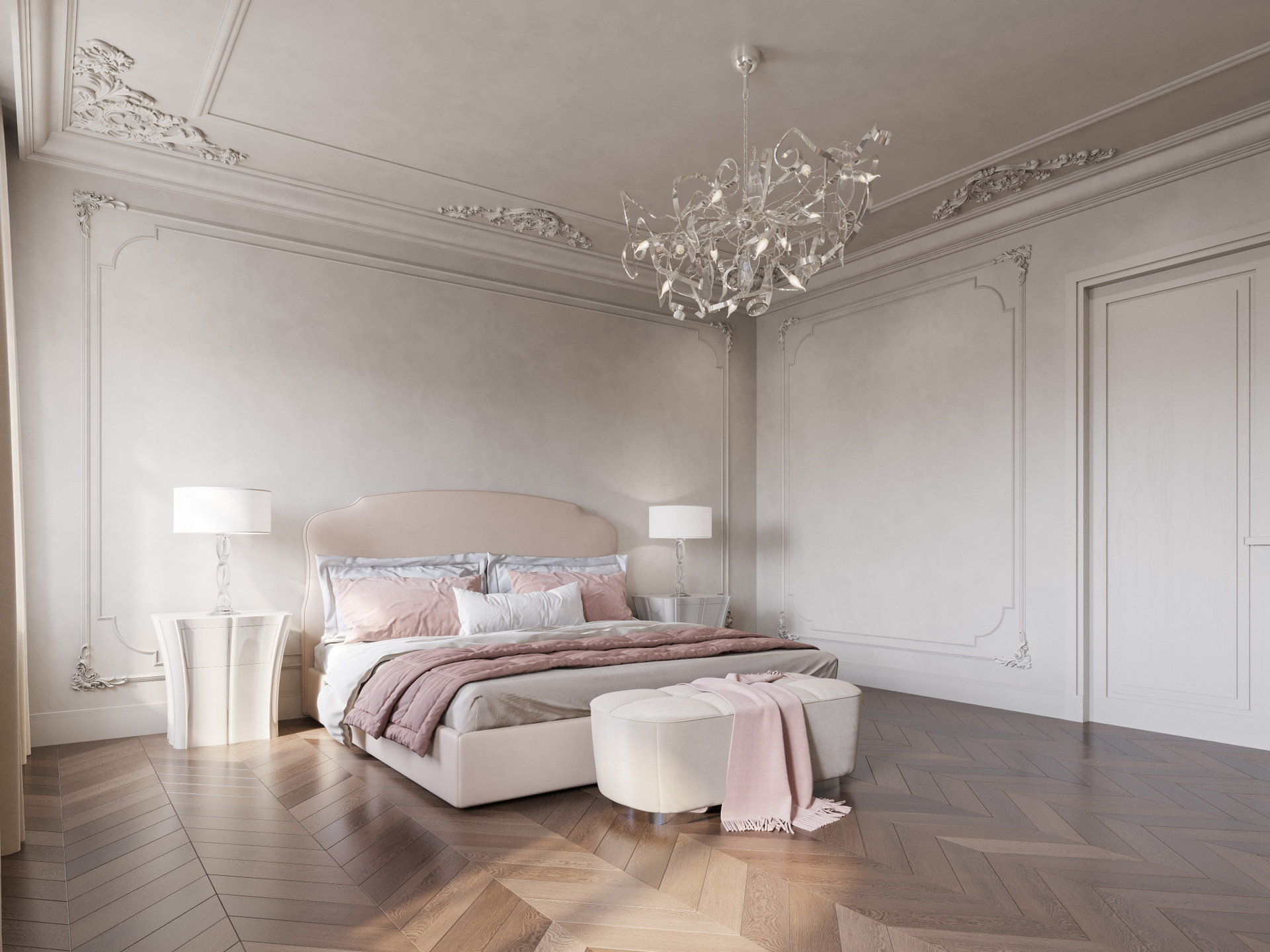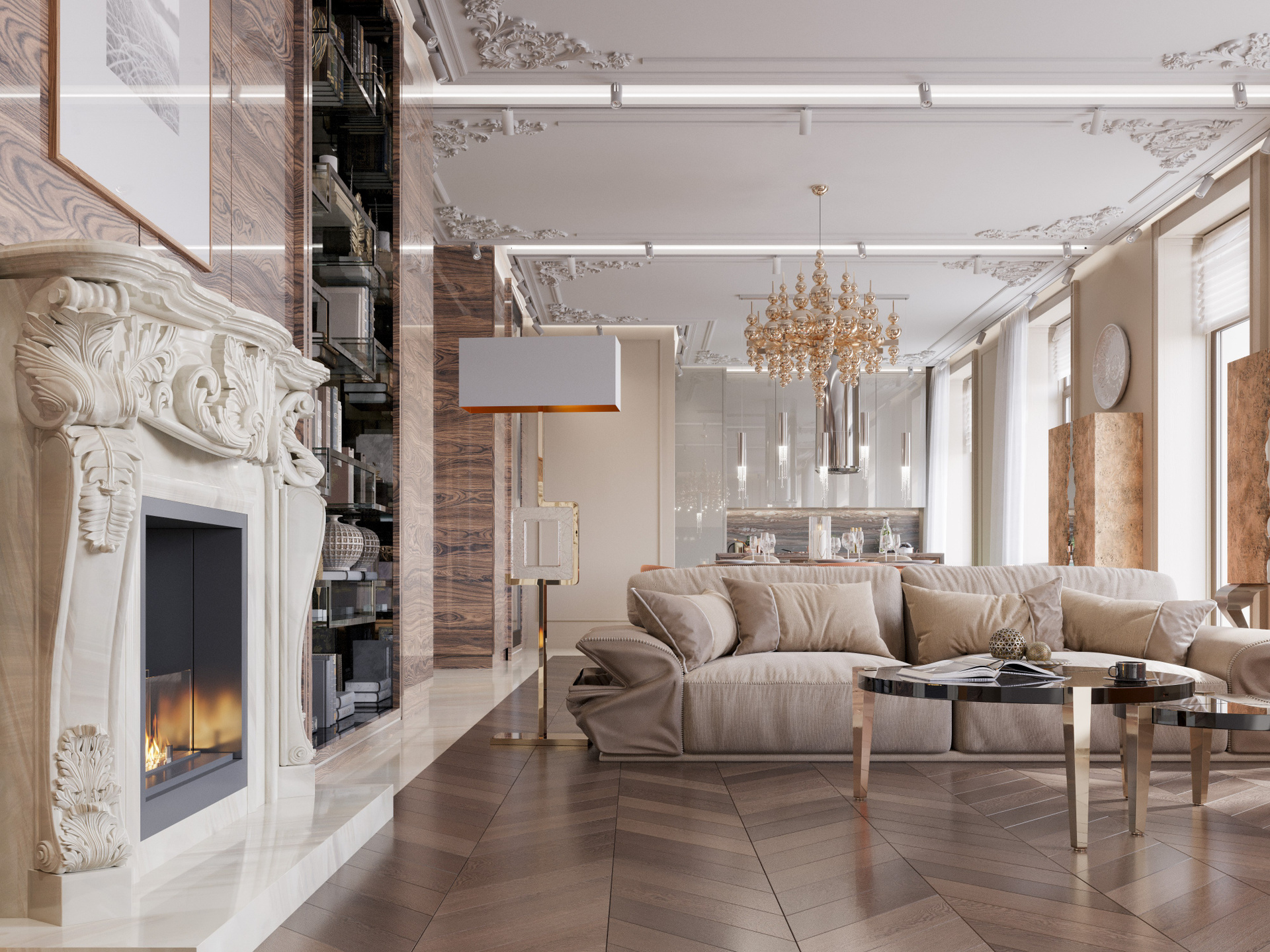 Этот проект — выразительная фотореалистичная 3D визуализация интерьера, где комбинация классических деталей и современных материалов создаёт утончённую атмосферу. Светлые пространства, изящная лепнина, смелые цветовые акценты и индивидуальные решения подчеркивают характер квартиры. Детальная работа позволяет оценить глубину композиции и профессиональный подход к дизайну.