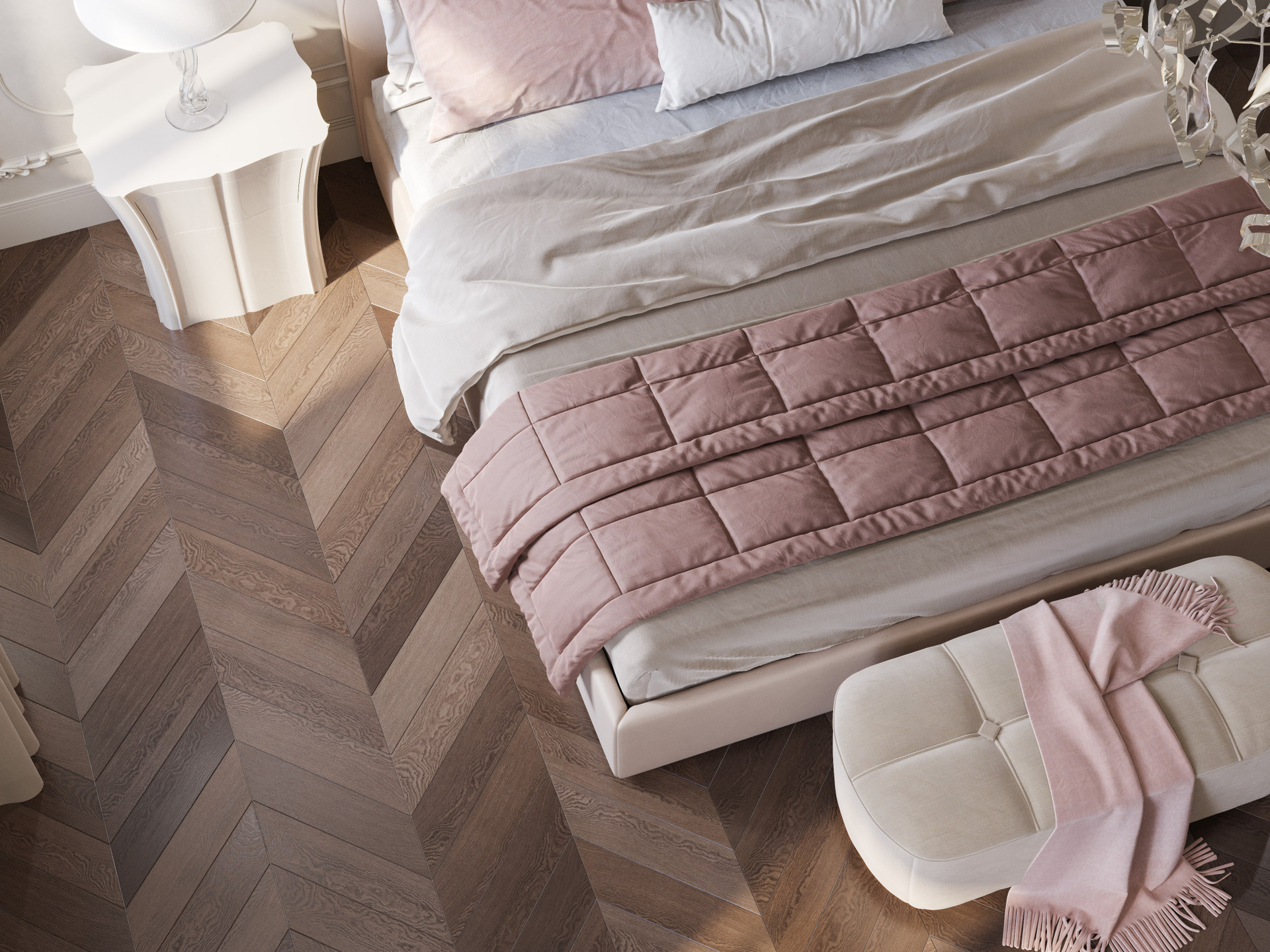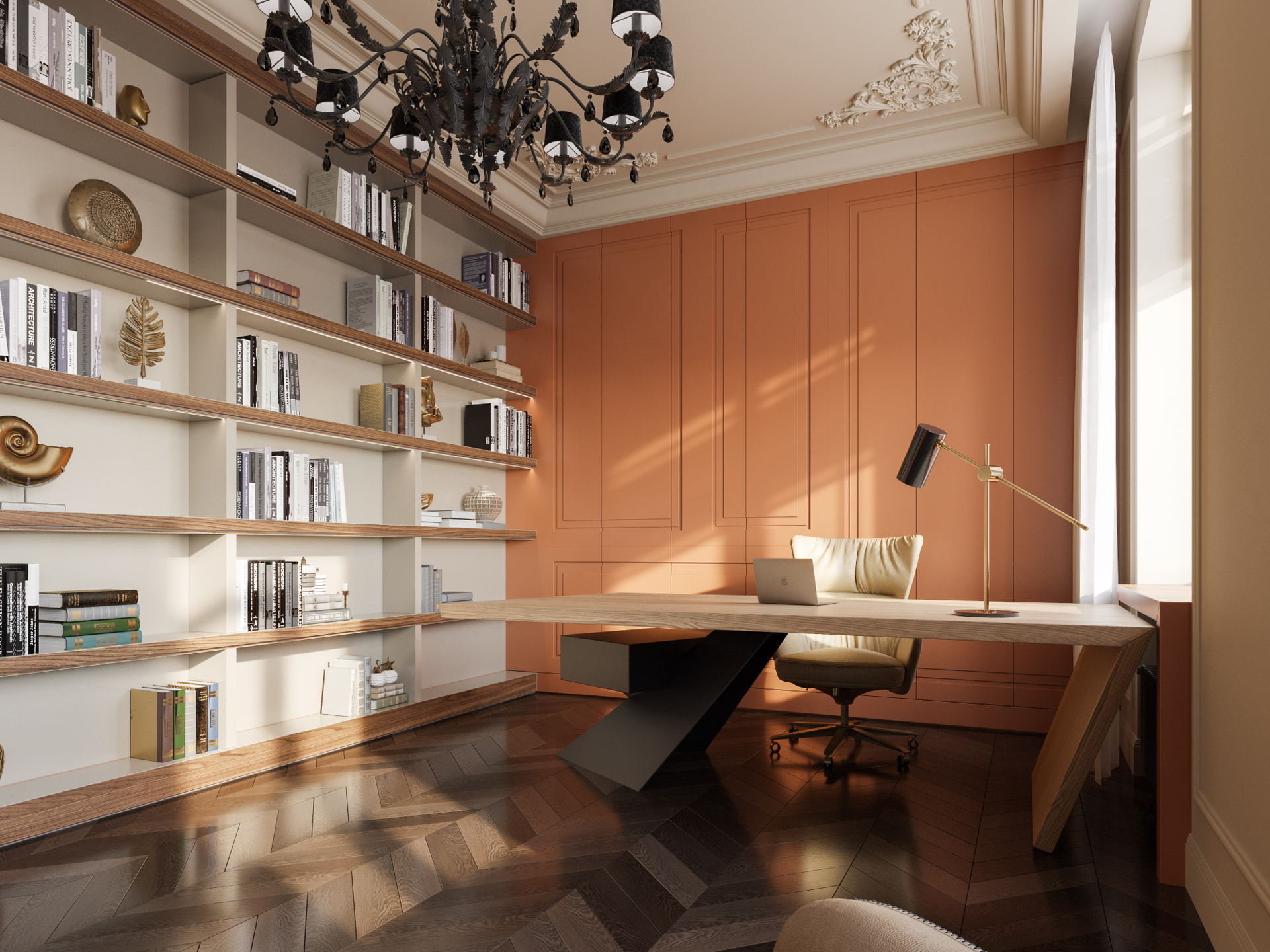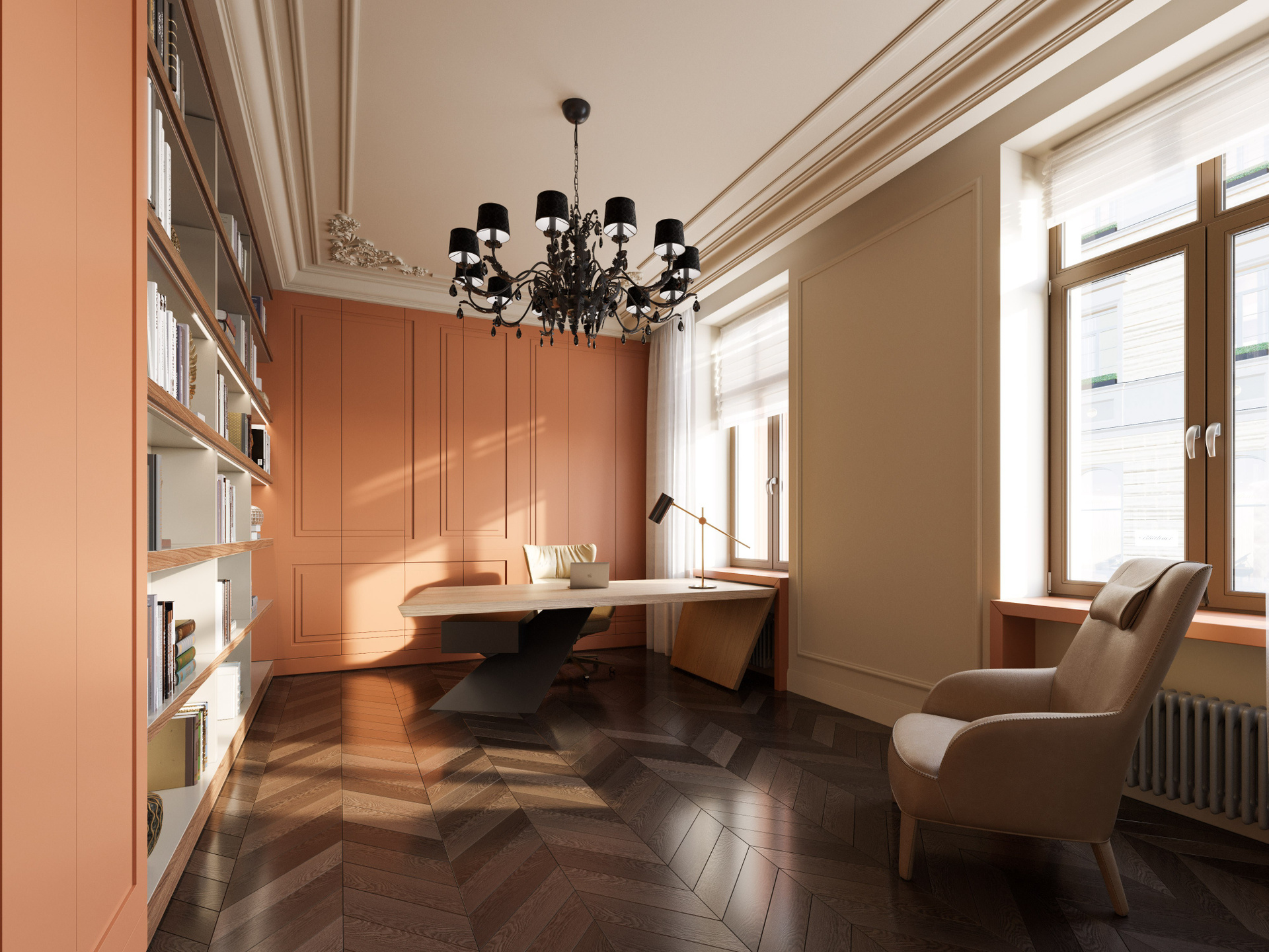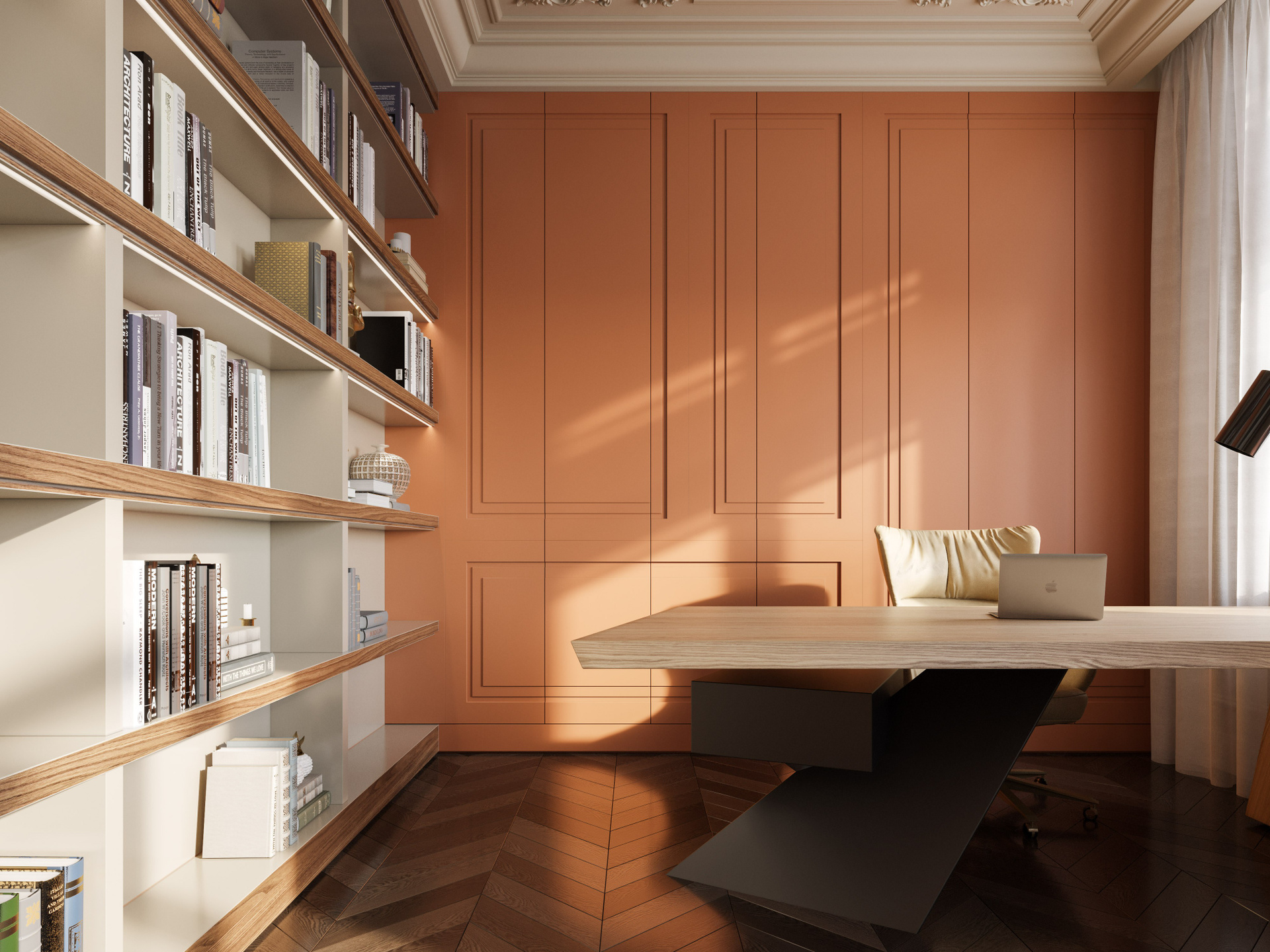 Кабинет оформлен в спокойной, но насыщенной цветовой гамме: терракотовые панели, большое рабочее место и встроенная библиотека создают атмосферу уюта и концентрации. В спальне доминируют нежные светлые тона, лепной декор и лёгкий текстиль. Здесь интерьерные рендеры высокого качества передают аккуратность линий и мягкость освещения, подчёркивая спокойный характер комнаты.
