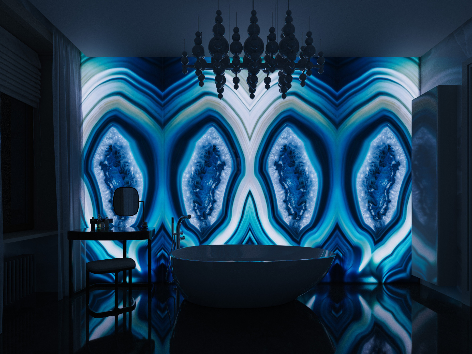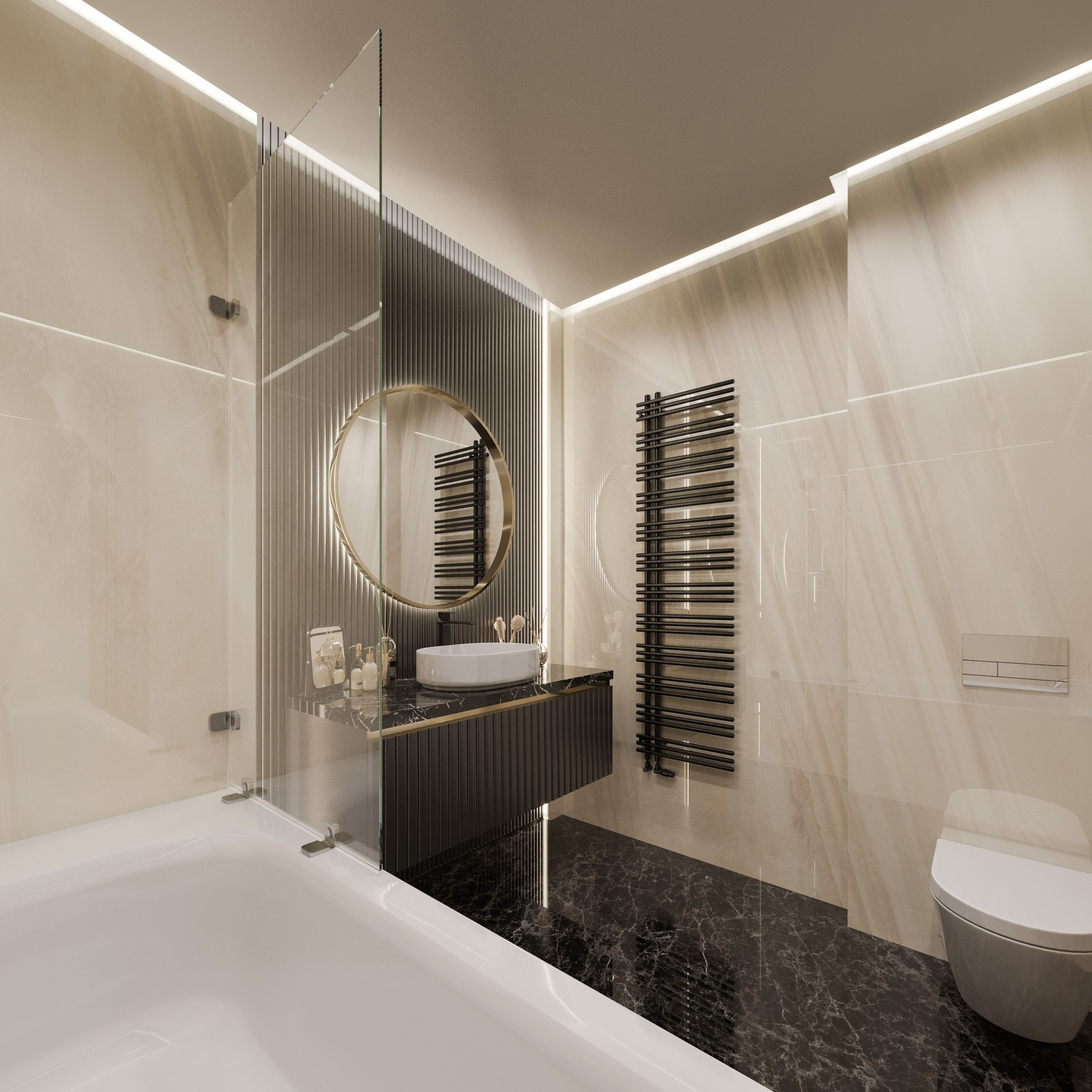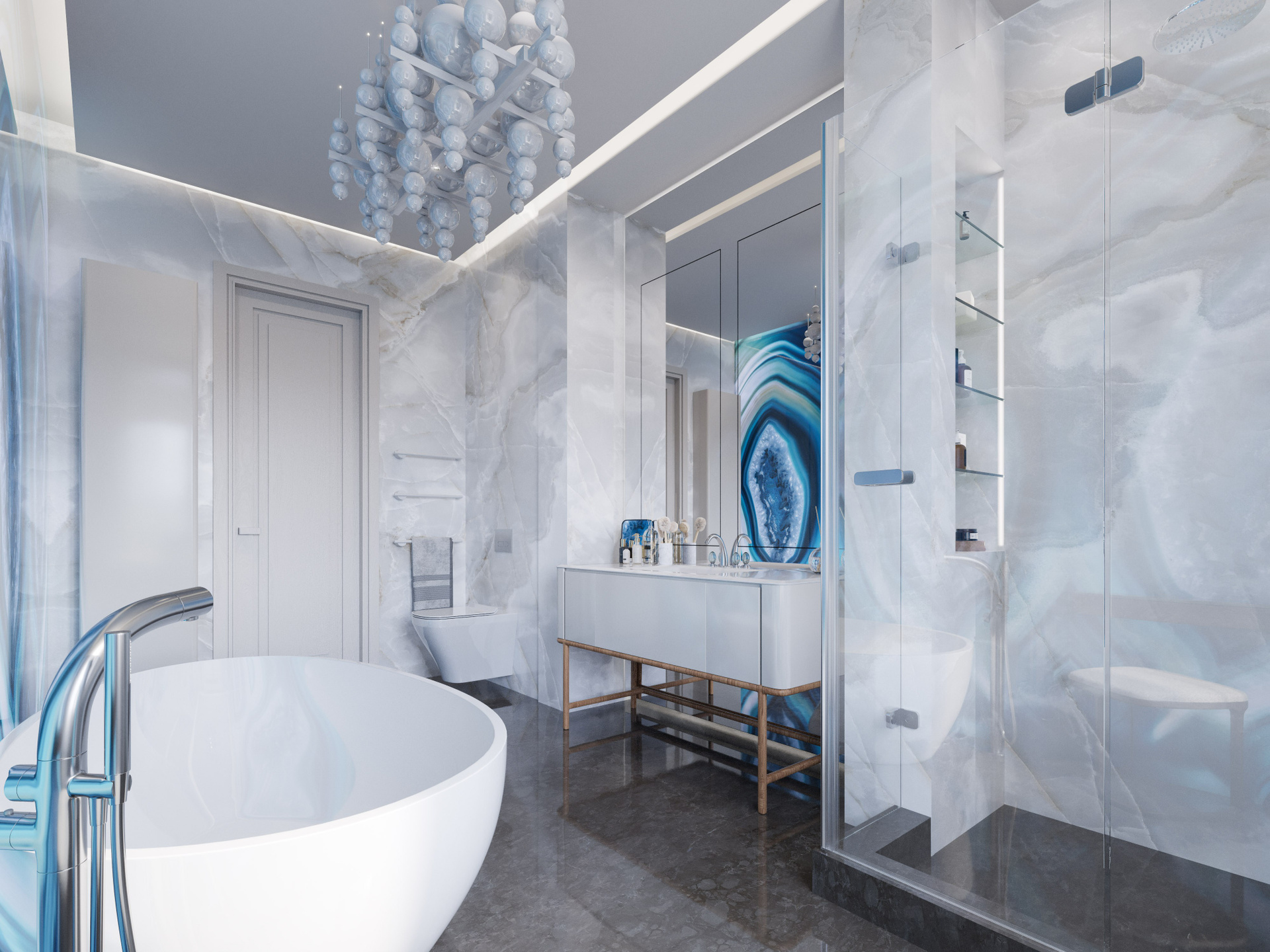Ванная при спальне выполнена на основе натурального камня с крупным рисунком. Акцентная стена из агата в сине-голубой палитре делает интерьер выразительным и благородным. Вторая ванная выдержана в тёмно-графитовых и бежевых тонах, где вертикальные декоративные панели и чёрная сантехника создают эффектный контраст. Создание фотореалистичных интерьеров позволяет передать глубину фактур и объем света.