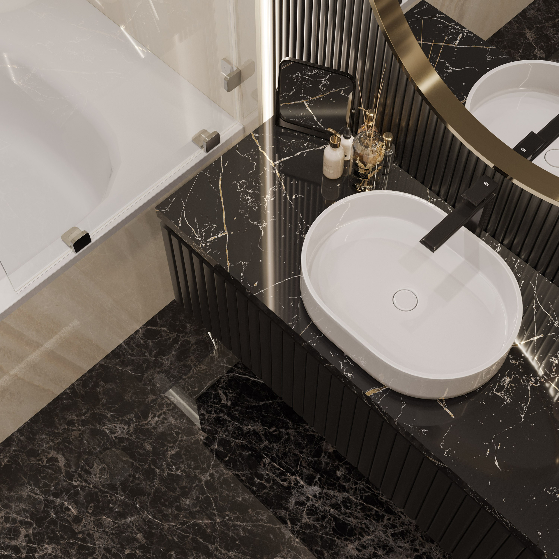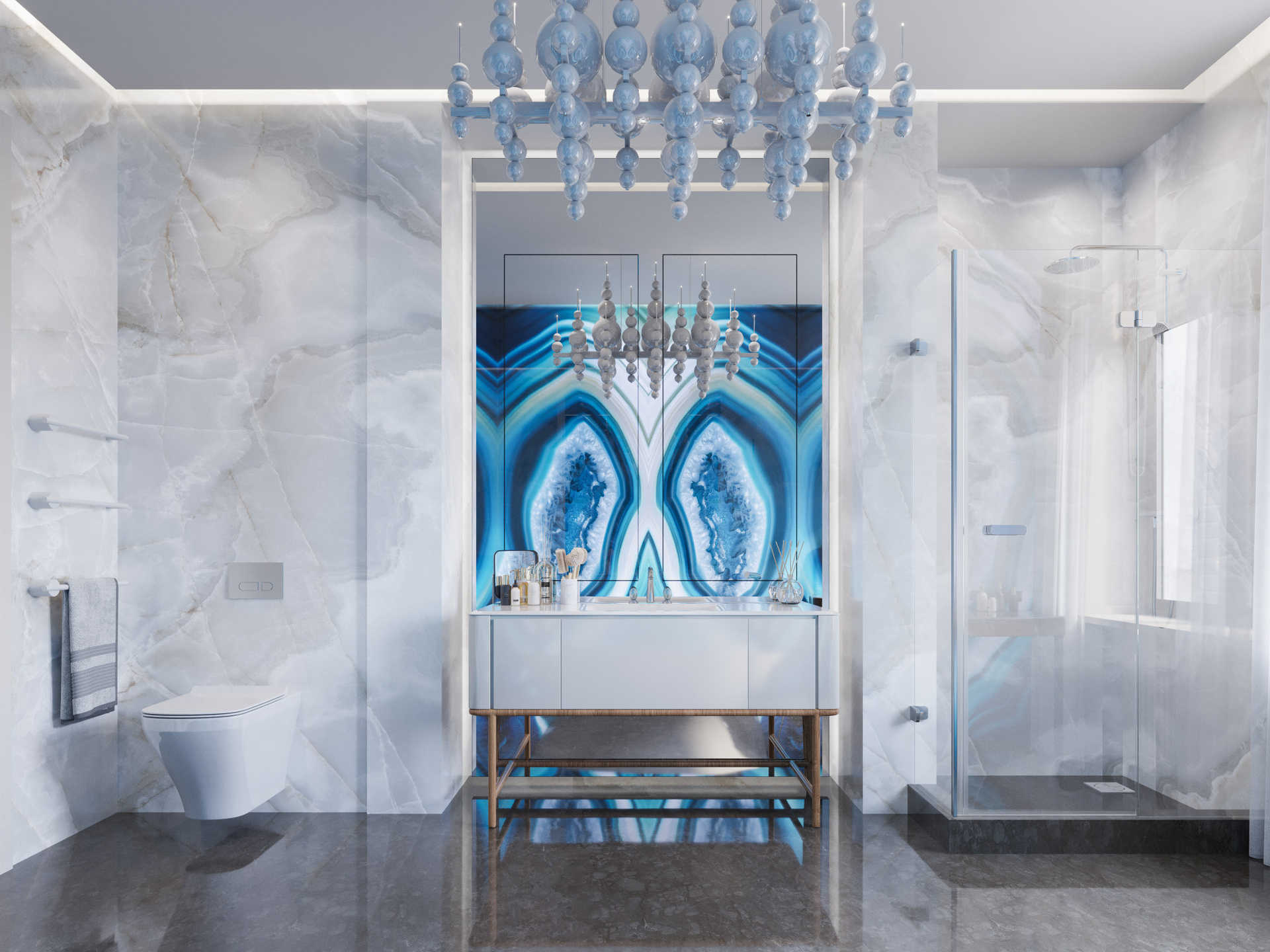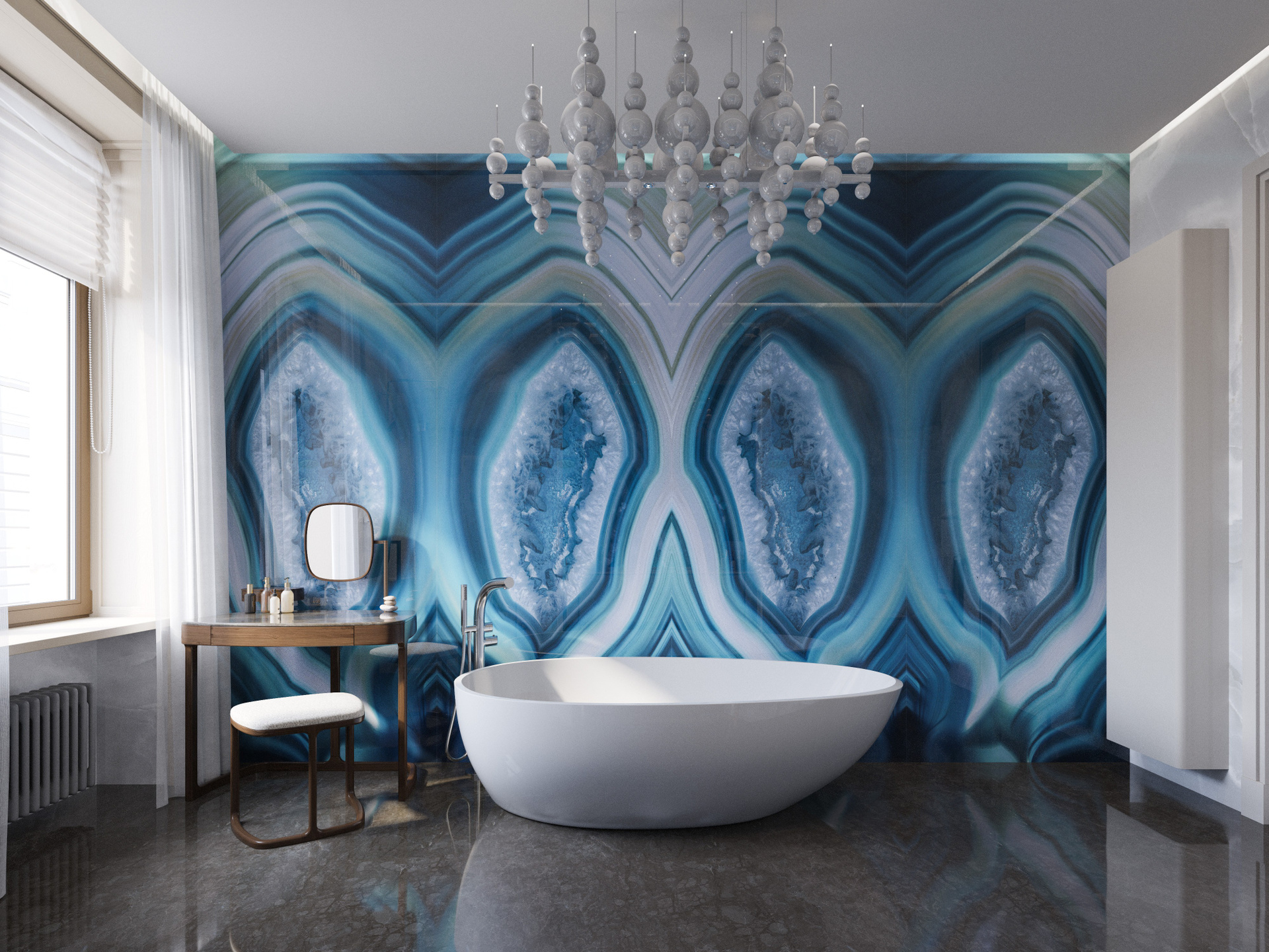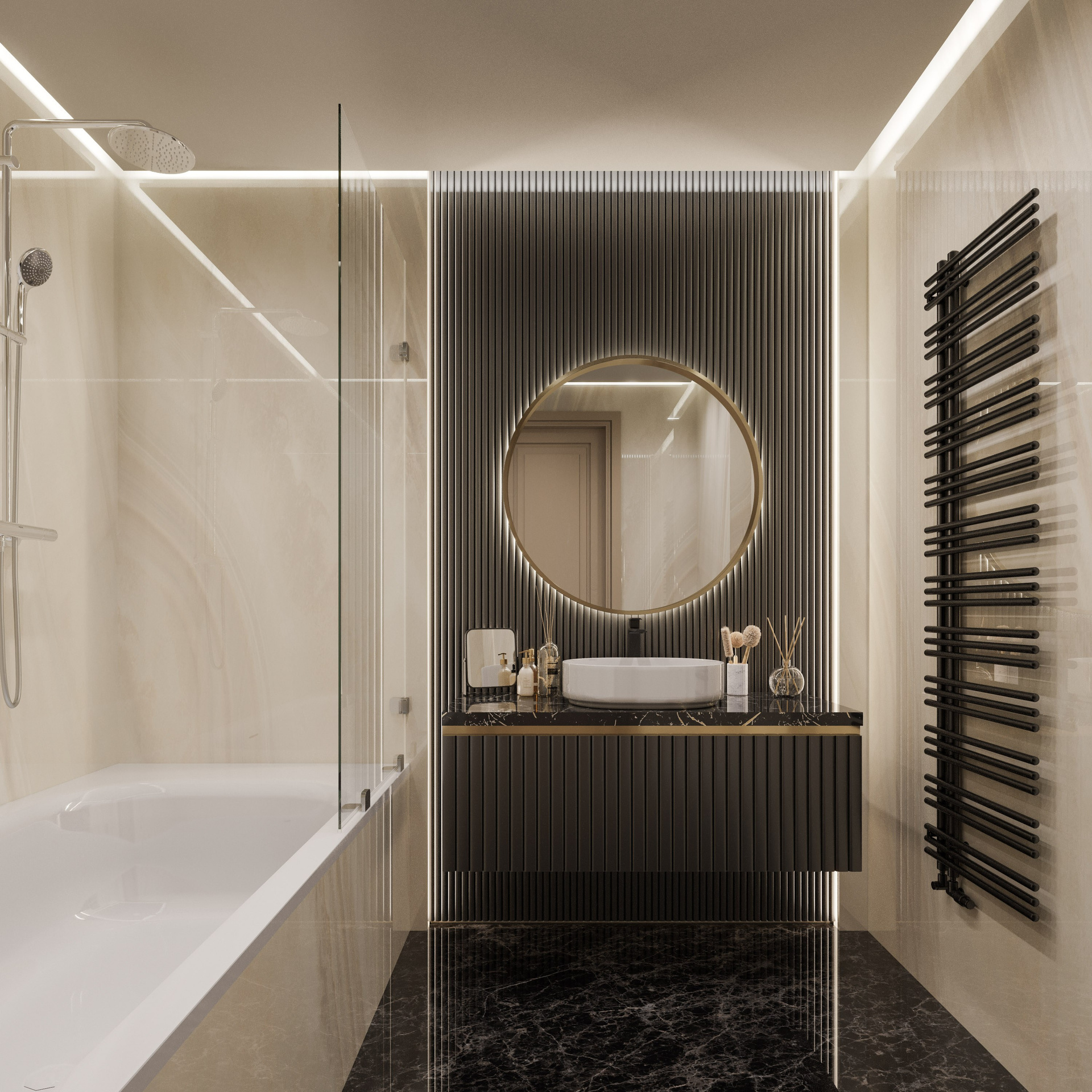 Ванная при спальне выполнена на основе натурального камня с крупным рисунком. Акцентная стена из агата в сине-голубой палитре делает интерьер выразительным и благородным. Вторая ванная выдержана в тёмно-графитовых и бежевых тонах, где вертикальные декоративные панели и чёрная сантехника создают эффектный контраст. Создание фотореалистичных интерьеров позволяет передать глубину фактур и объем света.