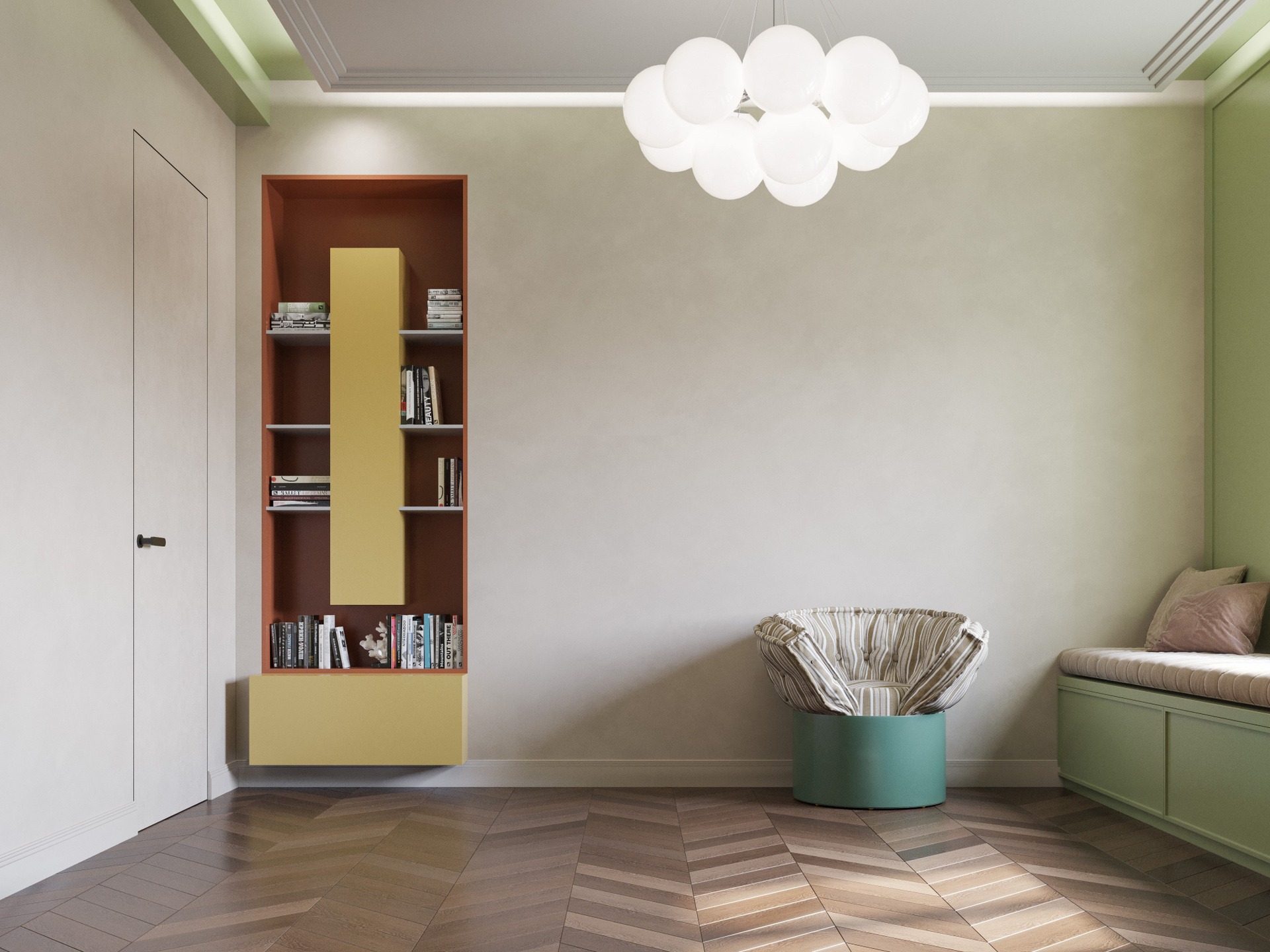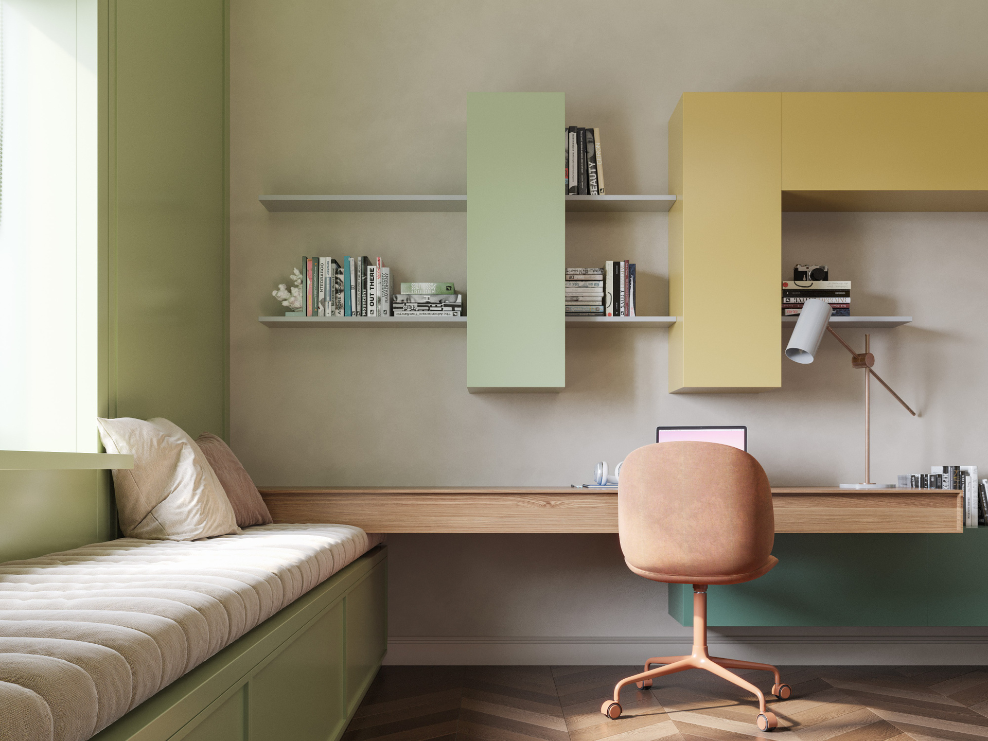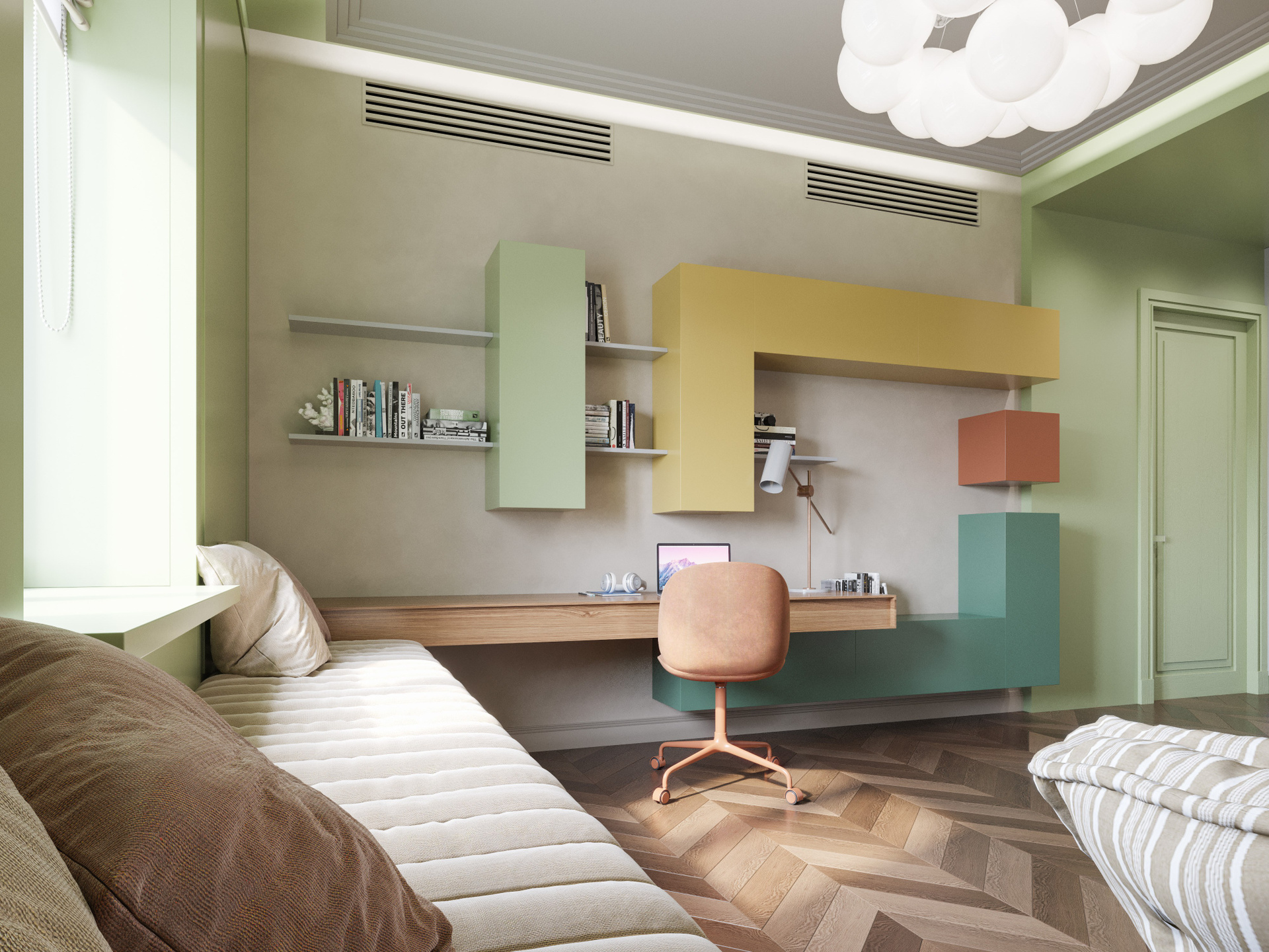Комната оформлена в нежной, пастельной, но насыщенной гамме: мятные и охристые модули, функциональный рабочий стол и широкая подоконная зона. Мягкое освещение делает пространство комфортным и живым. 3D визуализация интерьера подчёркивает лёгкость, индивидуальность и продуманность каждой детали.