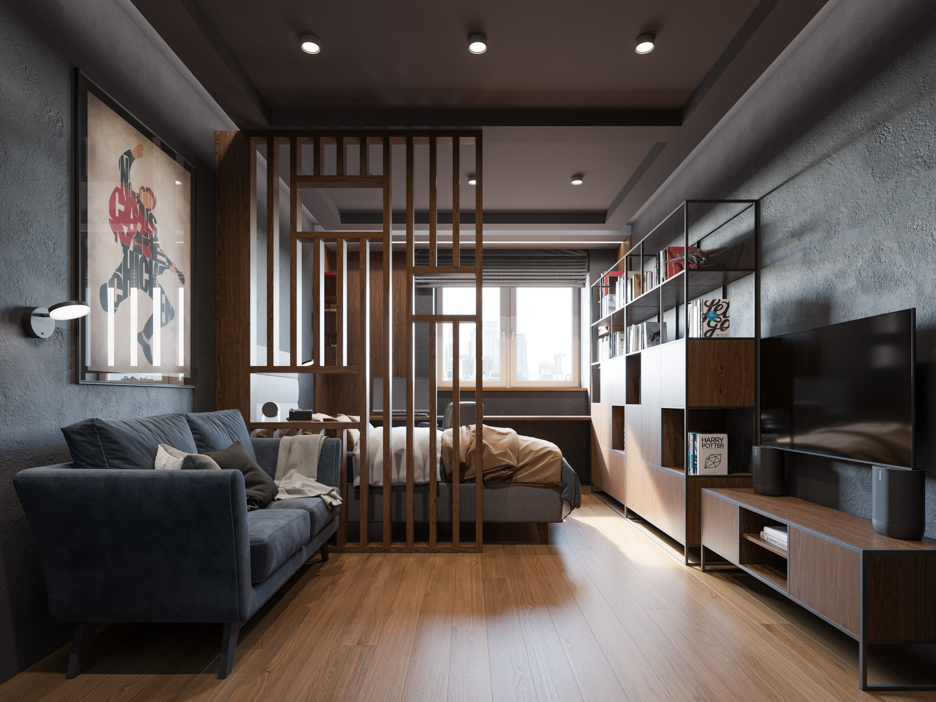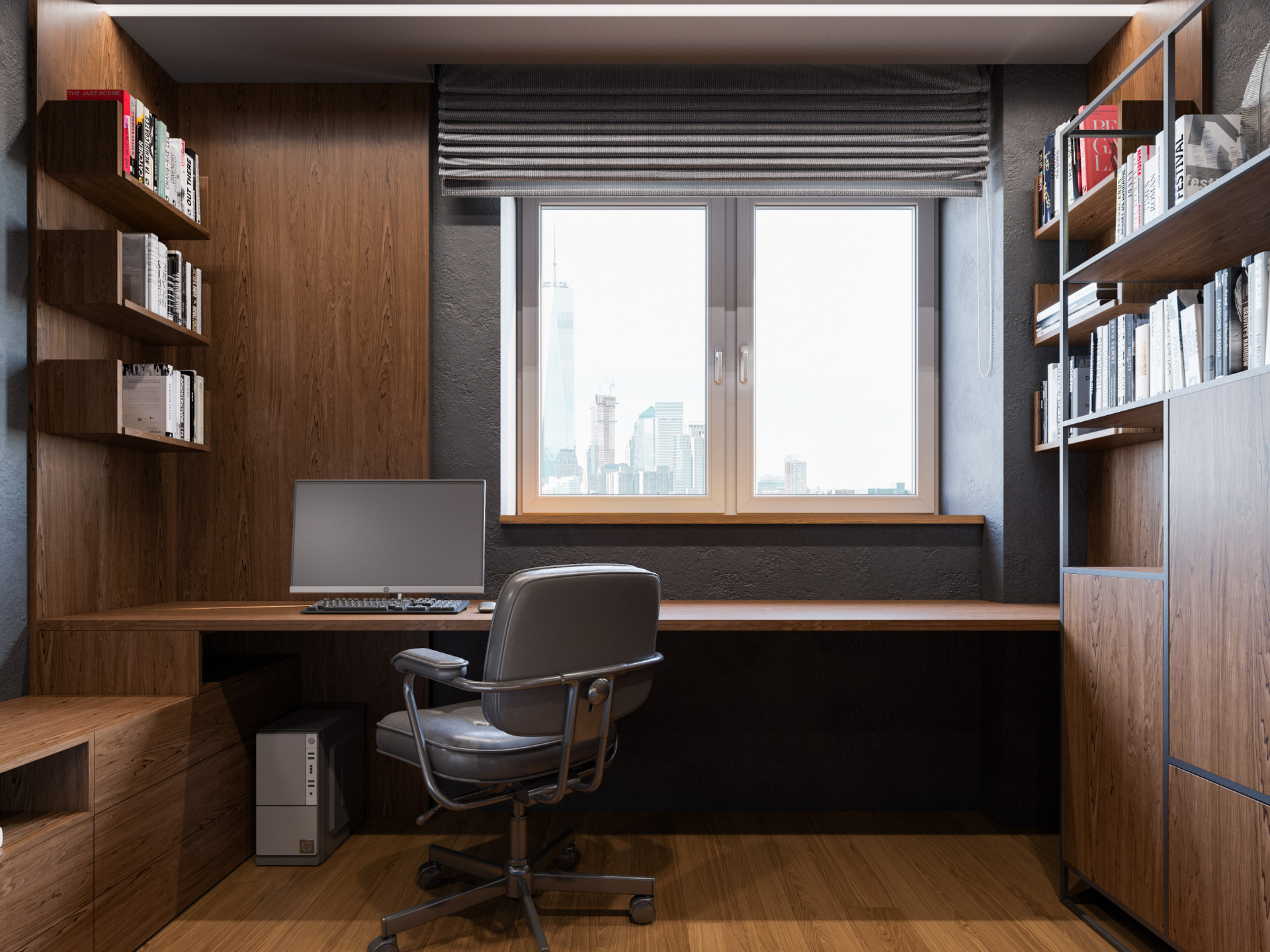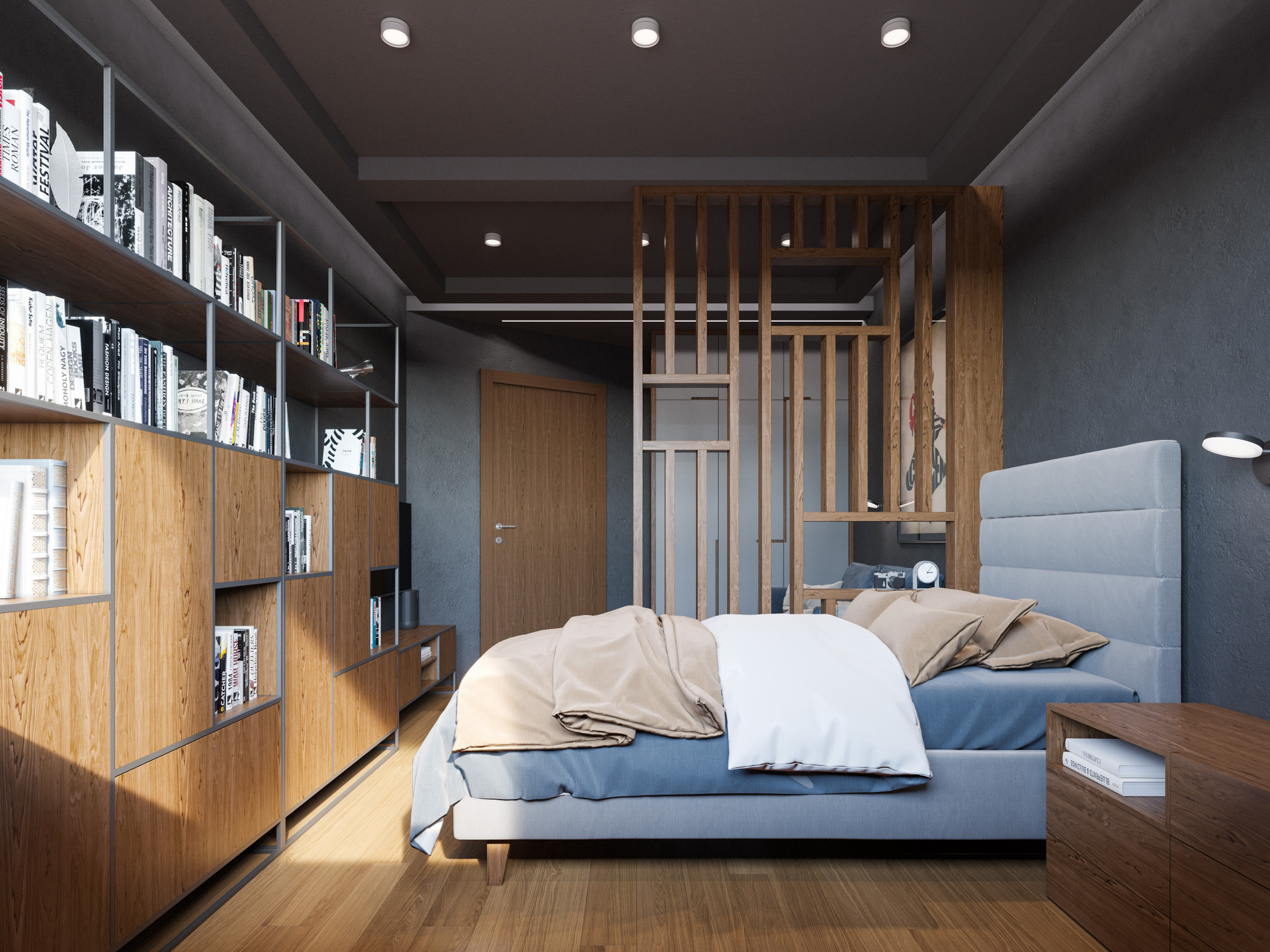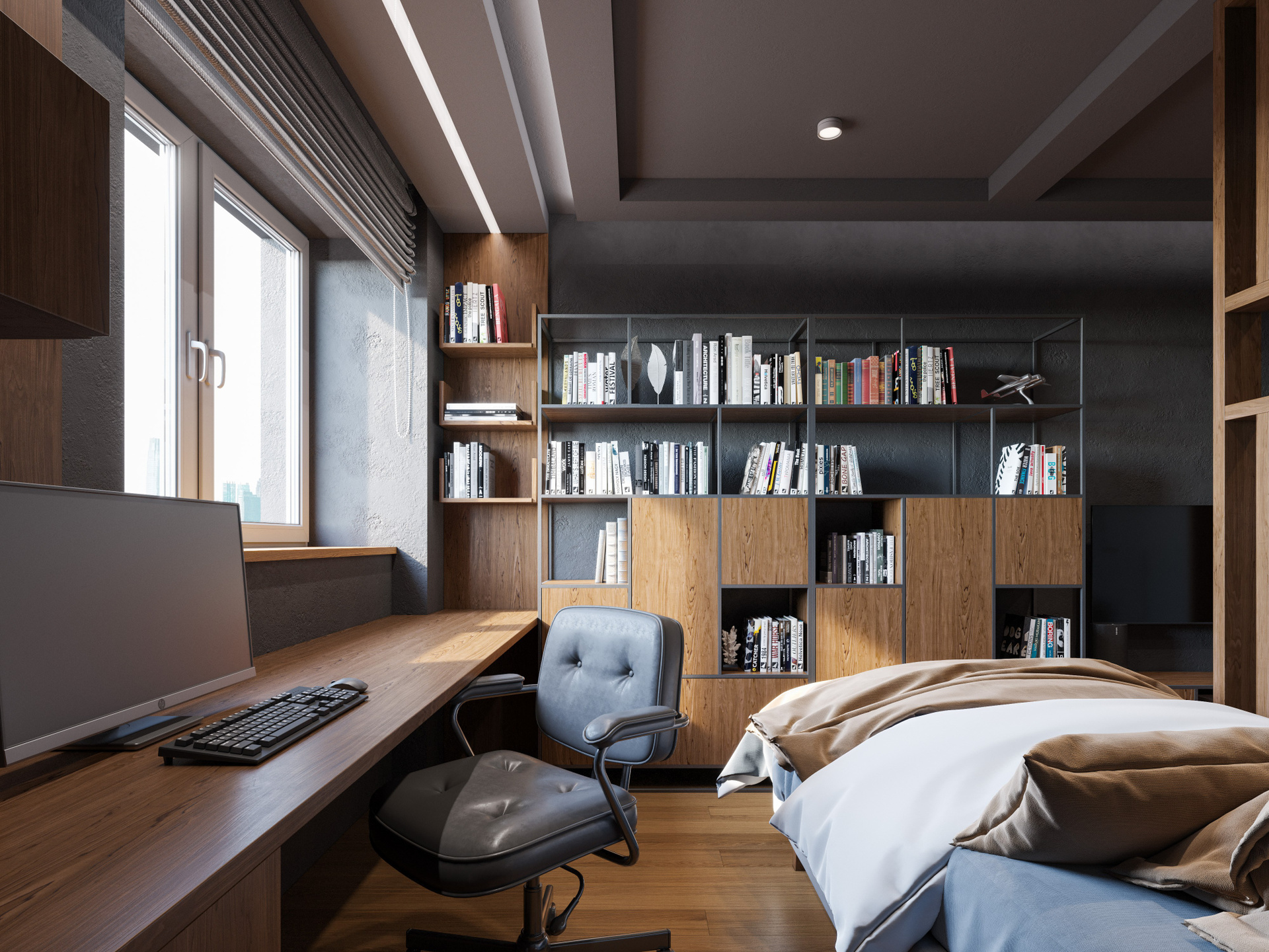 Вторая комната выполнена в более насыщенной и атмосферной стилистике. Здесь 3Д визуализатор интерьера сделал акцент на глубоком сером фоне и контрастных деревянных вставках. Большая рабочая зона интегрирована вдоль окна, создавая удобное место для учёбы или работы. Многофункциональная мебель и открытые стеллажи формируют структурированное пространство. Такие профессиональные интерьерные визуализации позволяют увидеть, как гармонично сочетаются графичные линии, текстуры дерева и мягкие текстильные поверхности.