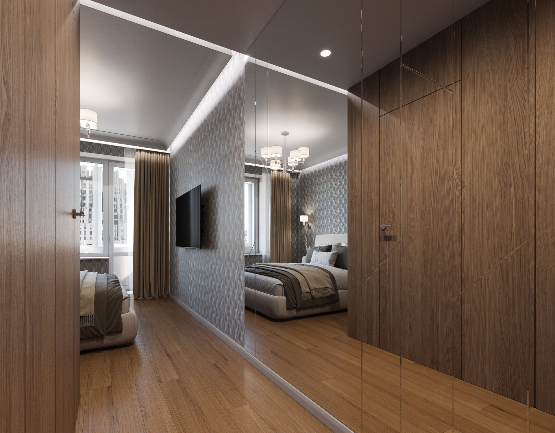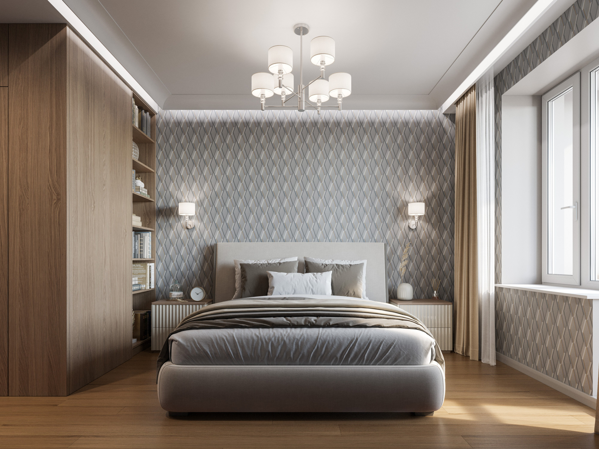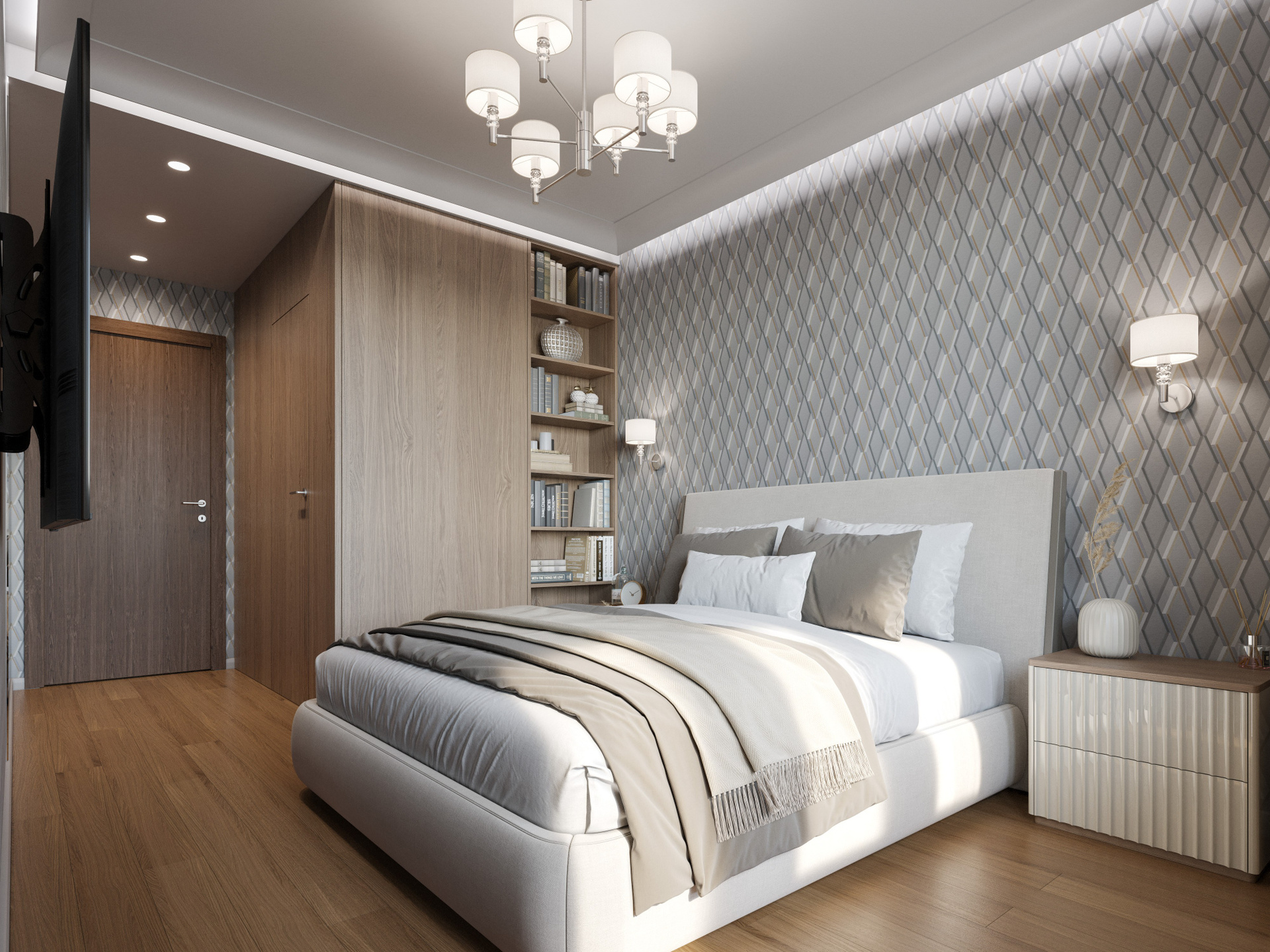 3D визуализация спальни передаёт атмосферу мягкого уюта благодаря теплой древесной отделке и текстильным акцентам. Монохромная палитра в сочетании с выразительным рисунком обоев создаёт объем и визуальный ритм. Плавный рассеянный свет подчеркивает архитектуру мебели, а интерьерные рендеры демонстрируют аккуратные фактуры тканей и покрывал. Гардеробный блок выполнен в современном минималистичном стиле, что усиливает ощущение порядка. Такой подход отражает создание фотореалистичных визуализаций интерьеров, где каждый элемент подчинён общей композиции.