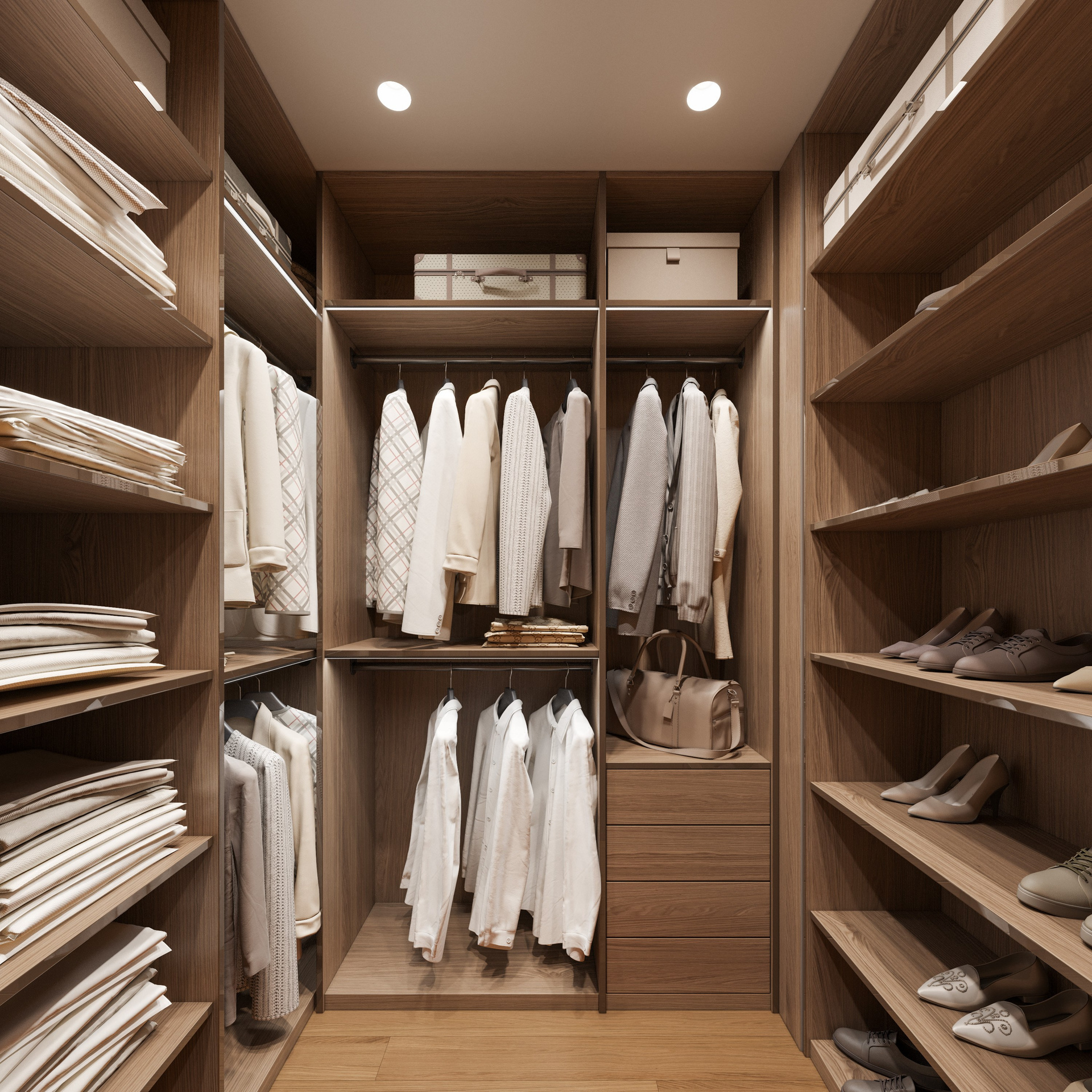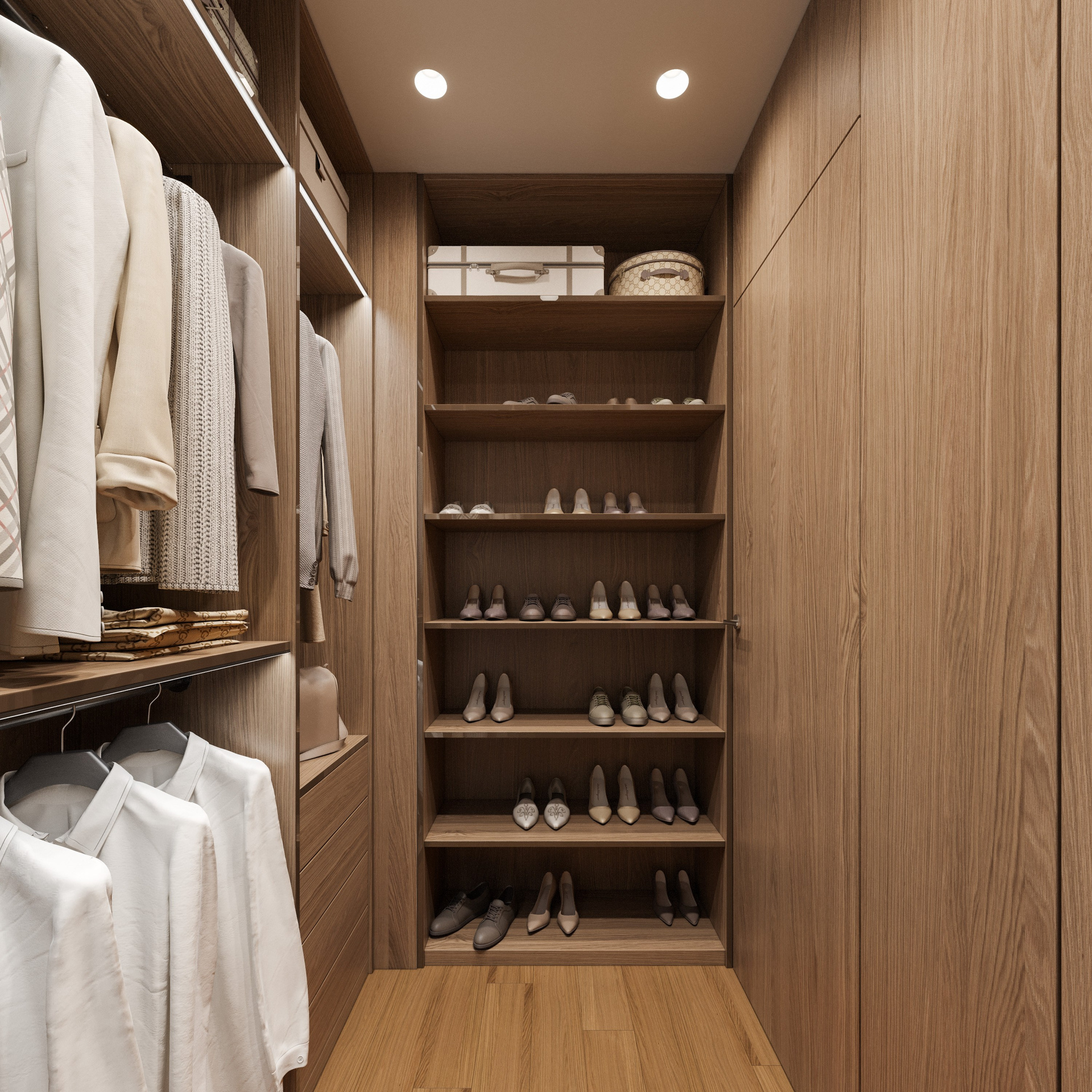 Гардеробная зона выполнена в тёплой древесной гамме. Открытые секции, регулируемые штанги и вместительные полки создают идеальное пространство для хранения. Авторская интерьерная визуализация подчёркивает глубину фактур и продуманность конструкции, делая помещение стильным и удобным. Аккуратная подсветка усиливает ощущение уюта и порядка.