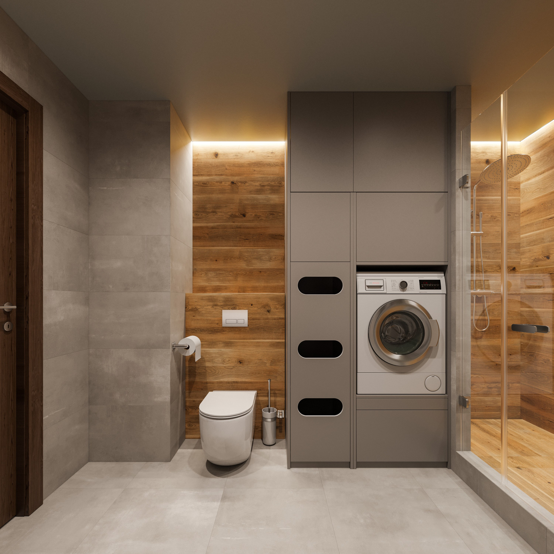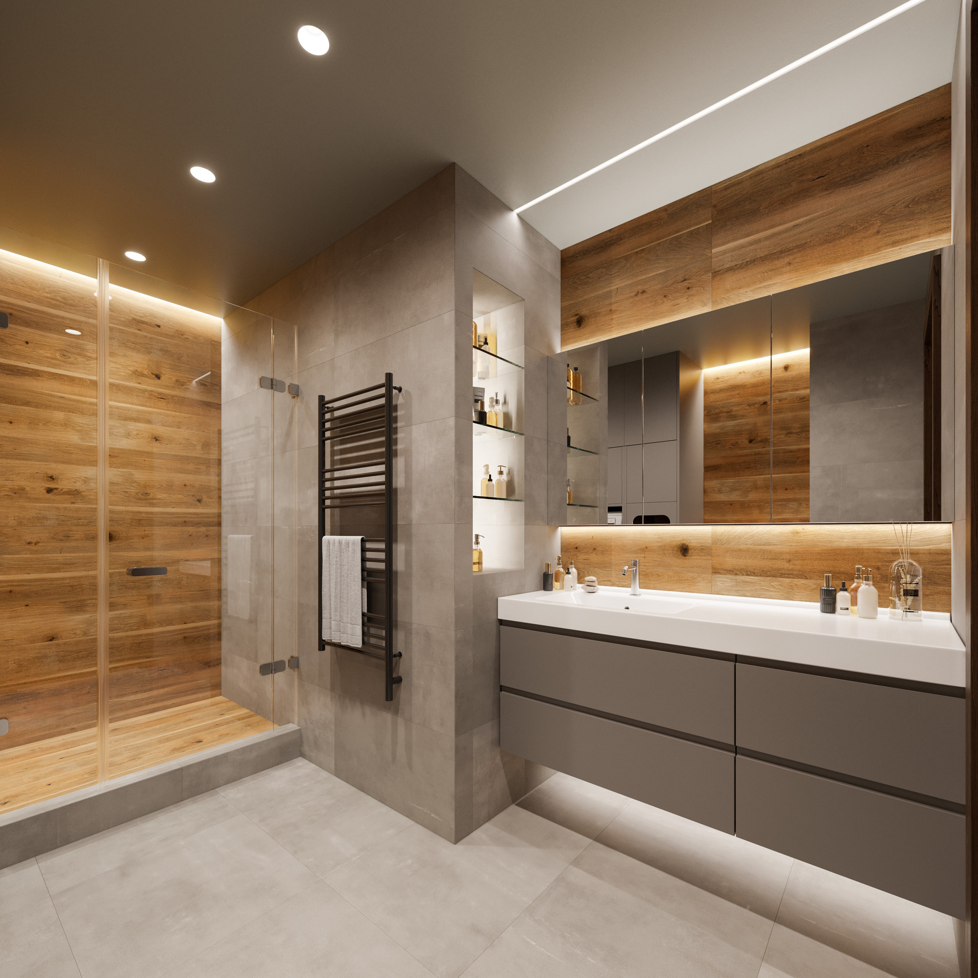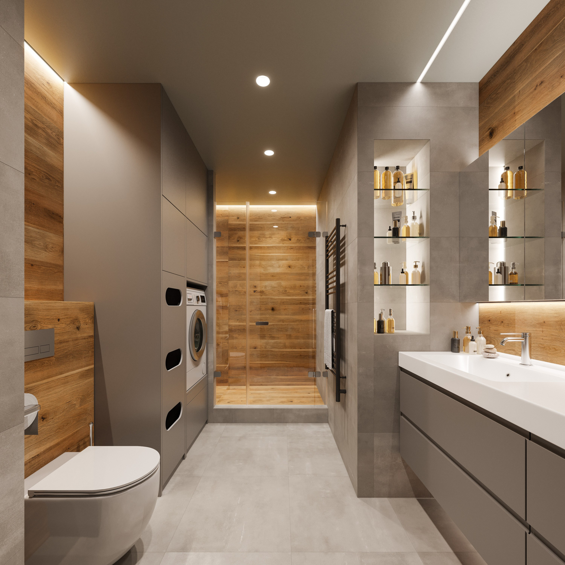 3D визуализация ванной комнаты демонстрирует сочетание теплого дерева и крупноформатного бетона. Пространство выглядит объёмным и организованным благодаря встроенным нишам, подсветке и стеклянным перегородкам. Душевая зона оформлена натуральными текстурами, что придаёт помещению SPA-характер. Интерьерные рендеры показывают точное взаимодействие света и материалов, создавая реалистичные интерьерные рендеры и подчёркивая современную 3D графику для интерьеров. Отдельное внимание уделено функциональности: размещение стиральной техники, систем хранения и сантехники продумано до мелочей.