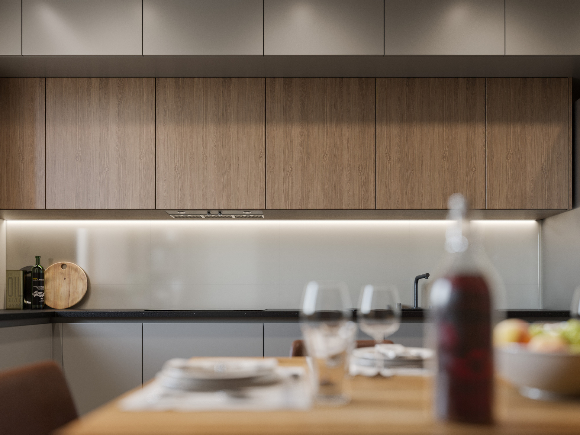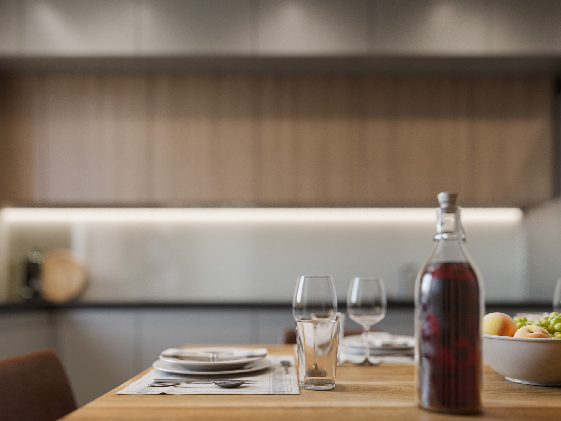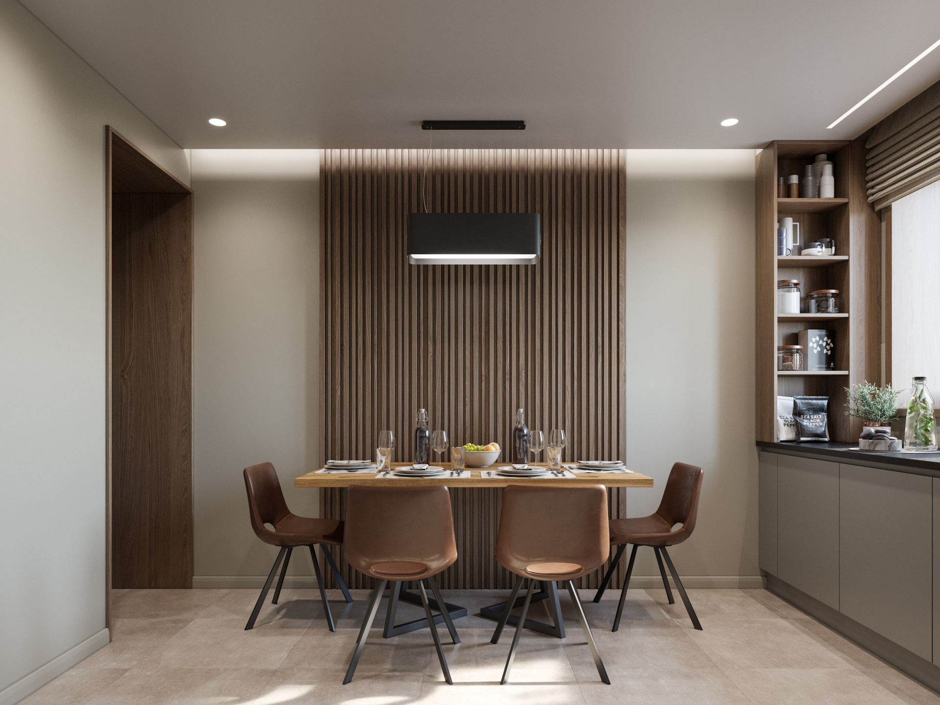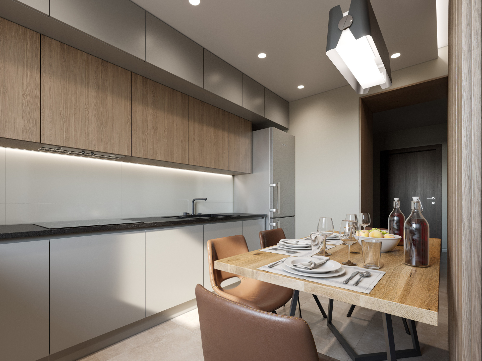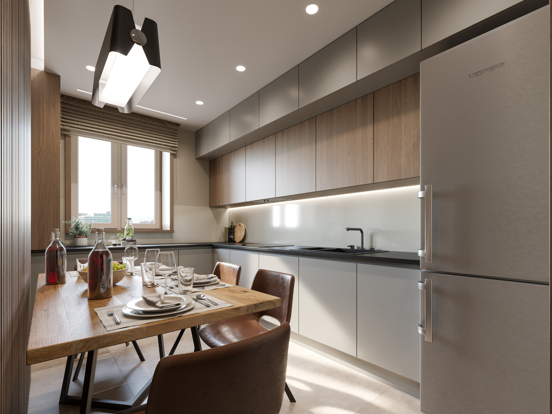 В пространстве кухни представлена 3D визуализация кухни-гостиной, выполненная в спокойной палитре с сочетанием древесных текстур и мягких серых фасадов. Продуманная композиция шкафов и встроенной техники создаёт удобную рабочую среду. Интерьерные рендеры высокого качества подчёркивают натуральное освещение, гладкие поверхности и аккуратные линии мебели. Обеденная зона оформлена в едином стиле — массивная столешница и практичные стулья образуют уютный центр для семейных встреч. Здесь ощущается стремление к функциональности без перегруженности деталями, что делает пространство особенно гармоничным.