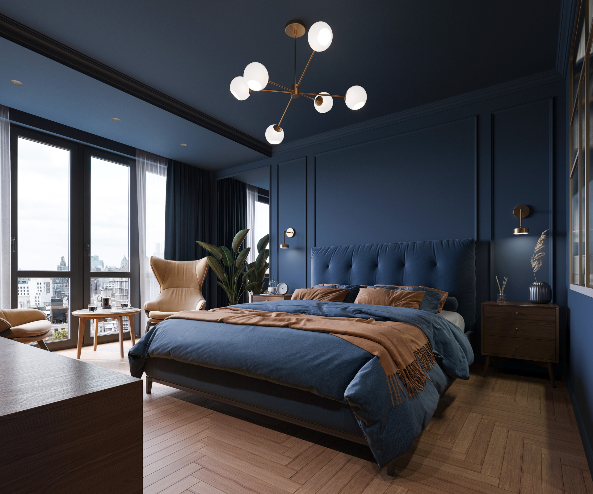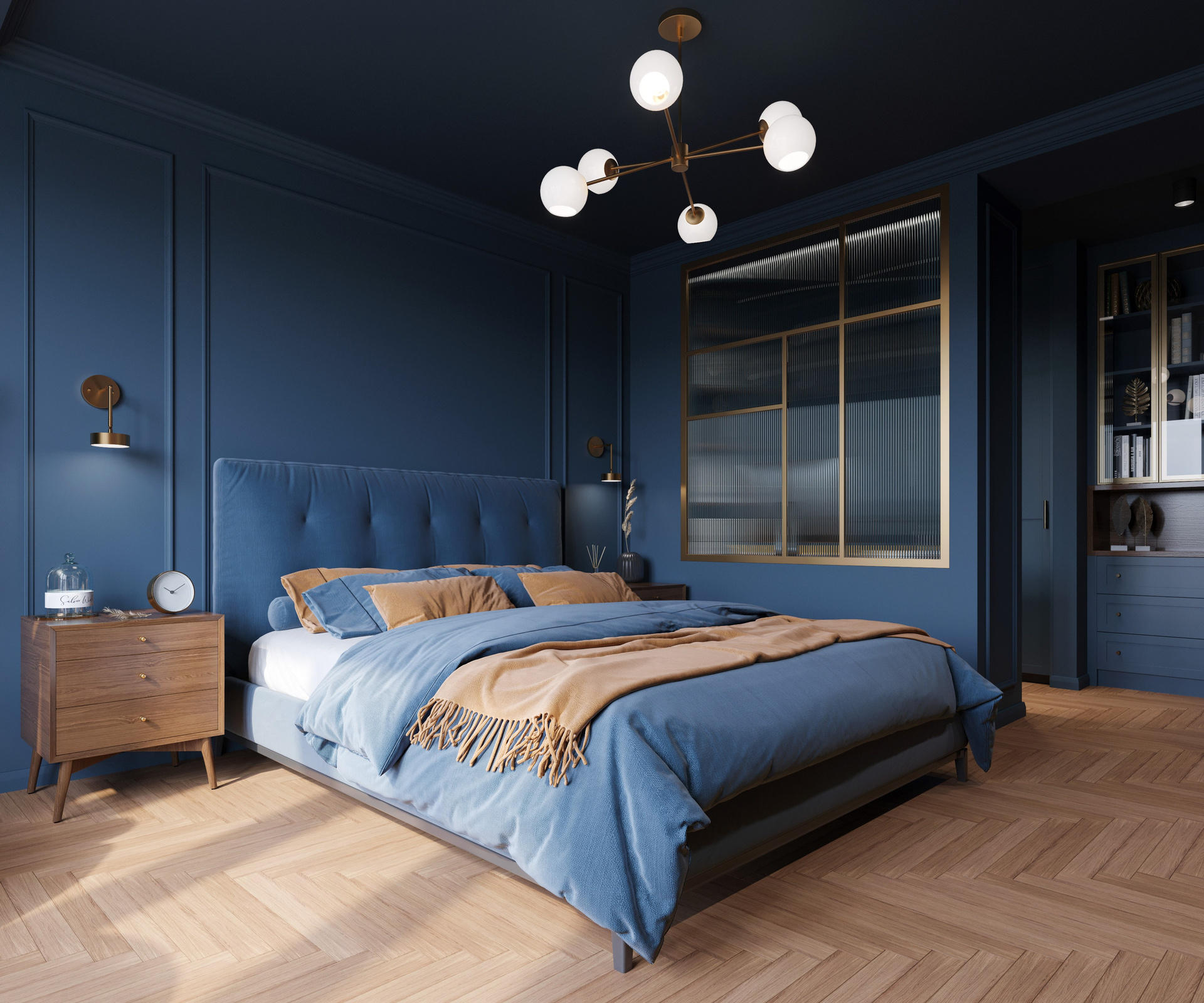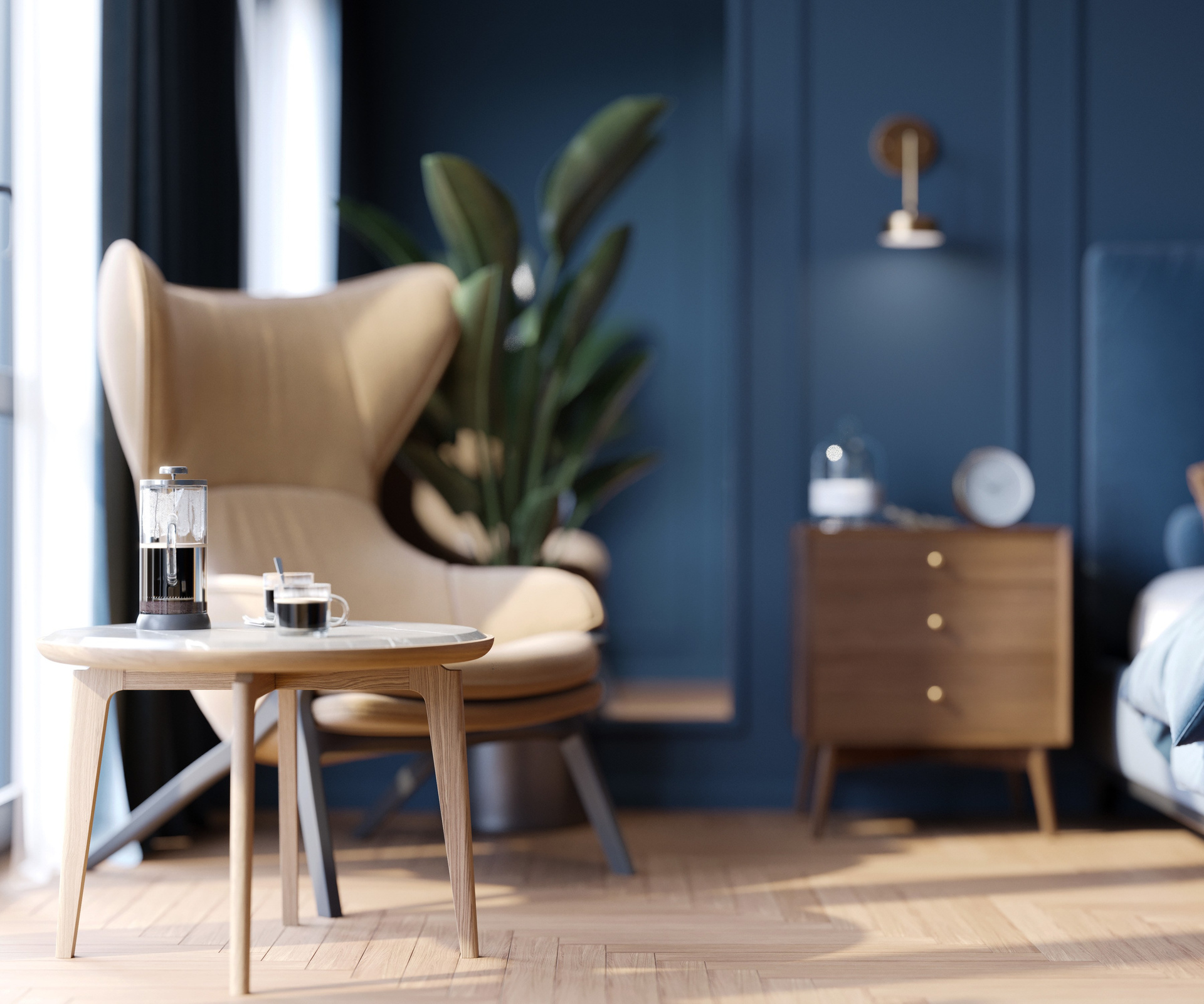 В проекте Синергия визуализация подчеркивает выразительный характер пространства: насыщенный тёмно-синий объём, теплые природные материалы и мягкие акценты света создают цельную атмосферу. Каждая сцена выстроена через внимательную работу с деталями и грамотное освещение, формируя убедительную и живую 3D визуализацию интерьера.