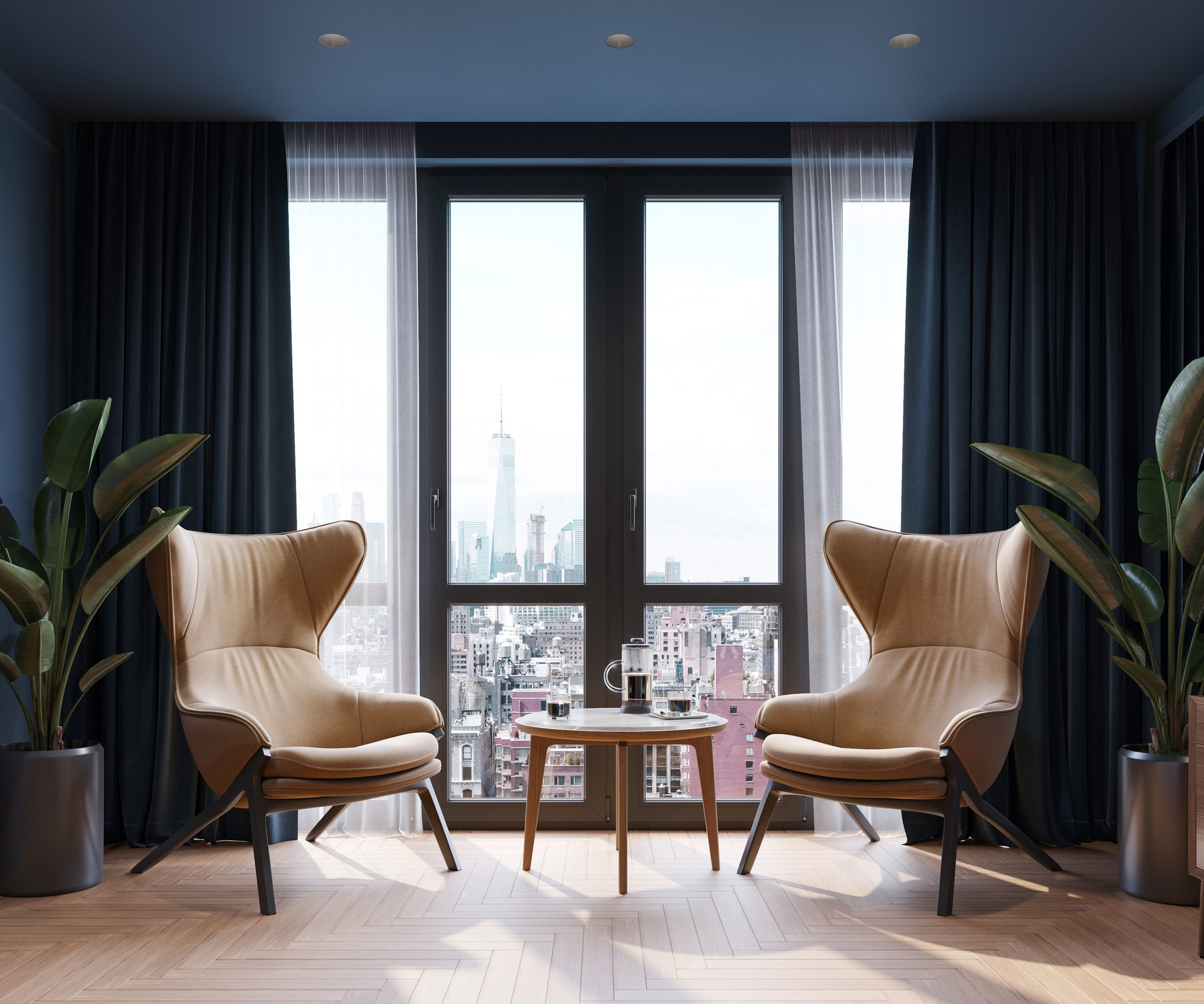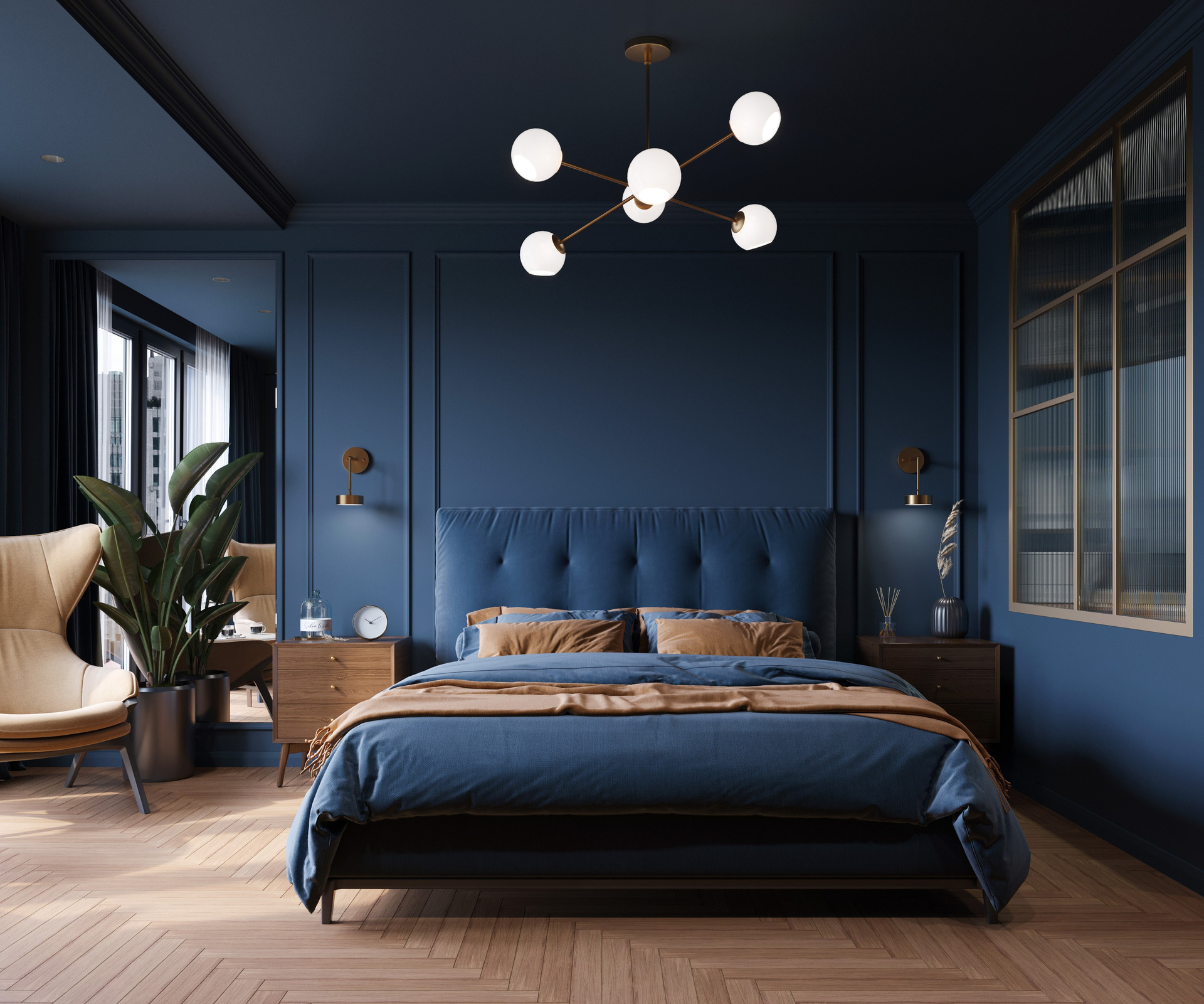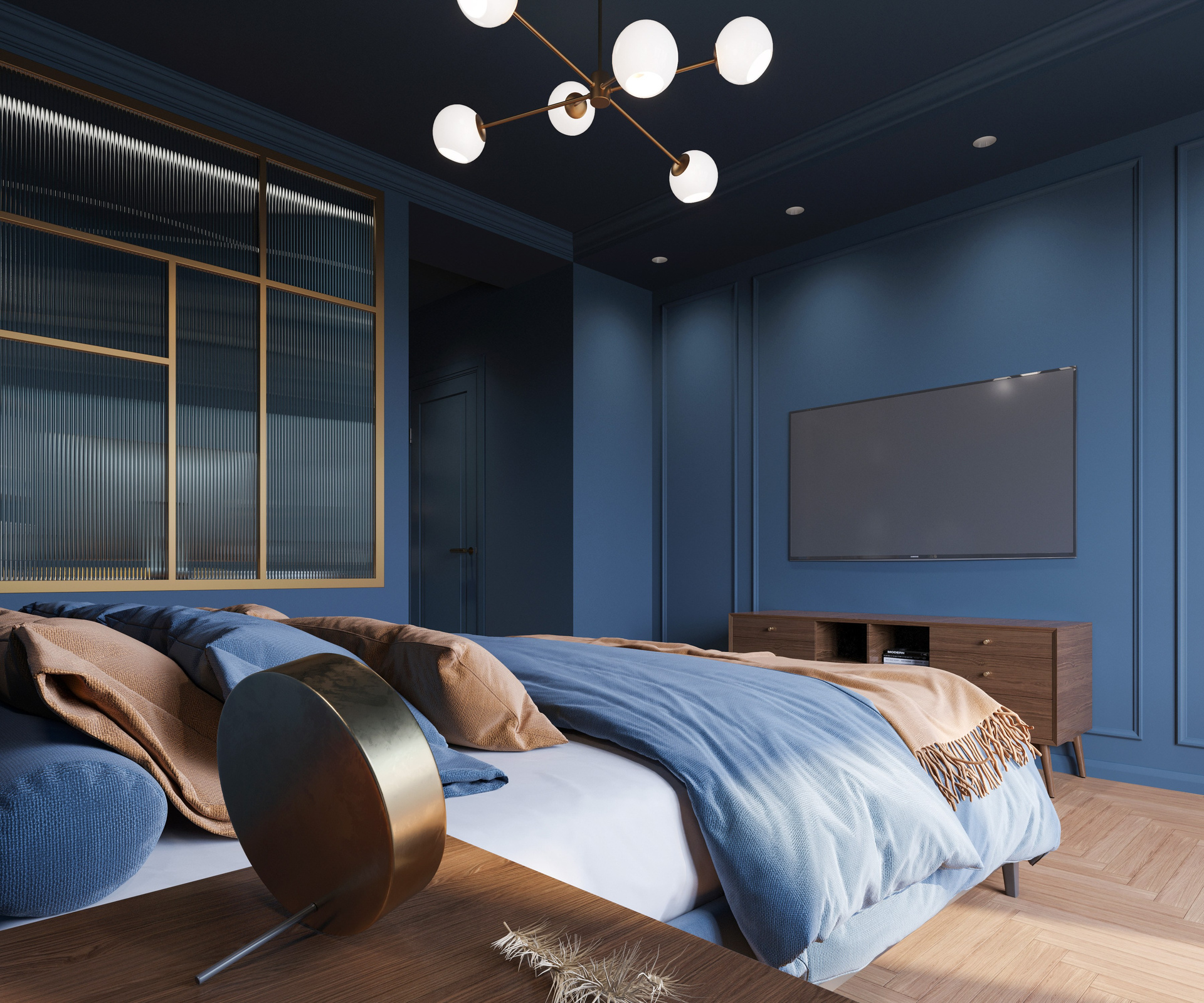 В проекте Синергия визуализация подчеркивает выразительный характер пространства: насыщенный тёмно-синий объём, теплые природные материалы и мягкие акценты света создают цельную атмосферу. Каждая сцена выстроена через внимательную работу с деталями и грамотное освещение, формируя убедительную и живую 3D визуализацию интерьера.