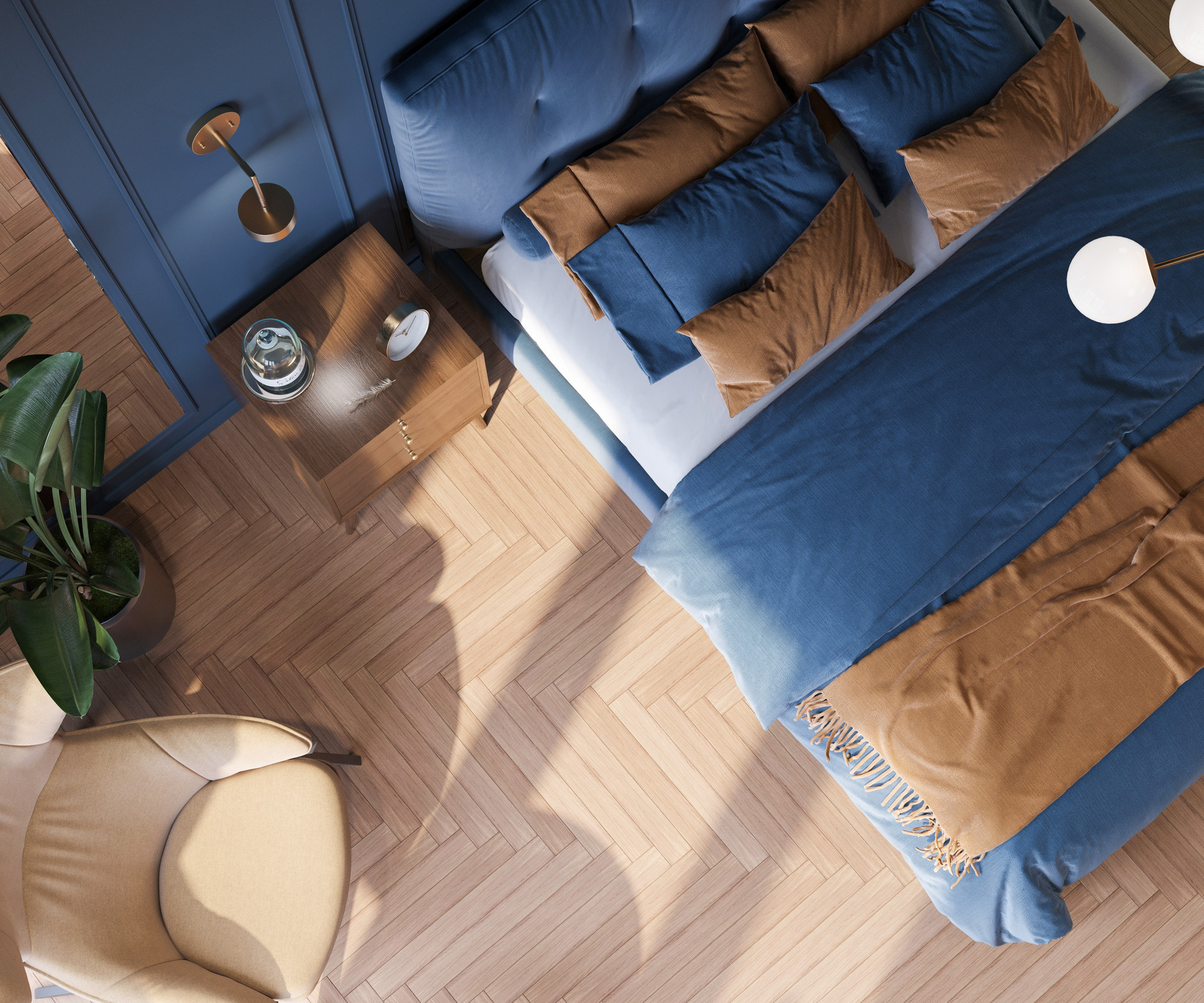 Спальня раскрывает другой сценарий: тут важны пластика стеновых панелей, объём мягкого изголовья и спокойный ритм декоративных светильников. Такая композиция подчёркивает потенциал пространства, который становится особенно выразительным через рендер интерьера.