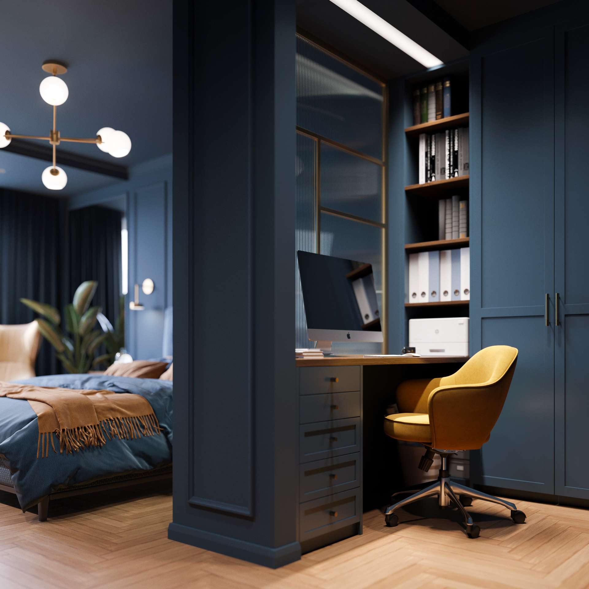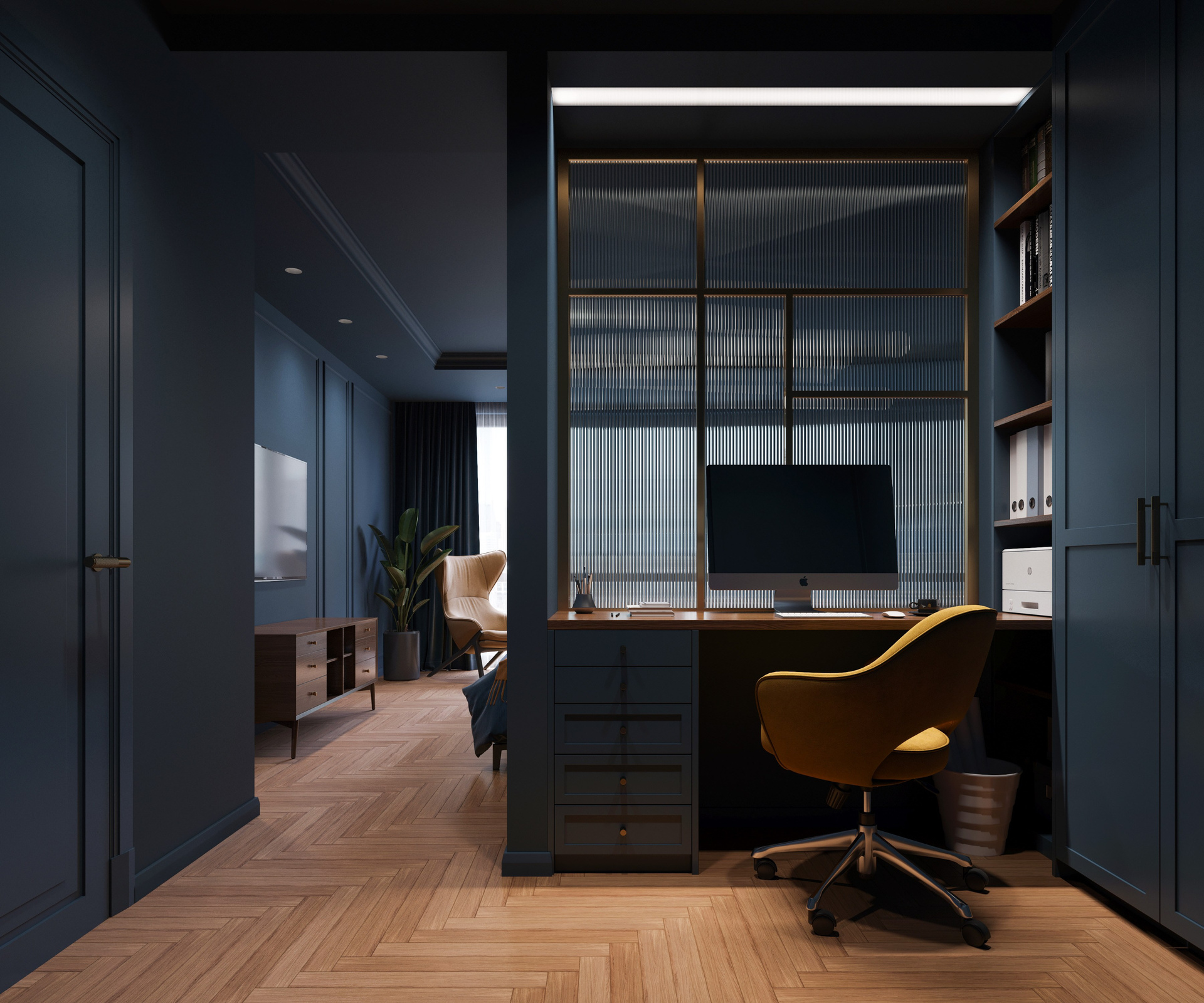 Кабинет, интегрированный в приватный блок, выполнен в той же палитре, что создаёт визуальную связанность помещений. Полузакрытая ниша с матовыми стеклами и подсветкой подчёркивает продуманную эргономику. Благодаря визуализации мебели и отделки можно оценить точность стыков, удобство хранения и реальное поведение материалов под различным светом.