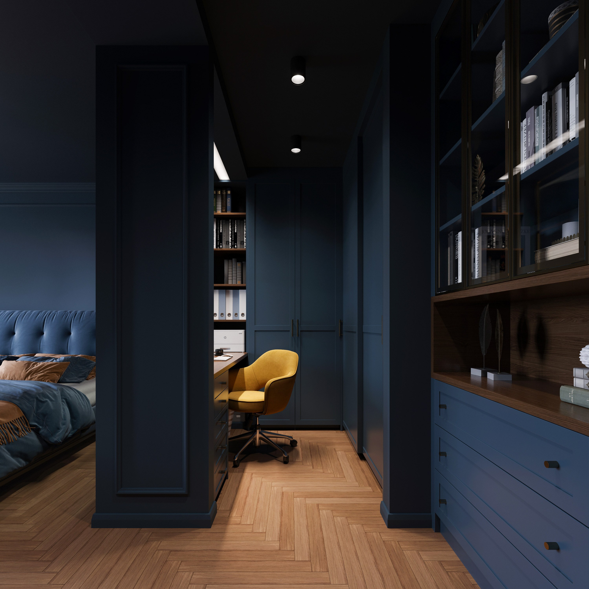 Проект Синергия строится вокруг сочной тёмно-синей палитры, которая формирует характер интерьера и задаёт эмоциональный ритм всем помещениям. Монохромные плоскости стен и потолка создают ощущение защищённости, а точная работа с пропорциями становится видимой благодаря детальной прорисовке материалов. Мягкие акценты в виде теплых древесных фактур усиливают баланс и наглядно демонстрируют подход, который возможен через визуализацию интерьера по планировке.