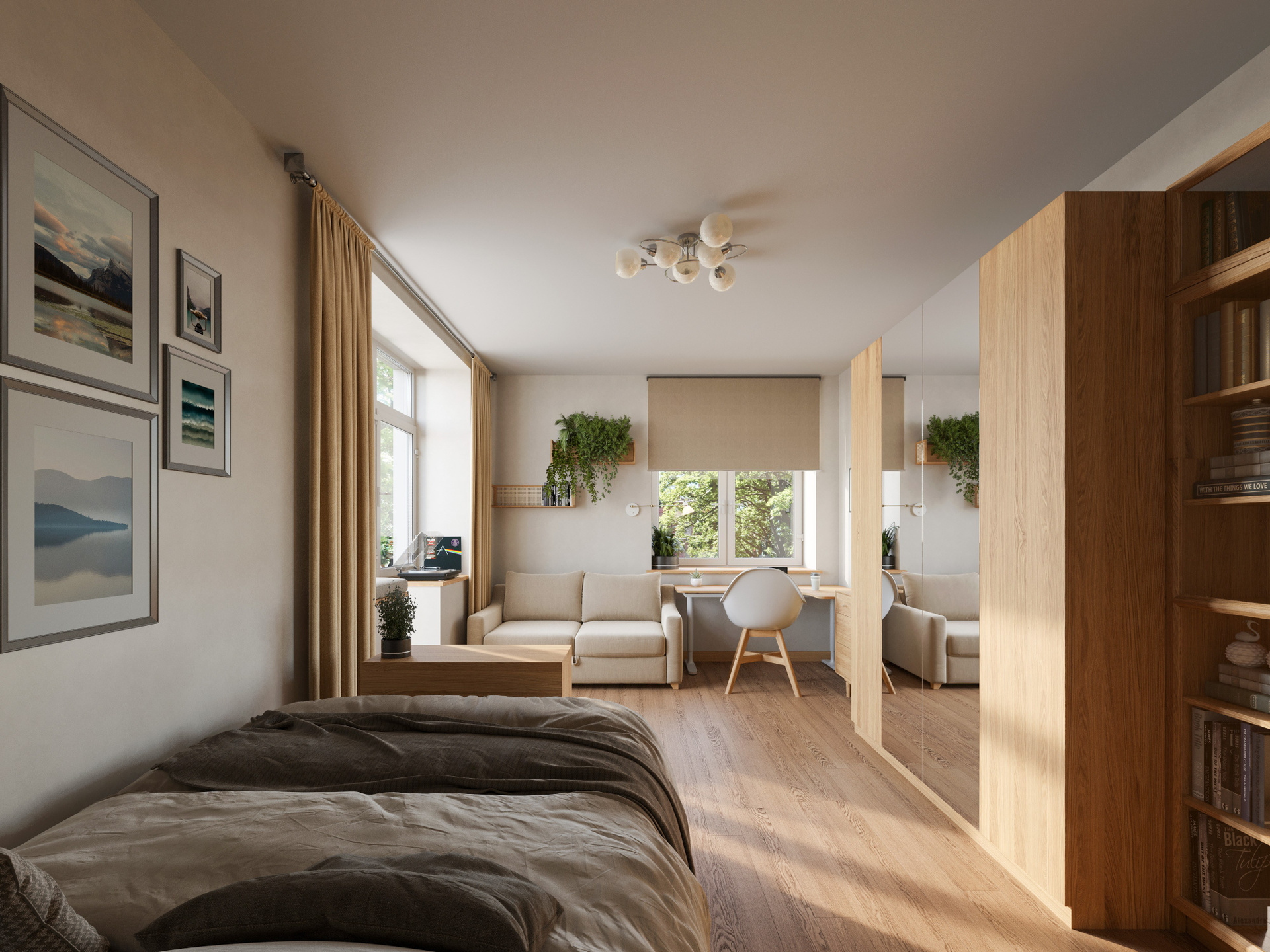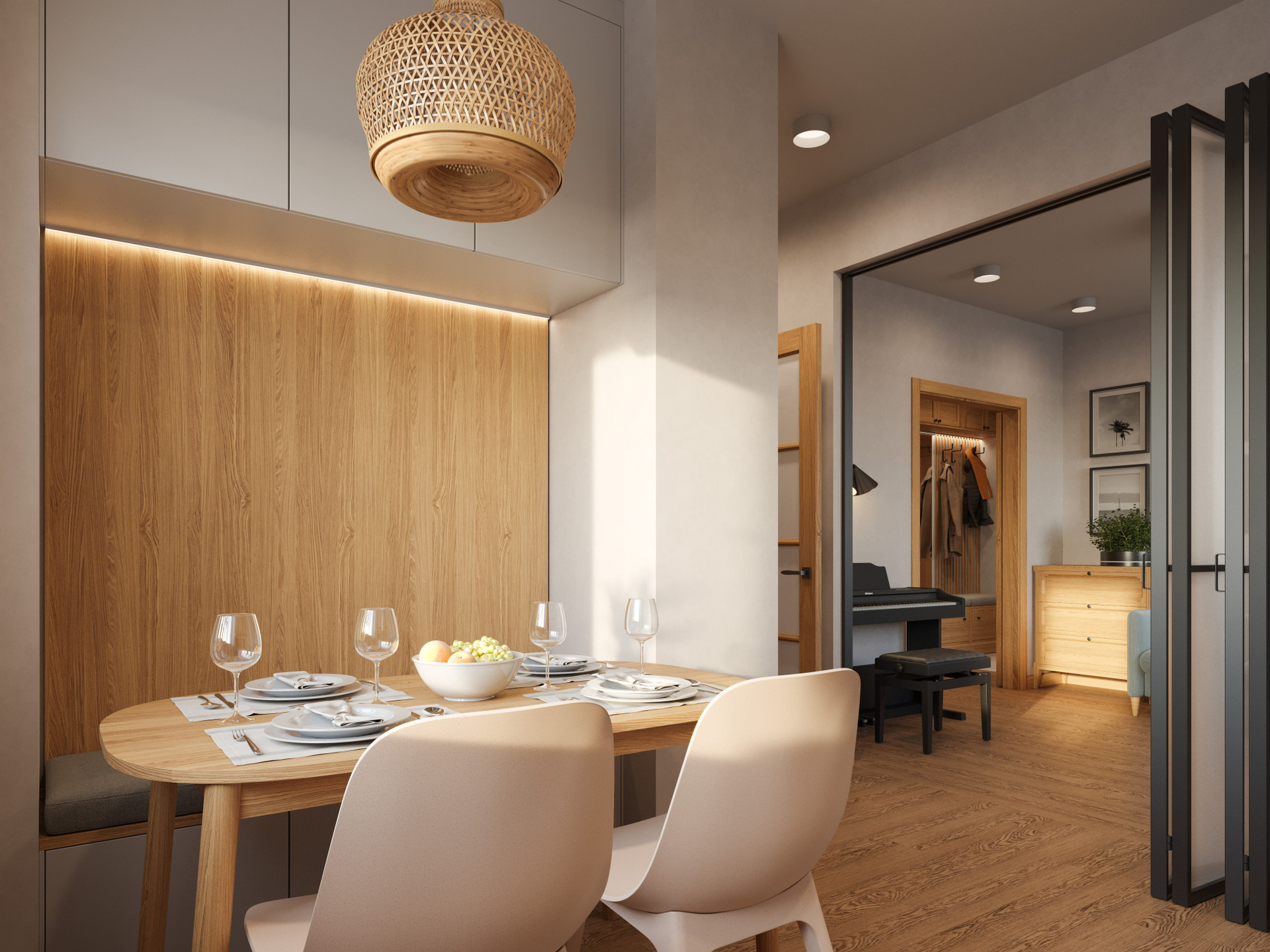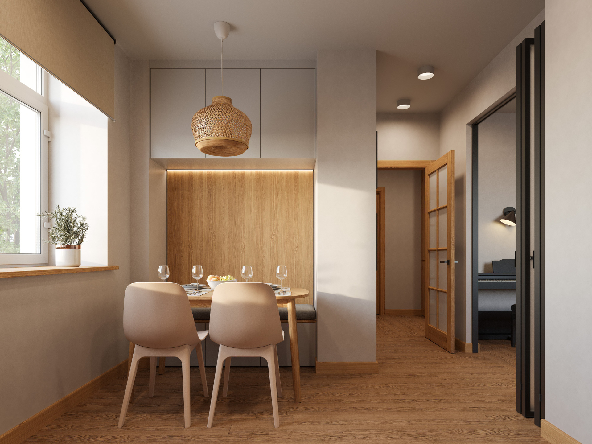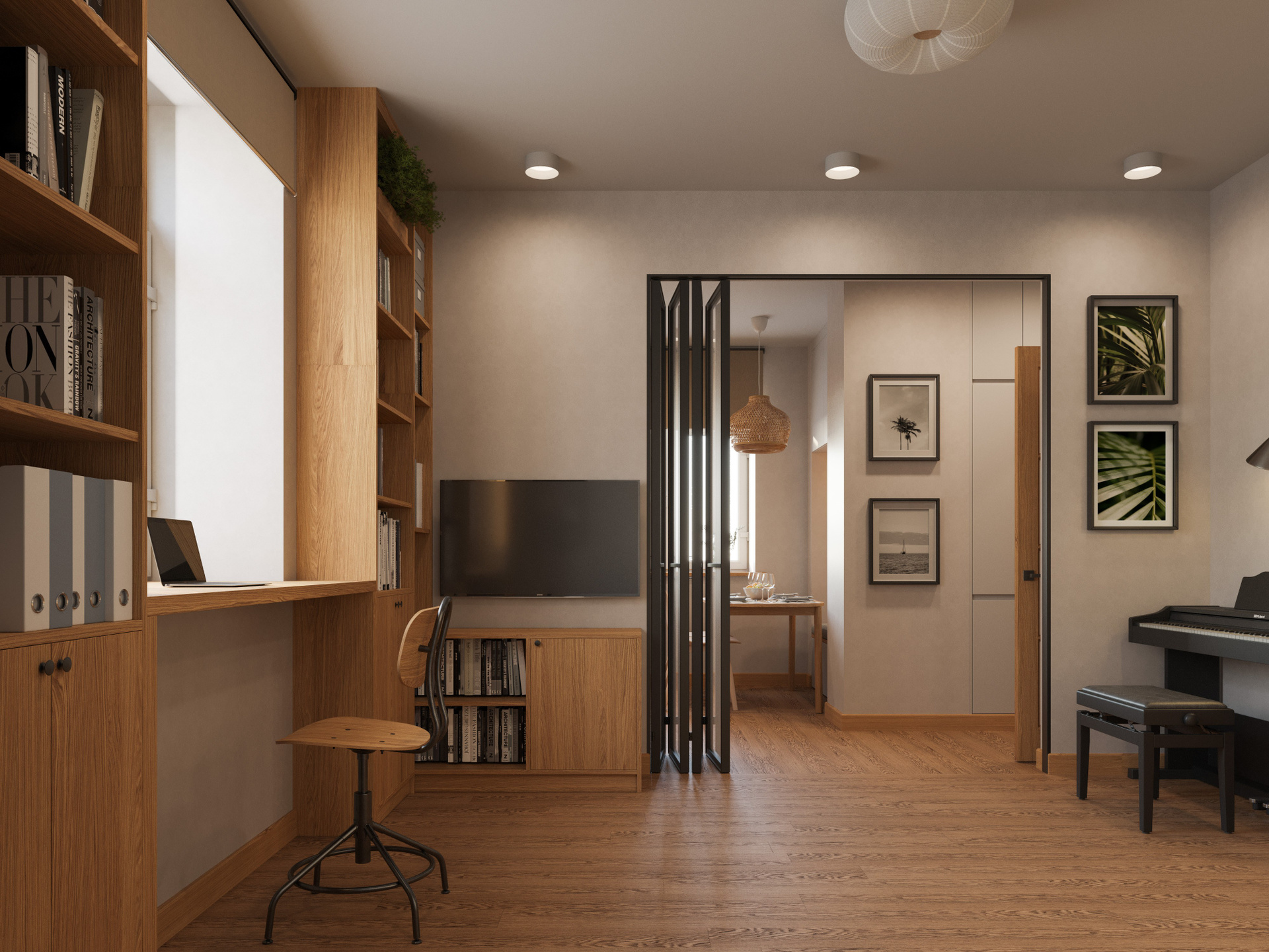 Этот проект демонстрирует, как визуализация интерьера позволяют передать мягкую домашнюю атмосферу с акцентом на дерево, свет и комбинированные фактуры. Гармоничная композиция помещений, тщательная работа с рассеянным освещением и текстурами подчеркивают авторский стиль и создают цельный образ уютной квартиры.
