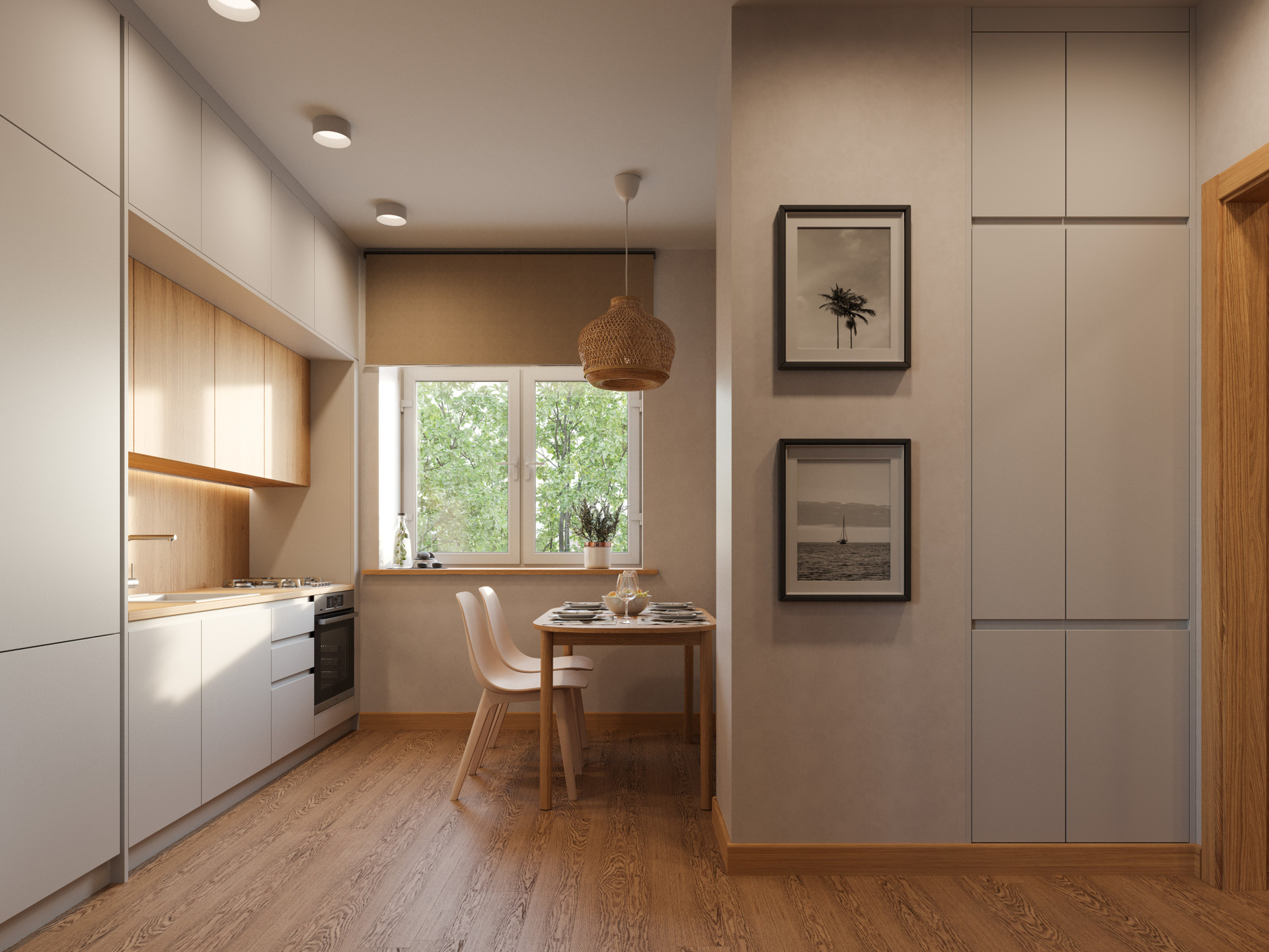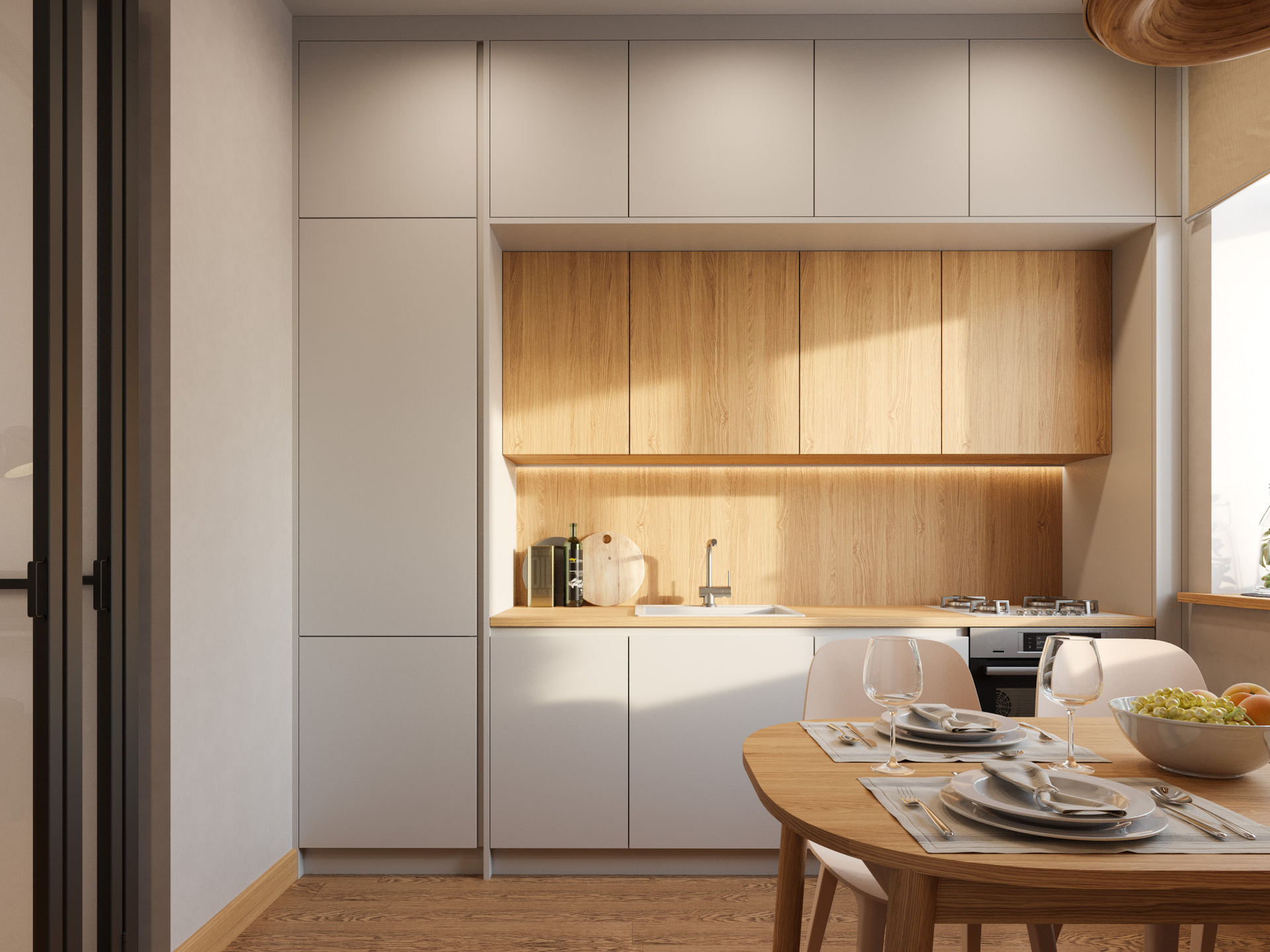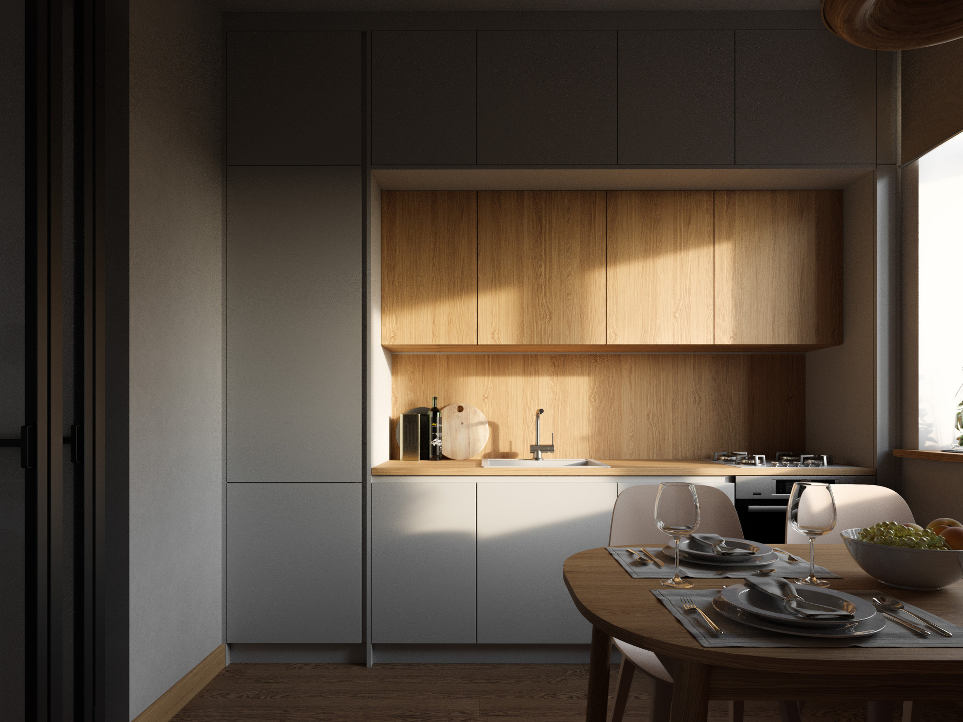 3D визуализация кухни-гостиной выполнена в спокойной минималистичной стилистике: сочетание матовых фасадов, древесного шпона и мягких оттенков стен создаёт визуально чистое пространство. Лаконичные линии, встроенная техника и аккуратный теплый свет формируют атмосферу домашнего уюта. Визуализация дизайна интерьера позволяет детально показать, как свет отражается от поверхностей, подчеркивая фактуру дерева и объём мебели. Здесь особенно важна работа с естественным освещением — Corona Renderer передает его мягко и деликатно.