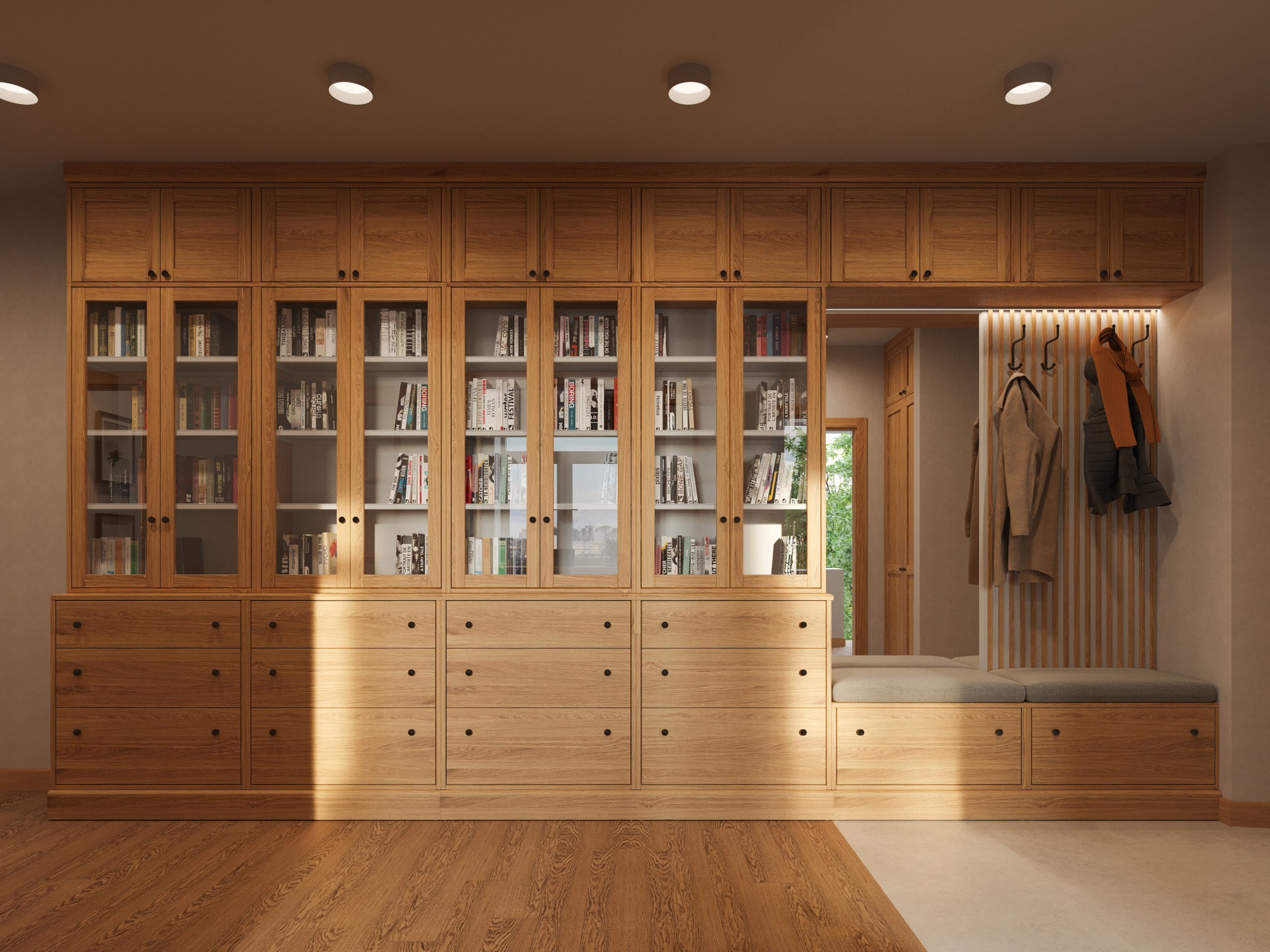 Интерьер открывается спокойной, выдержанной зоной прихожей, где доминируют натуральные древесные оттенки и продуманная система хранения. Фотореалистичная визуализация интерьера демонстрирует, как встроенные шкафы, мягкая скамья и акцентные рейки создают гармоничную и функциональную композицию. Здесь важна чистая геометрия, ровный тёплый свет и аккуратный визуальный ритм полок — всё это передано с помощью 3D визуализации в Corona Renderer. Использование натуральных материалов и грамотное освещение задают уют проекту, подчеркивая его атмосферность и демонстрируя потенциал таких решений в интерьерных рендерах высокого качества.