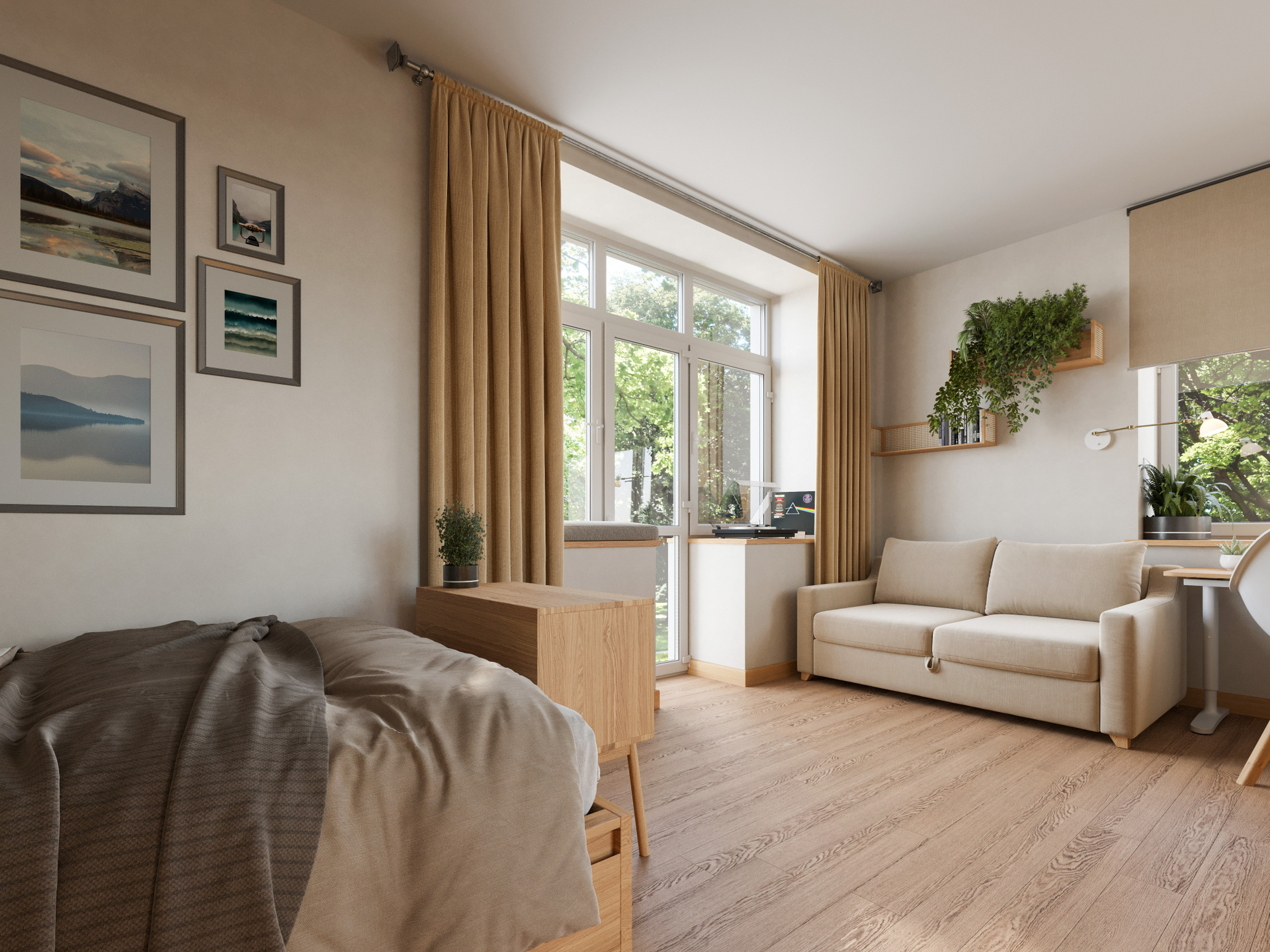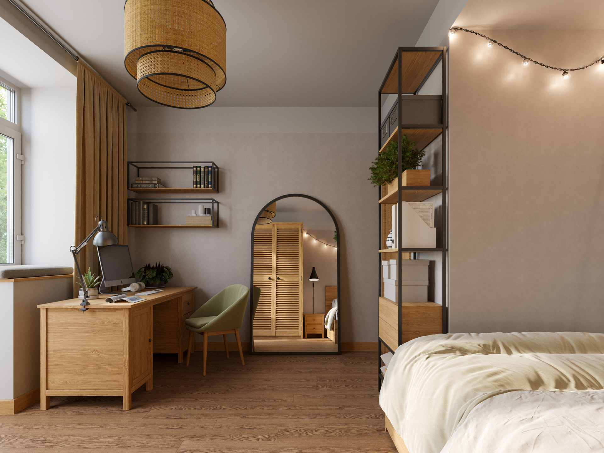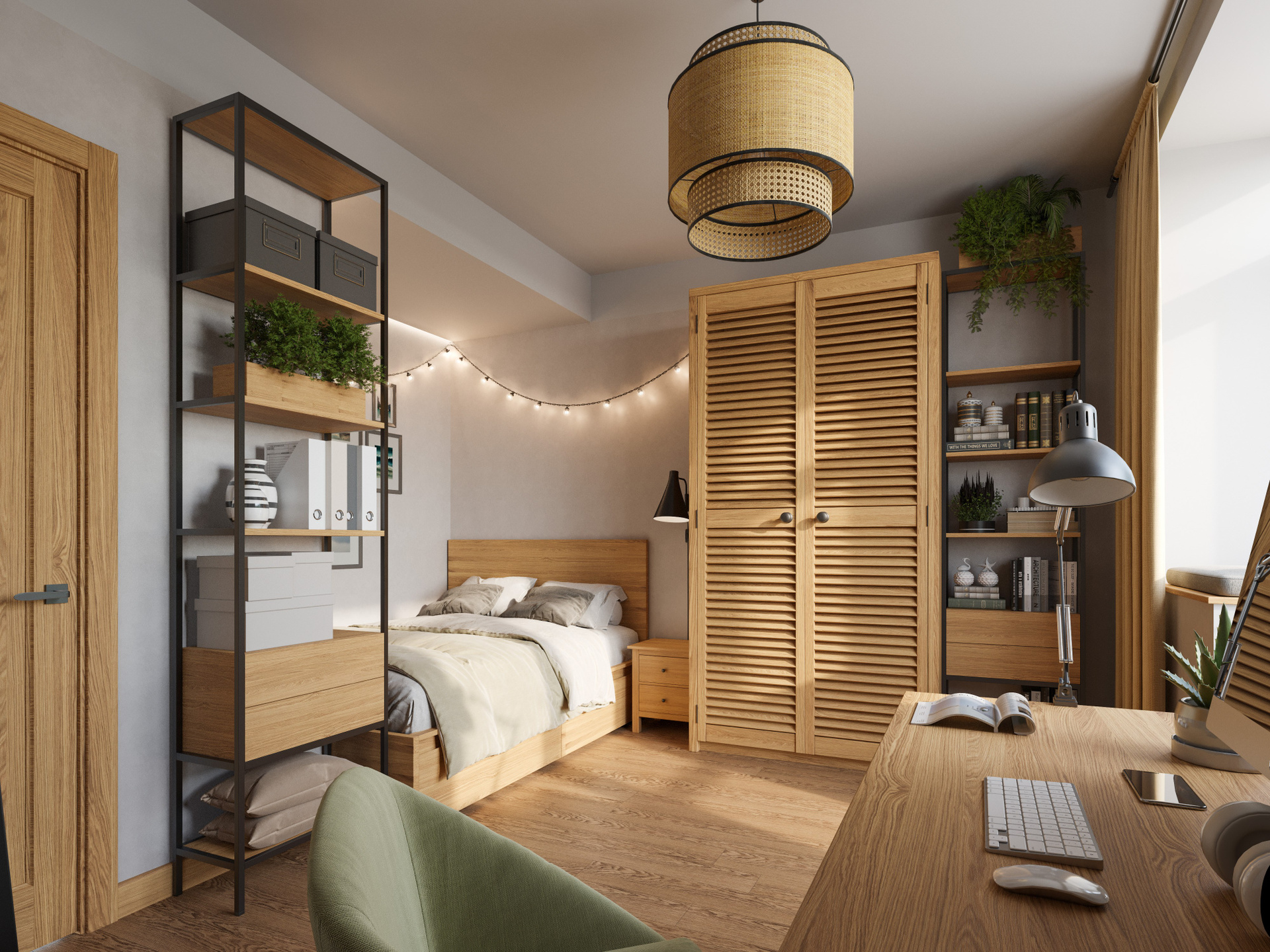 В спальнях доминируют спокойные натуральные палитры, много текстиля и мягкий рассеянный свет. 3D визуализатор интерьера показывает тонкие переходы света и тени на деревянных стеновых панелях, мягких изголовьях и шторах плотной фактуры. В интерьере нет излишних акцентов — только тактильность, тепло и спокойствие. Создание фотореалистичных интерьеров здесь направлено на демонстрацию уюта и частной атмосферы, которую сложно передать иначе, чем через детальные реалистичные интерьерные рендеры.