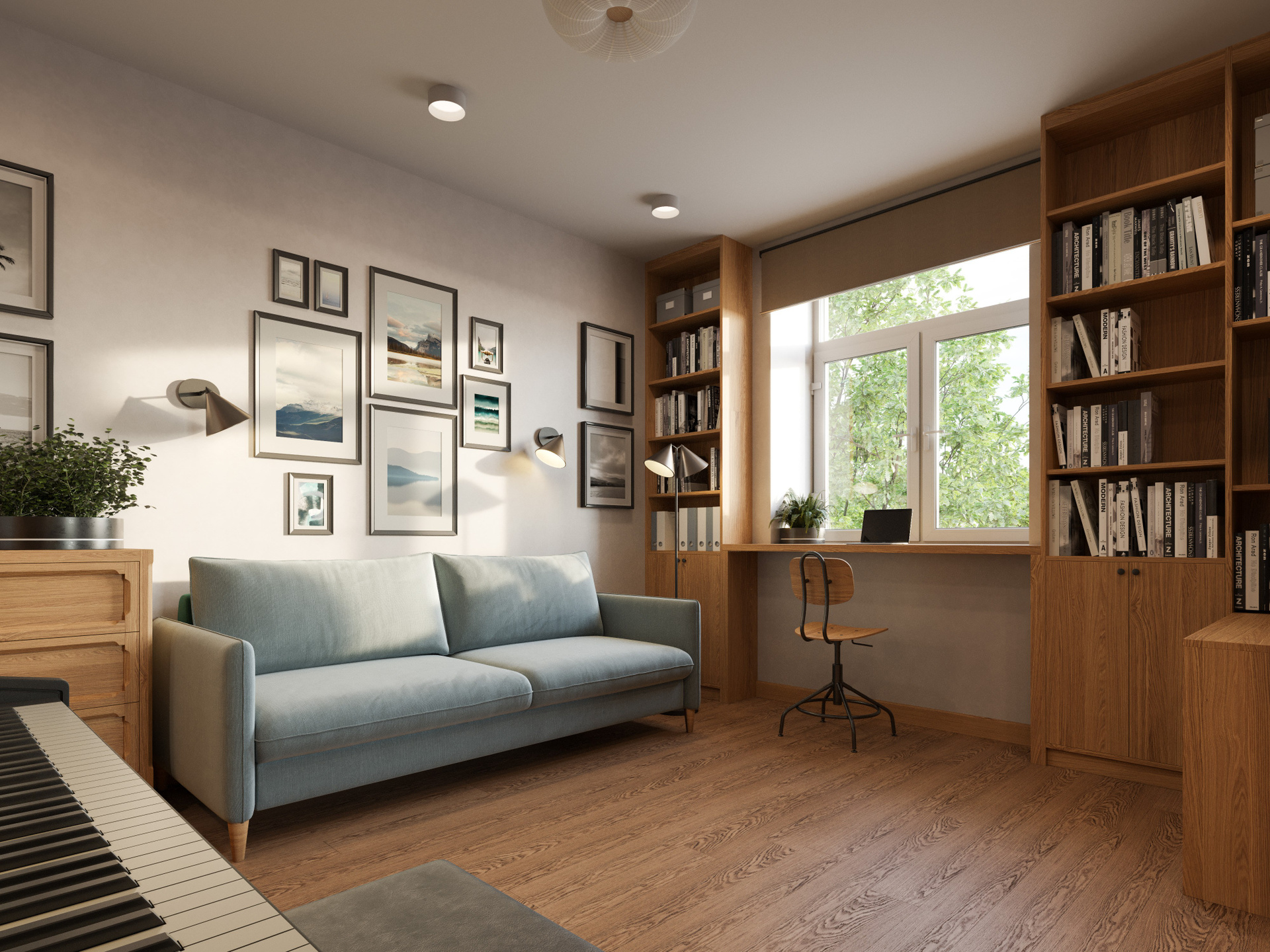В зоне гостиной особое внимание уделено рабочему пространству, встроенным стеллажам и галерейной развеске на стене. Интерьерные рендеры показывают комфортную интеграцию рабочего места в жилую среду без перегруженности и визуального шума. Мягкий диван, открытые полки и нотки скандинавской простоты переданы через современную 3D графику для интерьеров, создающую мягкие блики, реалистичные текстуры и естественный свет. Гармония между рабочей и жилой зонами достигается благодаря авторской композиции и чёткой передаче фактур, что особенно заметно в профессиональных интерьерных визуализациях.