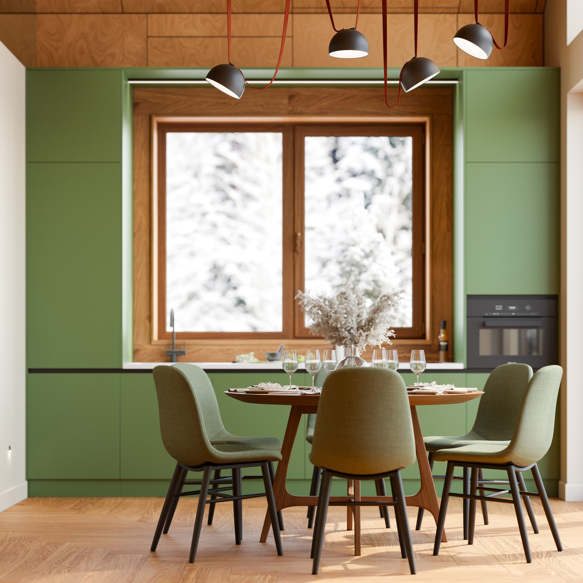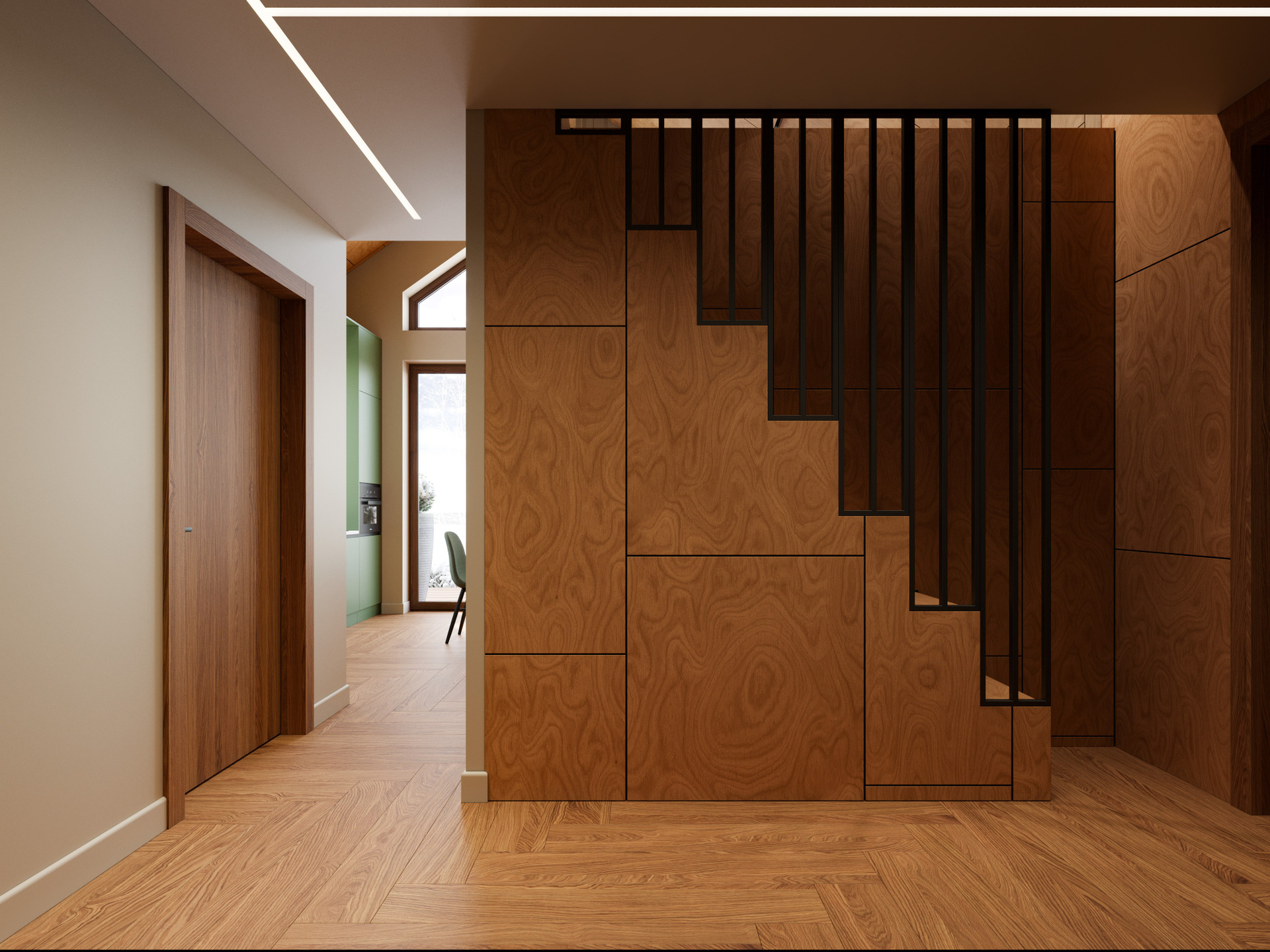 Интерьер построен на сочетании тёмного и светлого дерева, матовых поверхностей, камня и текстиля. Деревянные панели на стенах и потолке создают визуальную ритмику и усиливают природный характер дома. Кухня выполнена в выразительном зелёном оттенке, поддерживающем природную концепцию. Каменные поверхности и металлические акценты добавляют структуру и лёгкую брутальность. Благодаря интерьерным рендерам высокого качества зритель видит, как материалы раскрываются в естественном освещении, отмечая их глубину и текстуру.