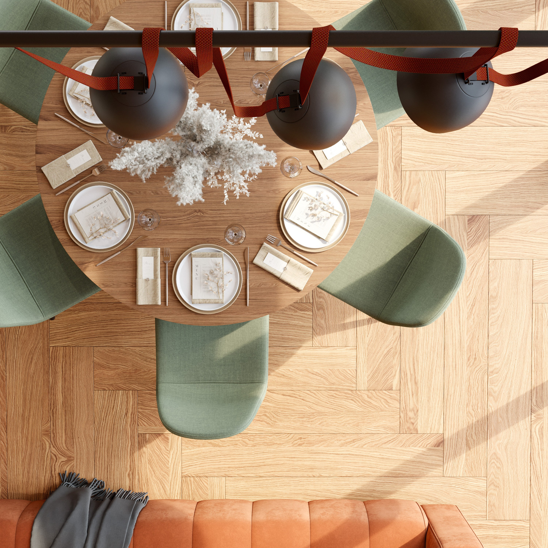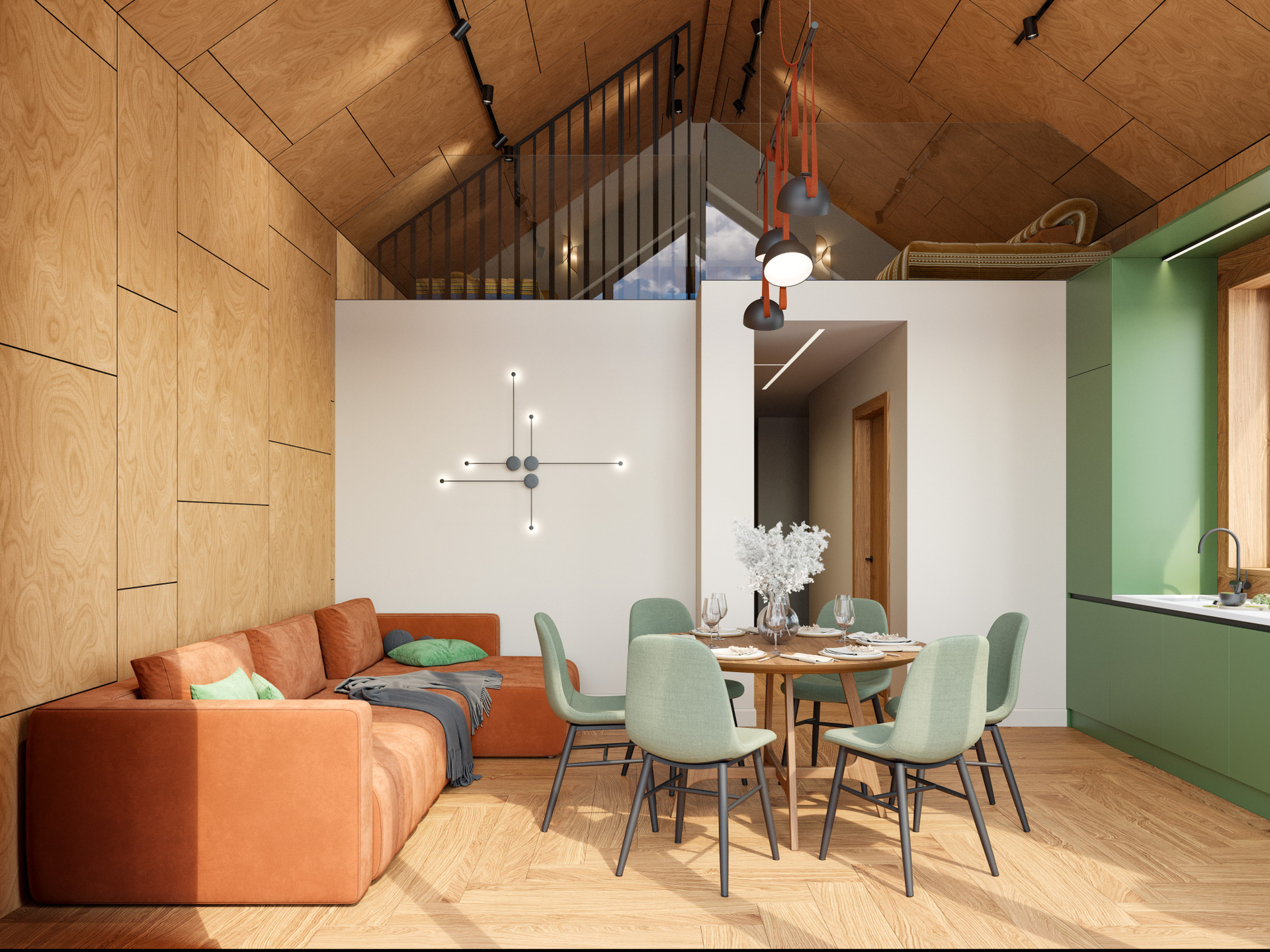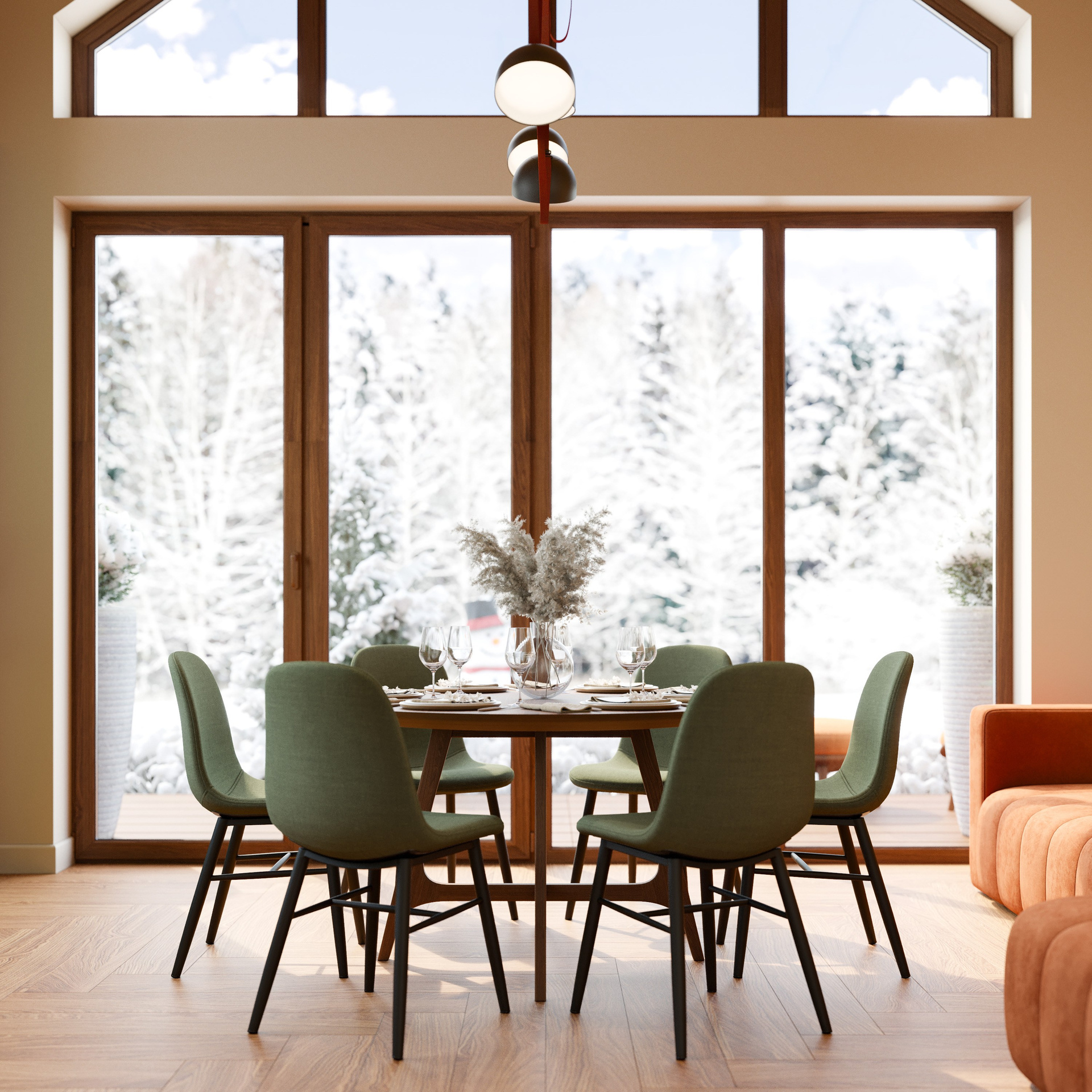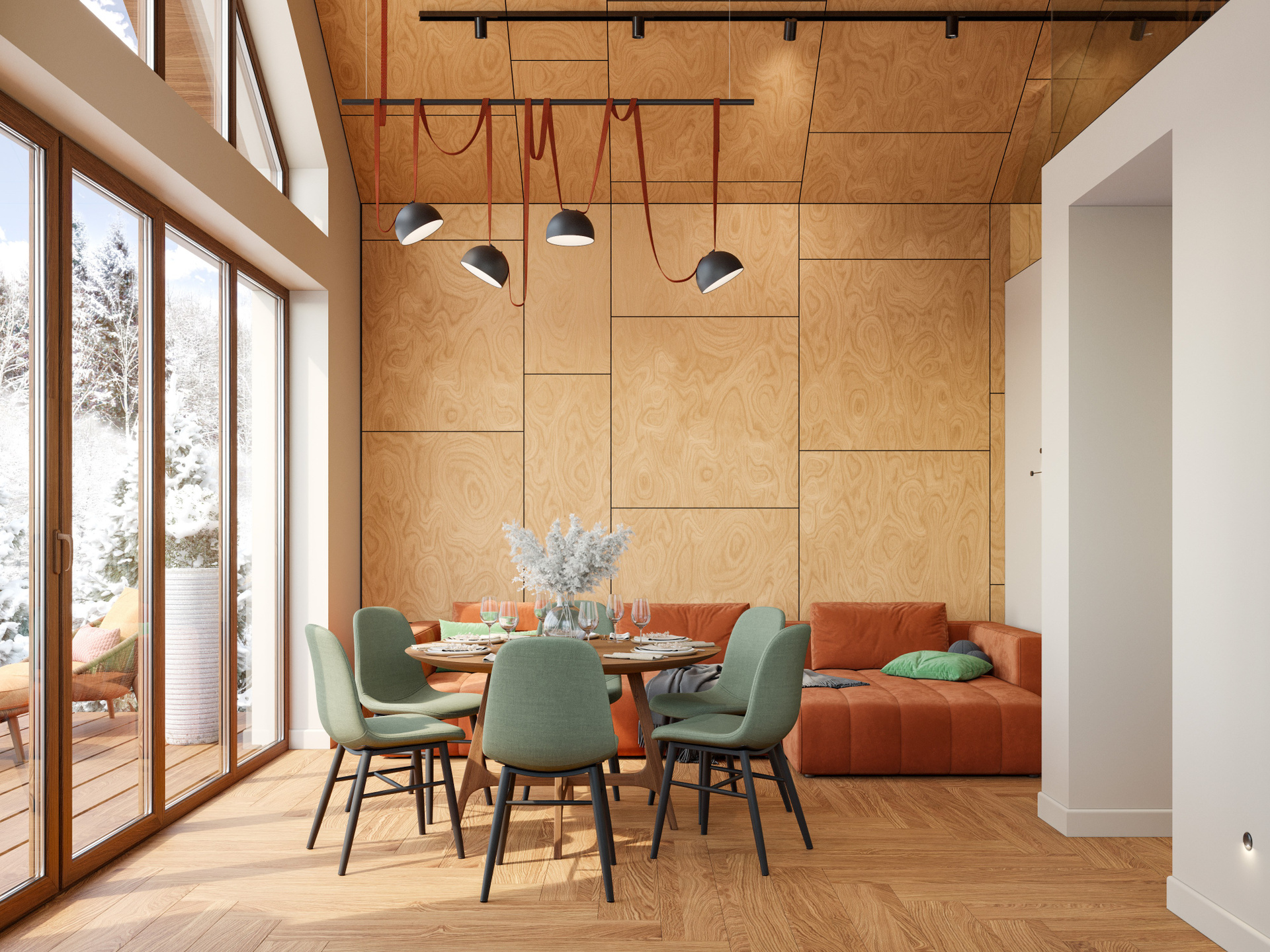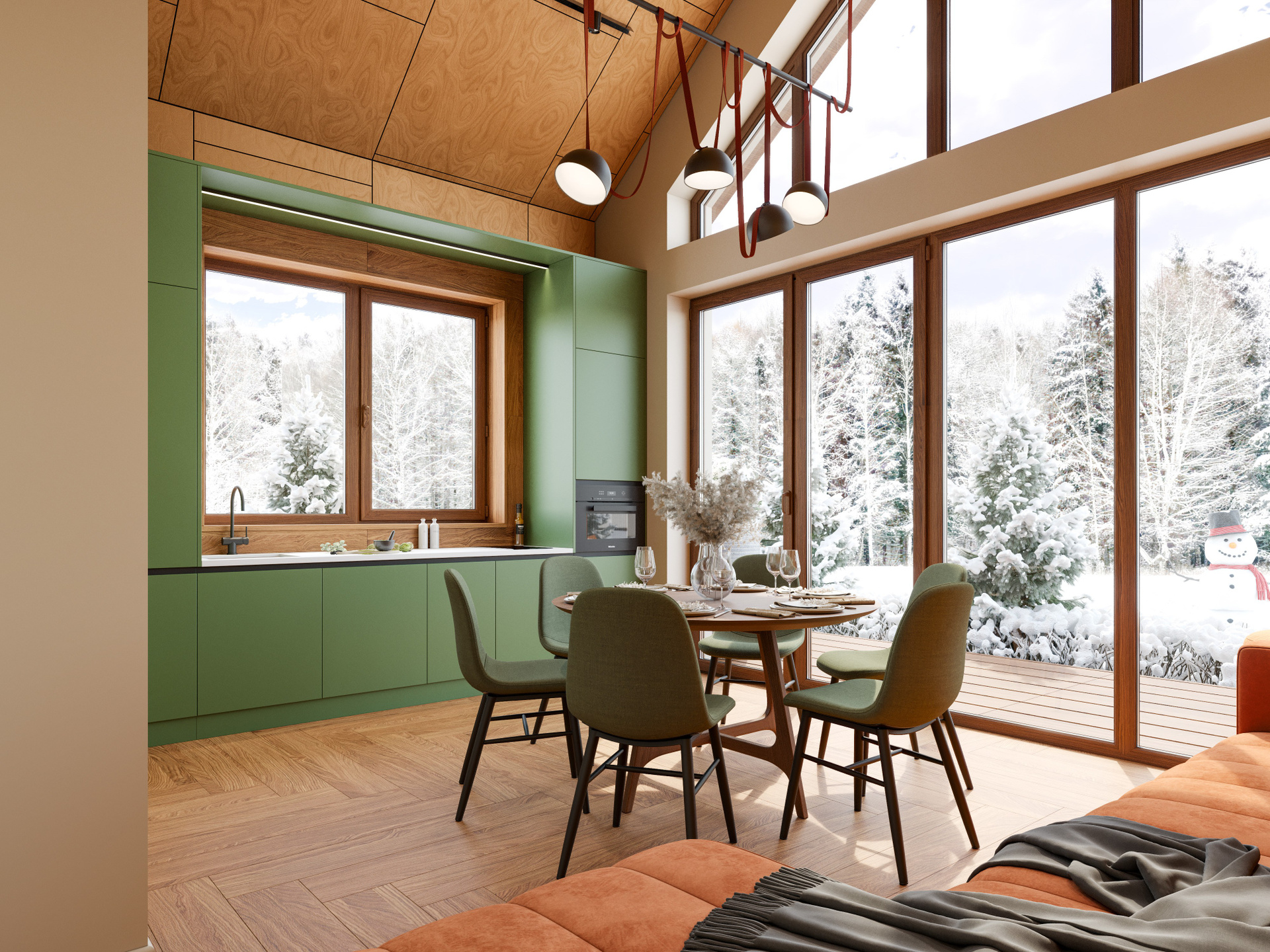 Основное пространство включает кухню, обеденную зону и гостиную, объединённые в единый уютный объём. Панорамные окна открывают вид на природу, делая интерьер визуально просторным и наполненным воздухом. Центральным элементом гостиной становится терракотовый диван — он вносит цветовой акцент и добавляет эмоционального тепла. В обеденной зоне внимание привлекает круглый деревянный стол с мягкими зелёными креслами. Композиция построена так, чтобы создать непринуждённую семейную атмосферу, что особенно хорошо передаёт визуализация дизайна интерьера.